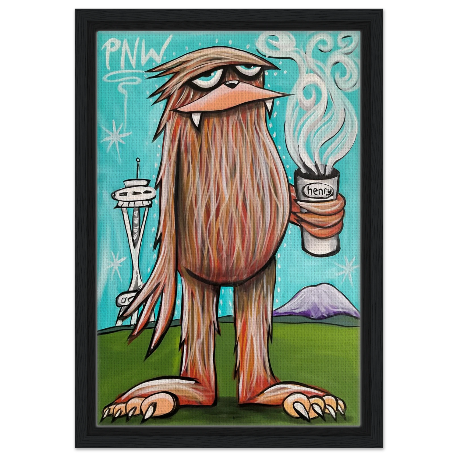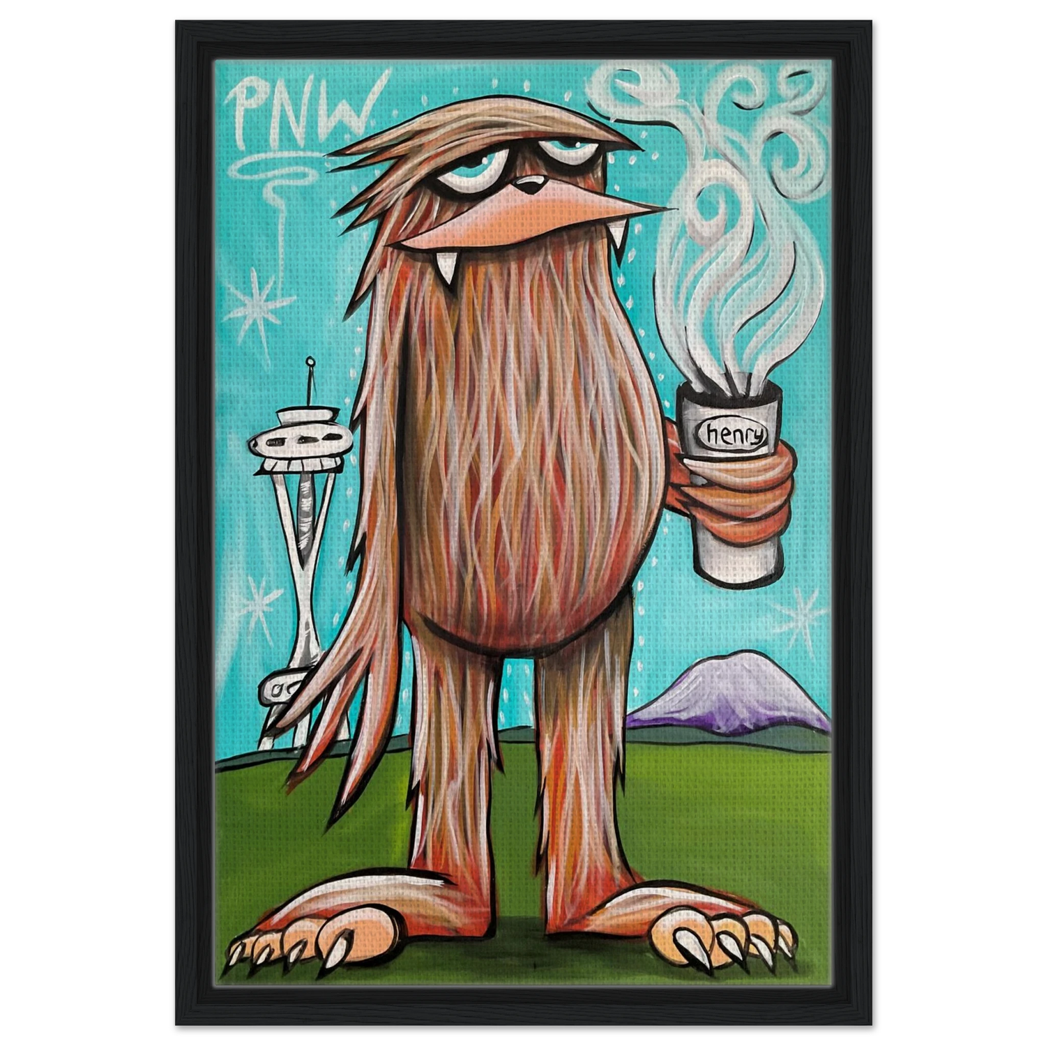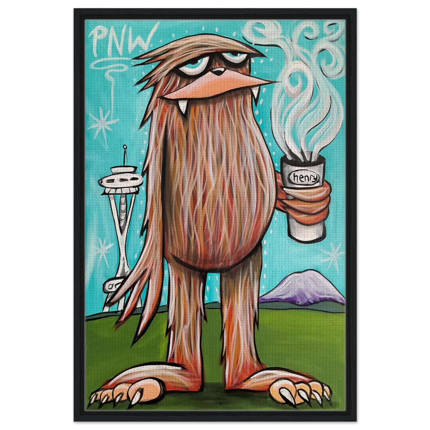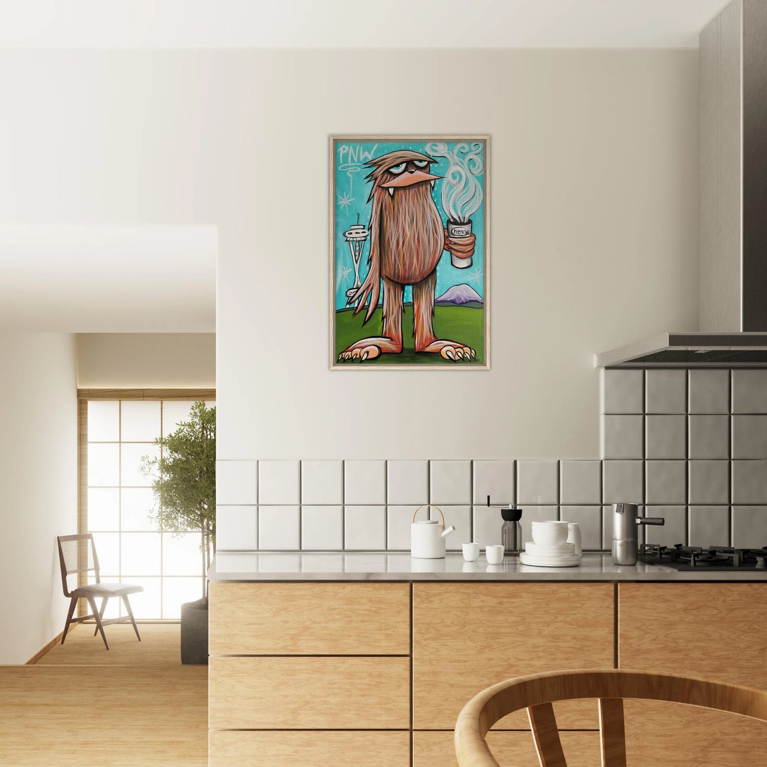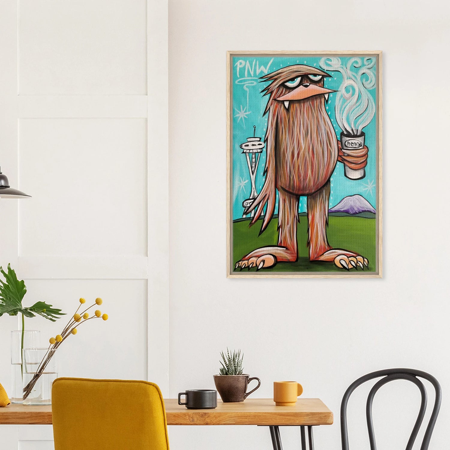 Sasquatch with Coffee in Seattle - Framed Canvas Print - is backordered and will ship as soon as it is back in stock.