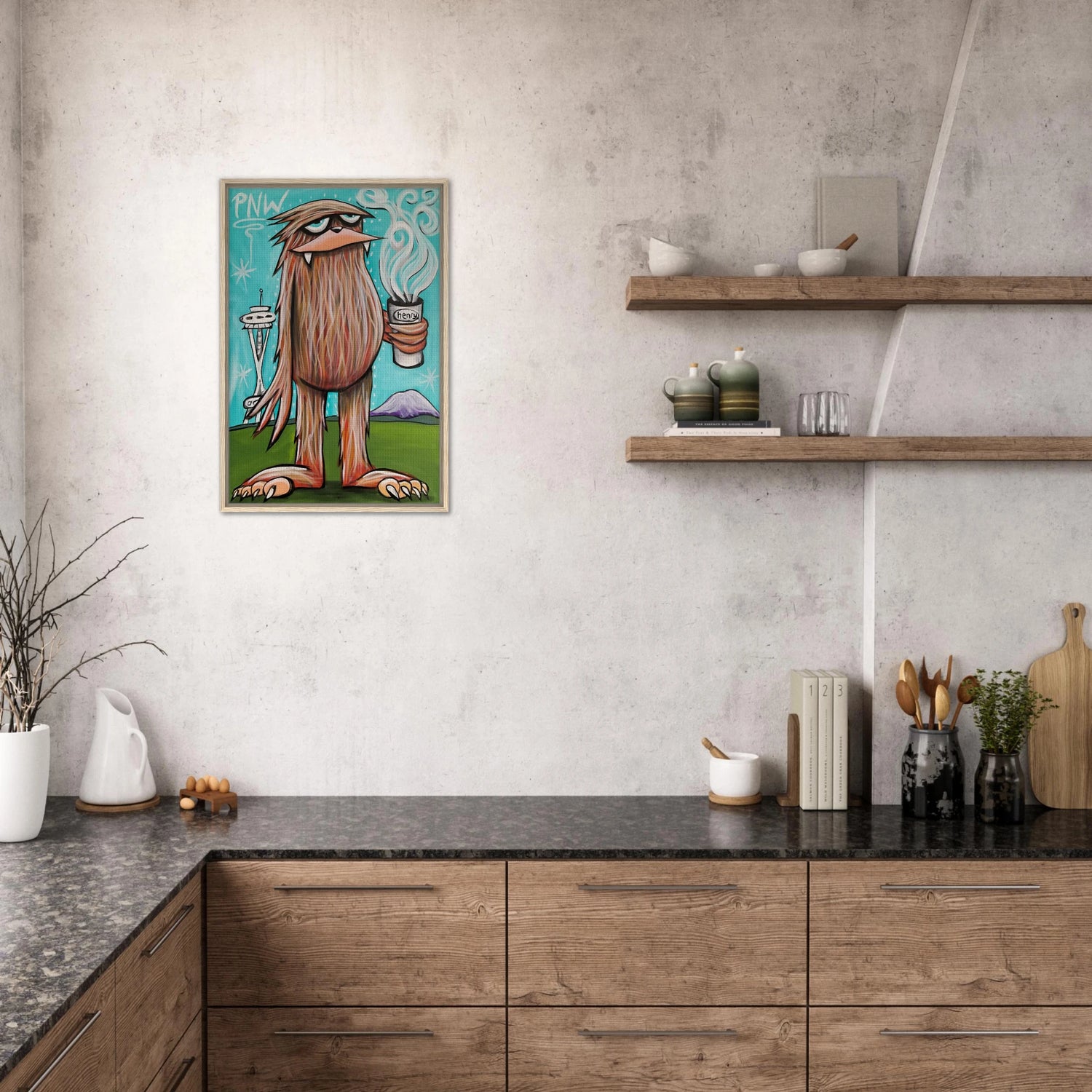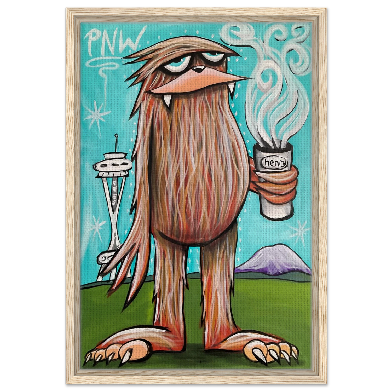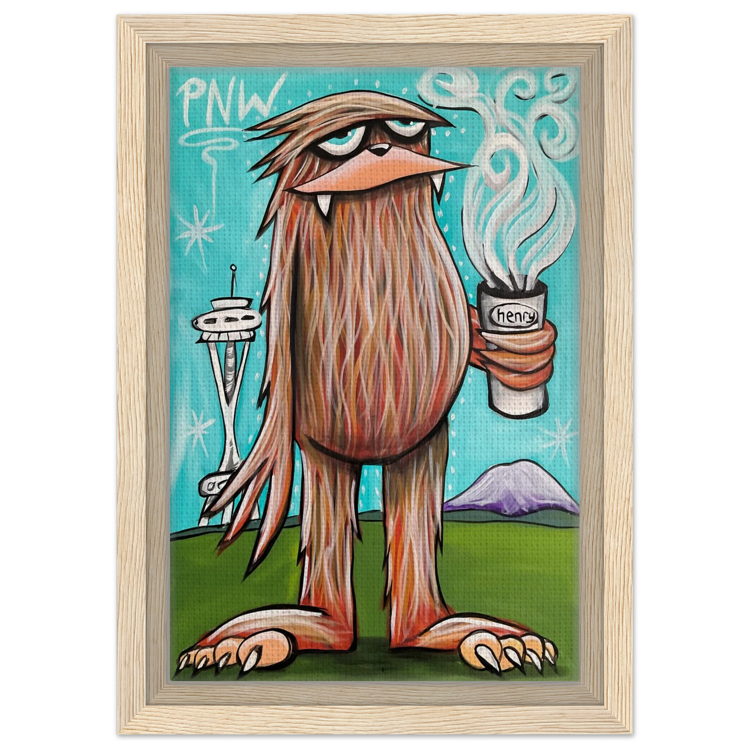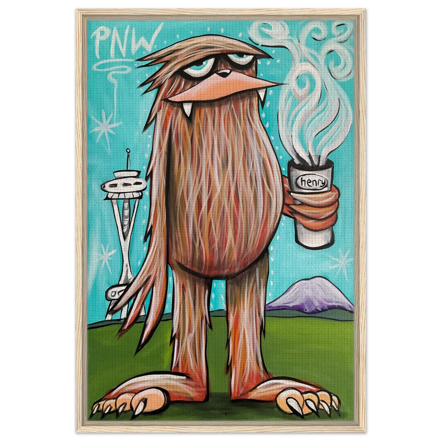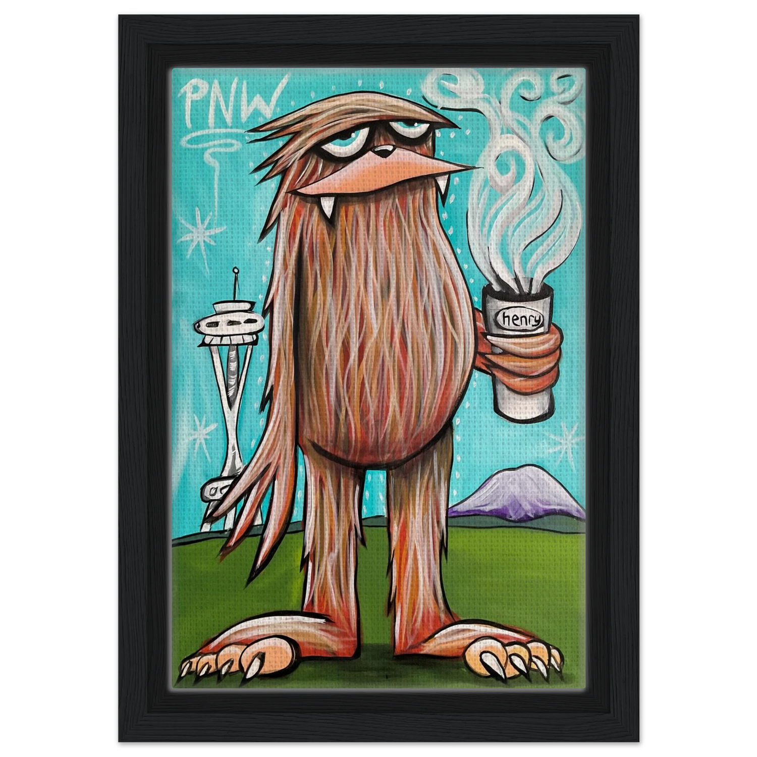 Sasquatch with Coffee in Seattle - Framed Canvas Print - is backordered and will ship as soon as it is back in stock.