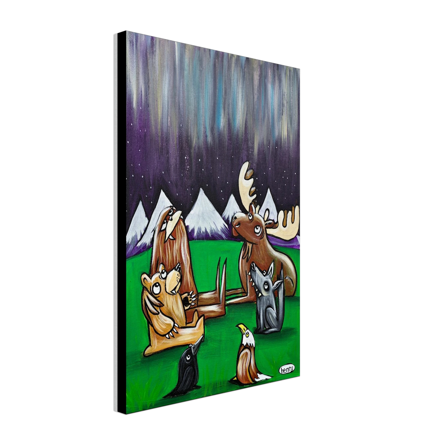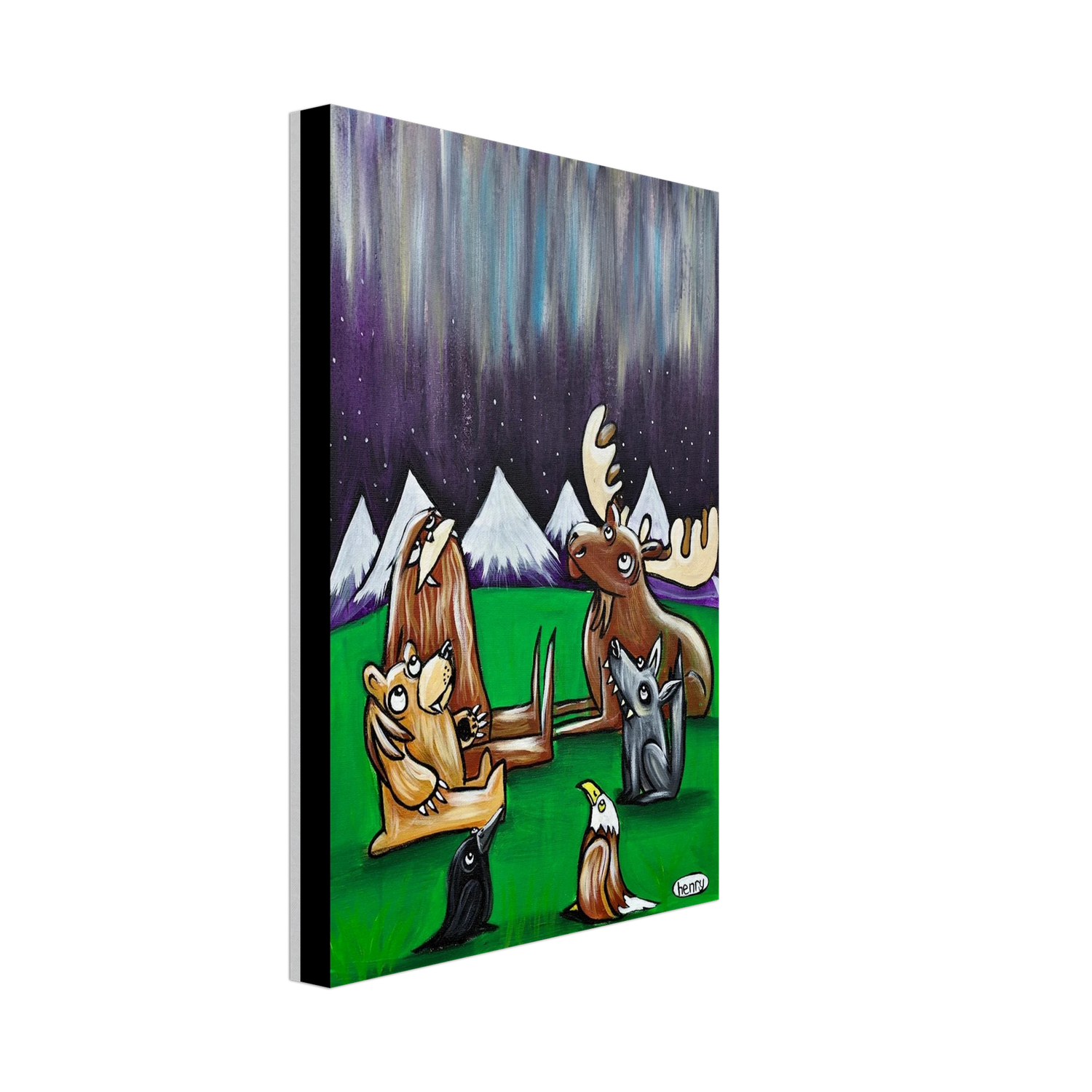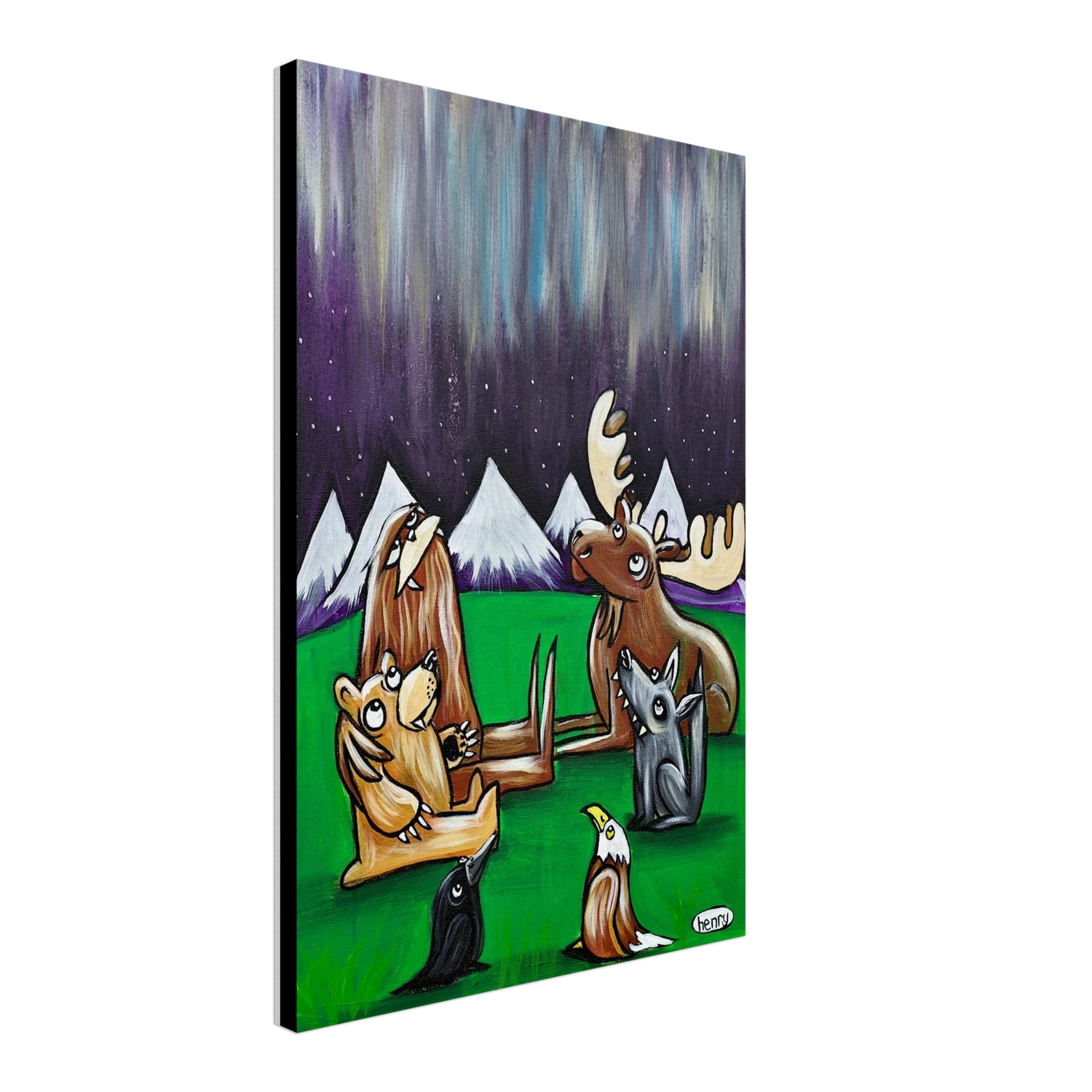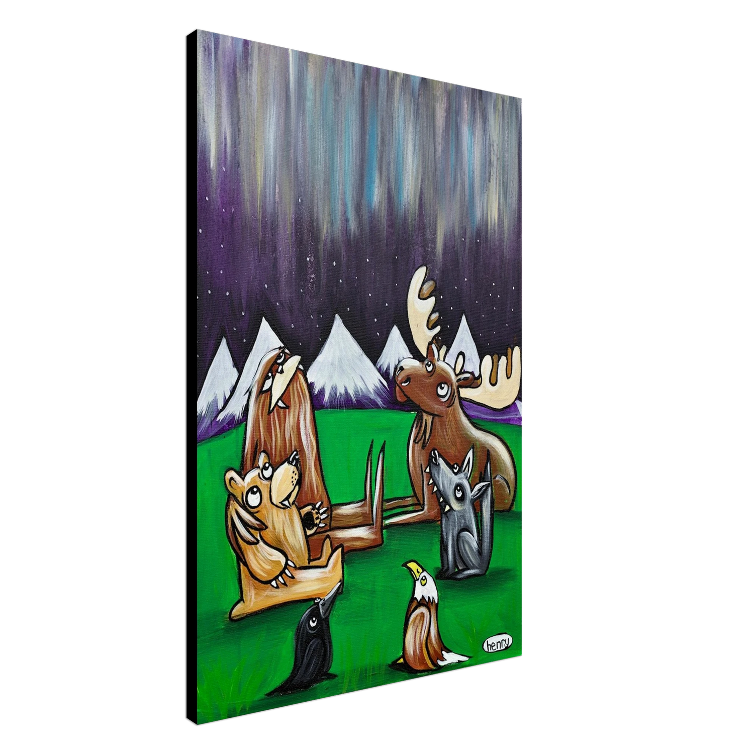 Henry's Northern Lights painting captures this awesome moment between friends in the woods at night.