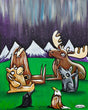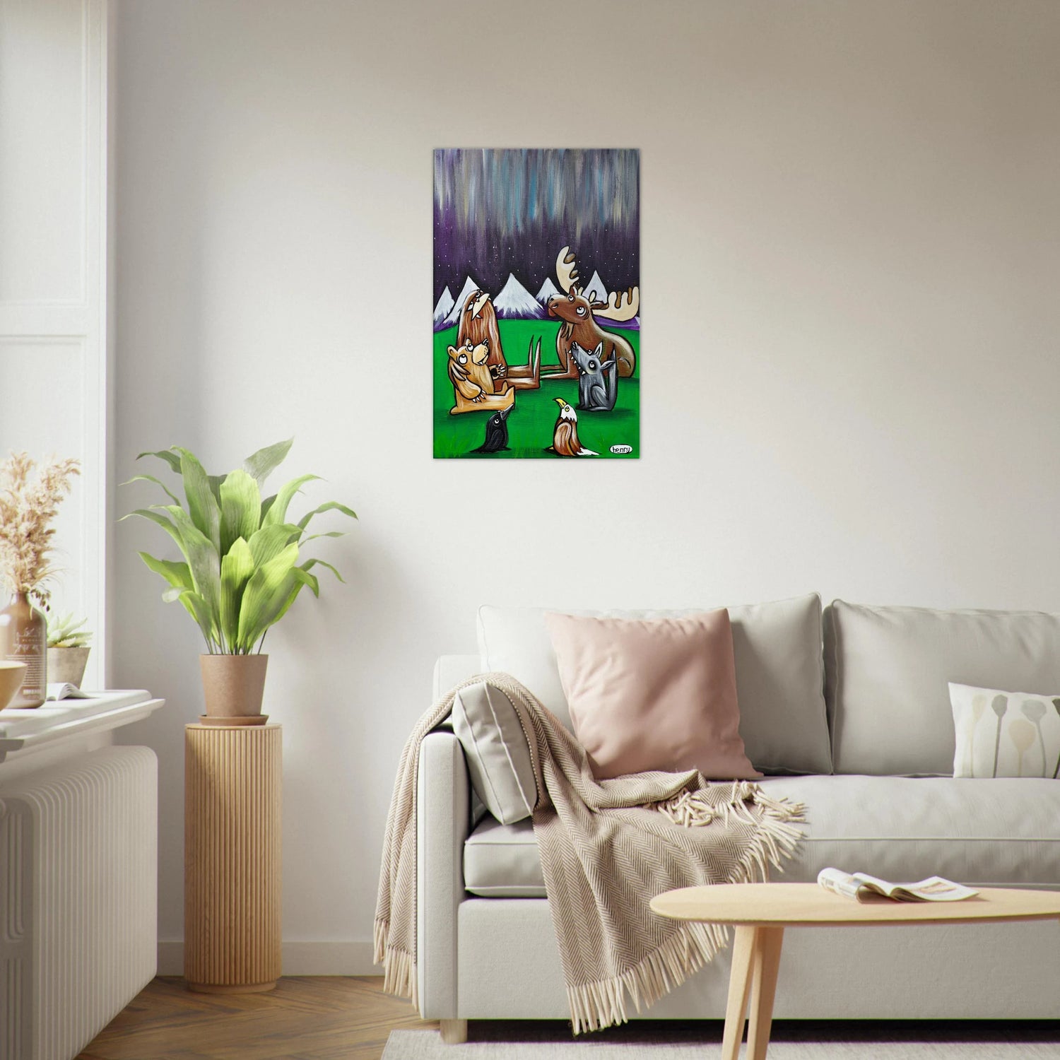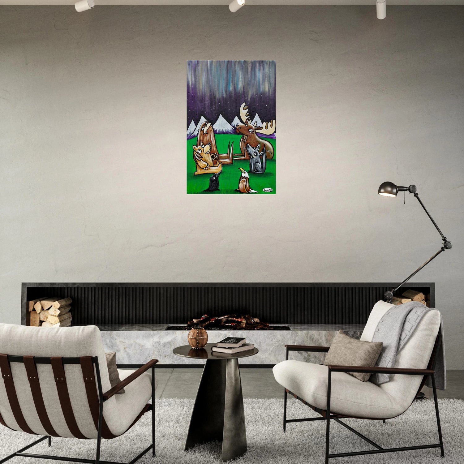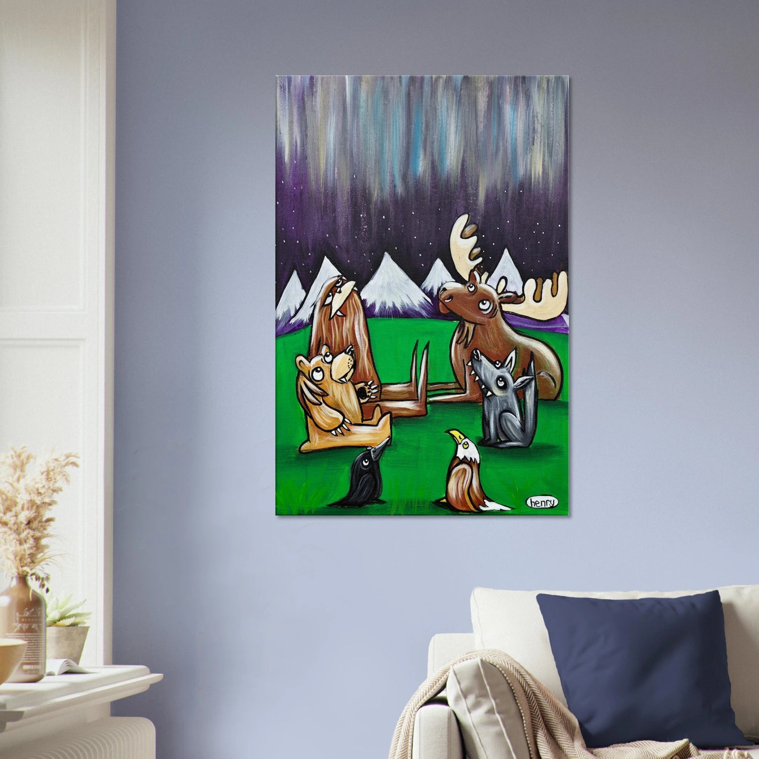 Henry's Northern Lights painting captures this awesome moment between friends in the woods at night.