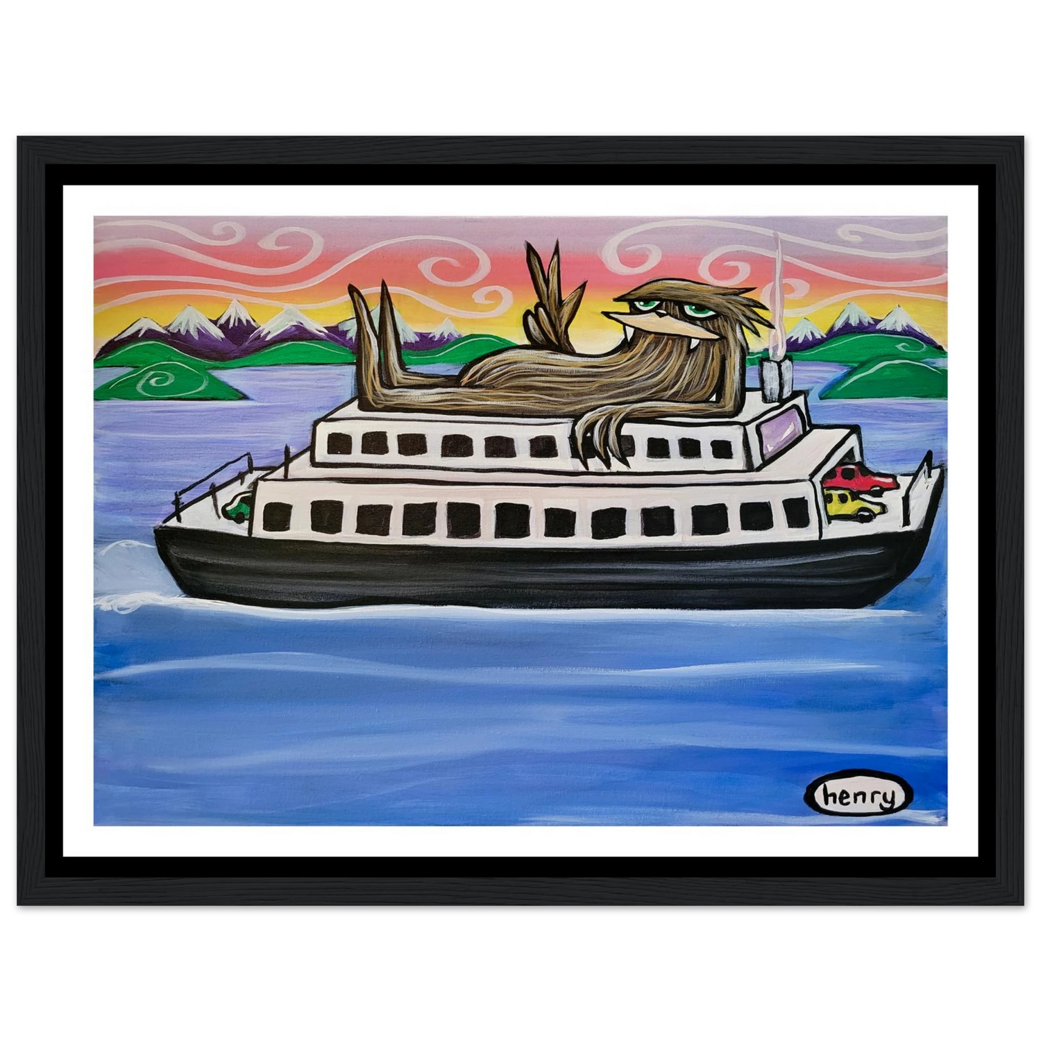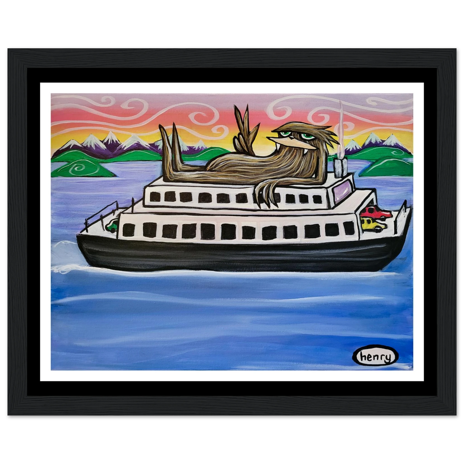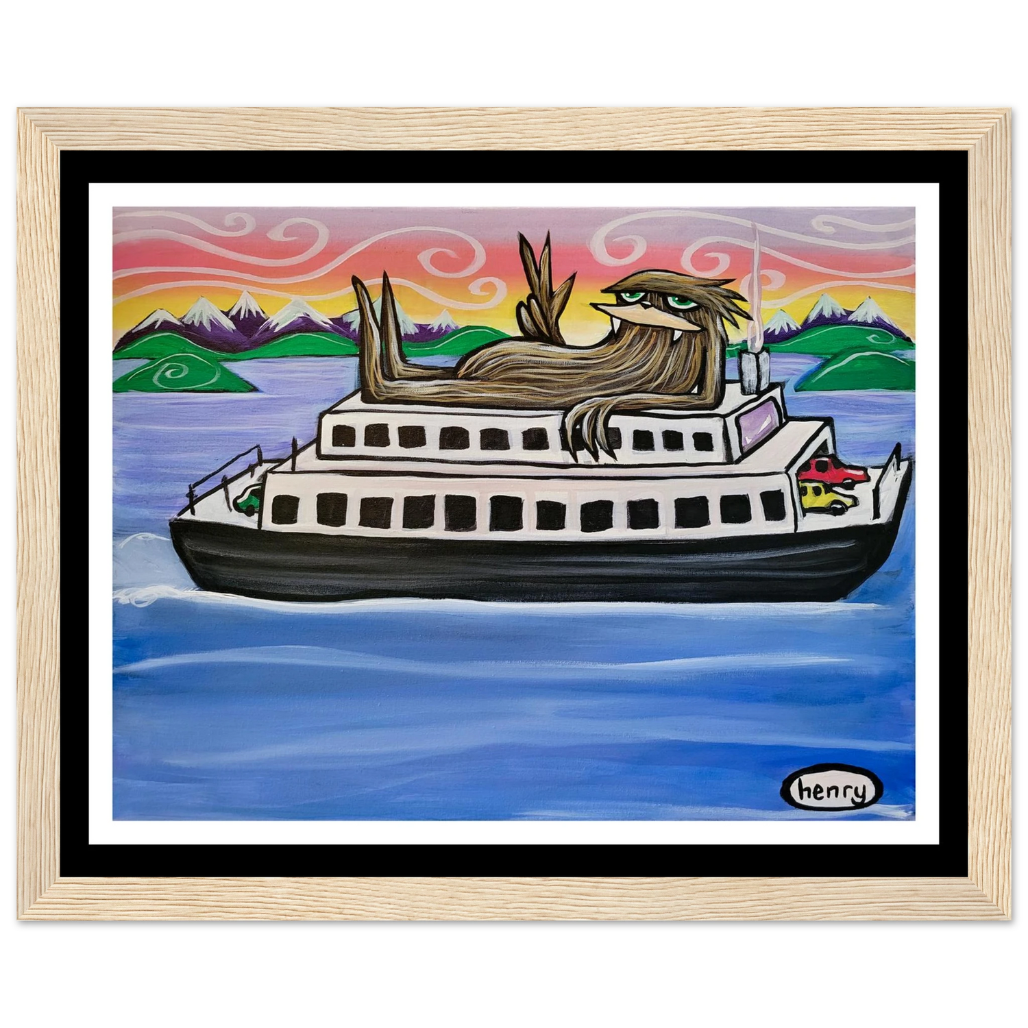 Sasquatch Riding on a Ferry - Mounted Framed Poster - is backordered and will ship as soon as it is back in stock.