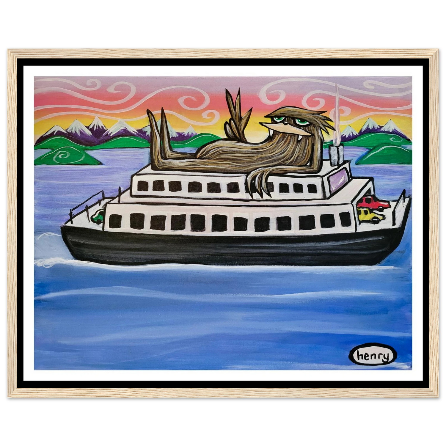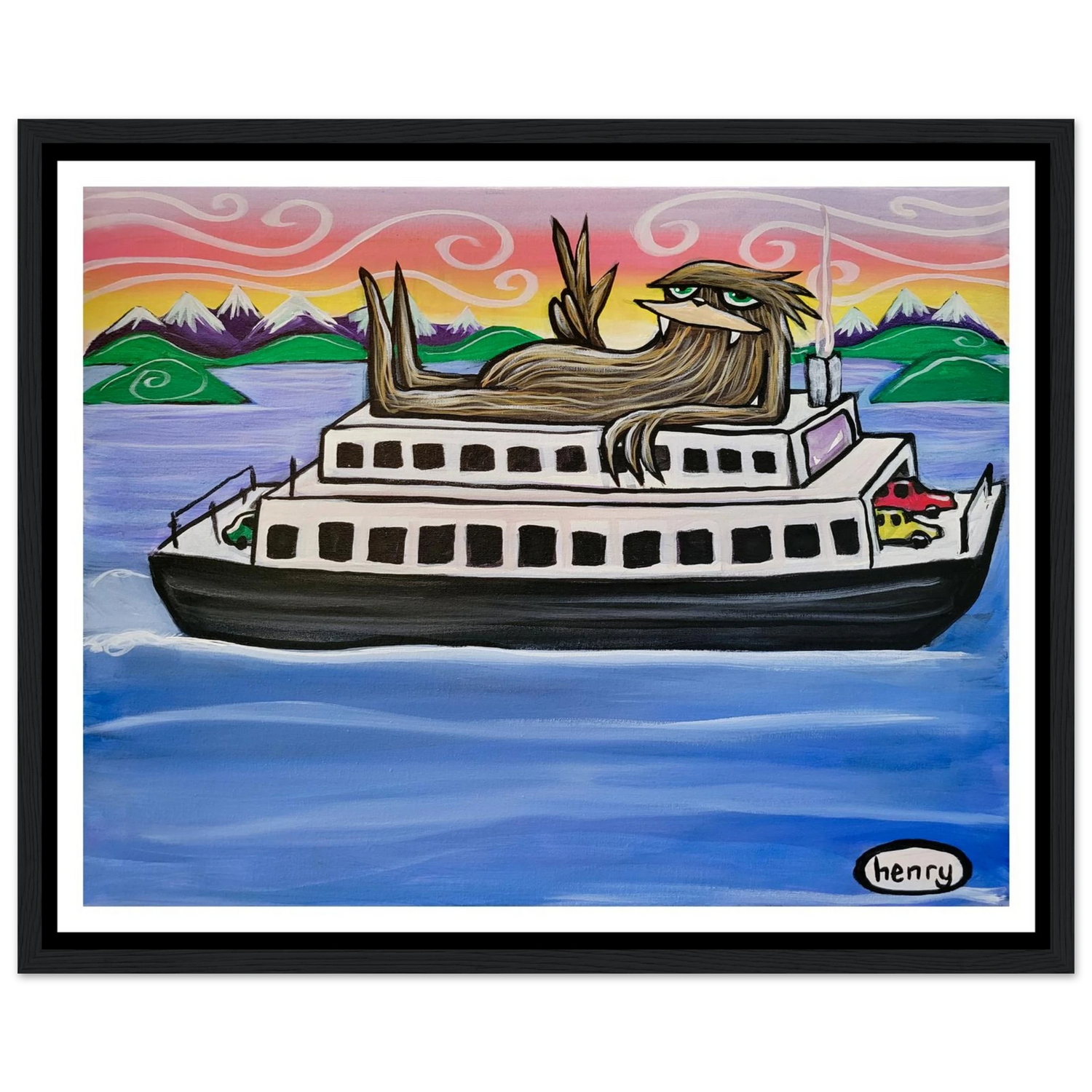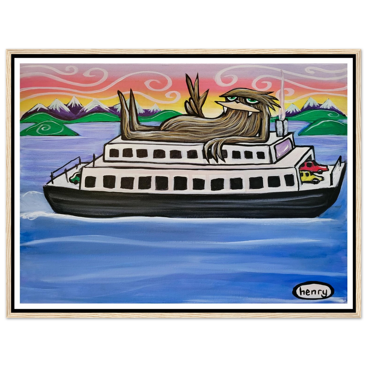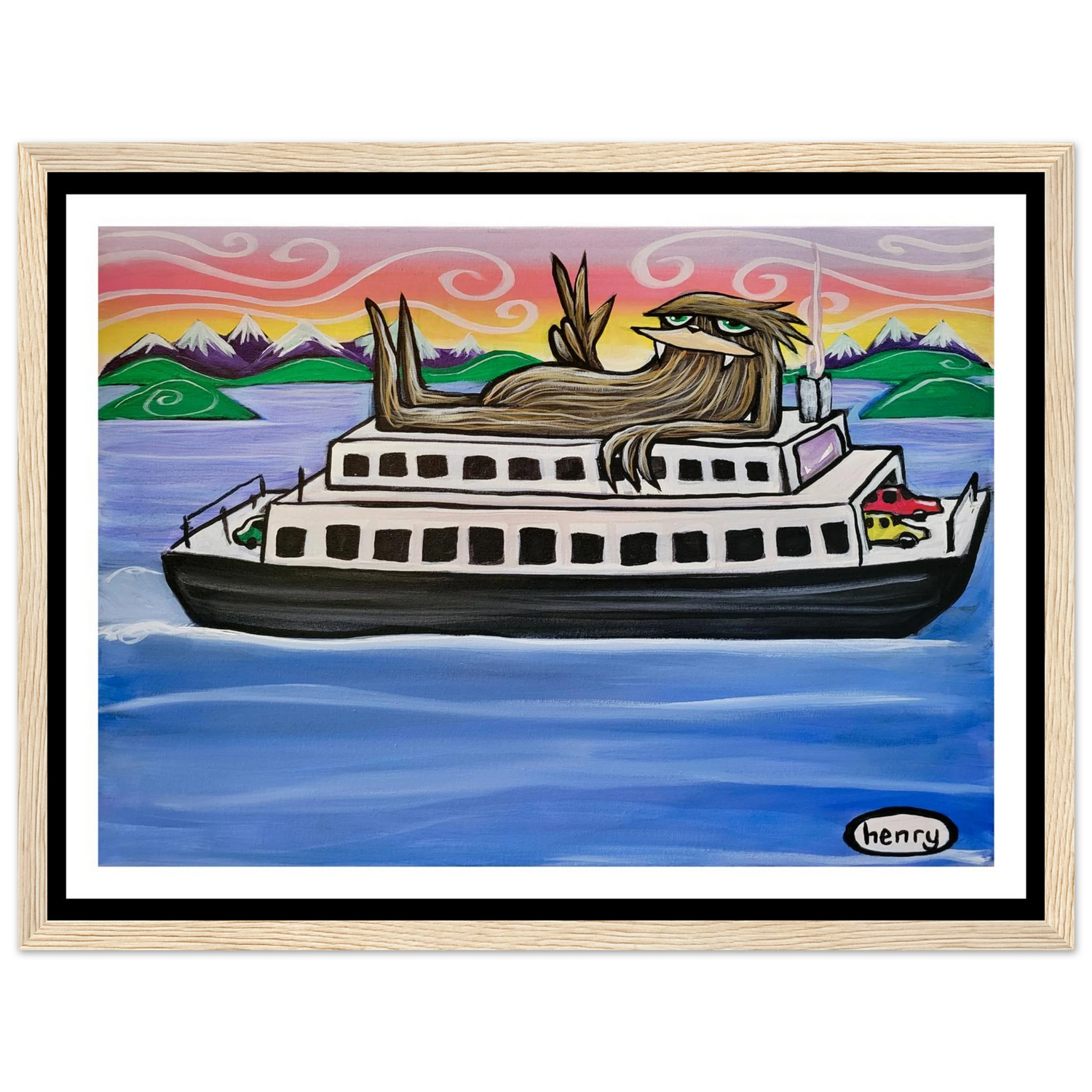 Sasquatch Riding on a Ferry - Mounted Framed Poster - is backordered and will ship as soon as it is back in stock.