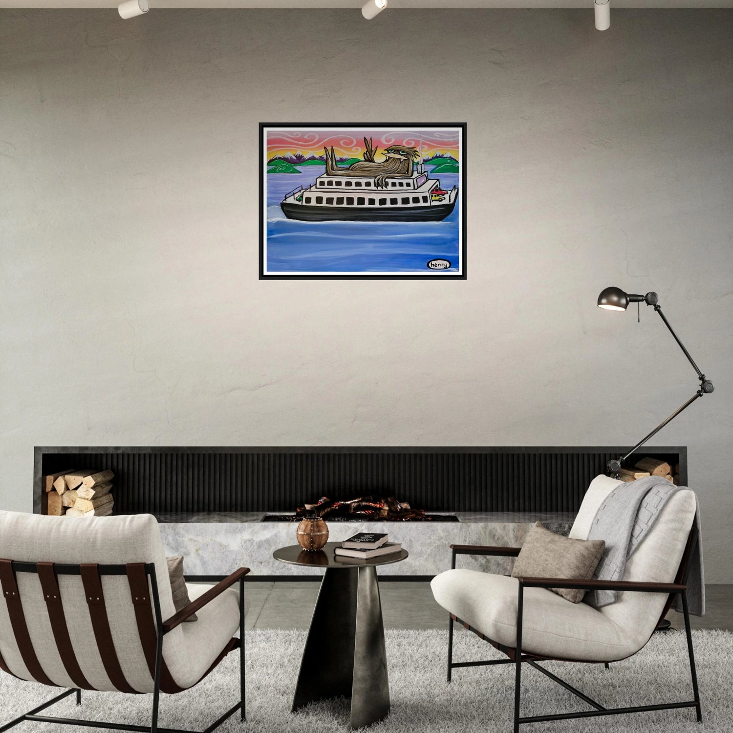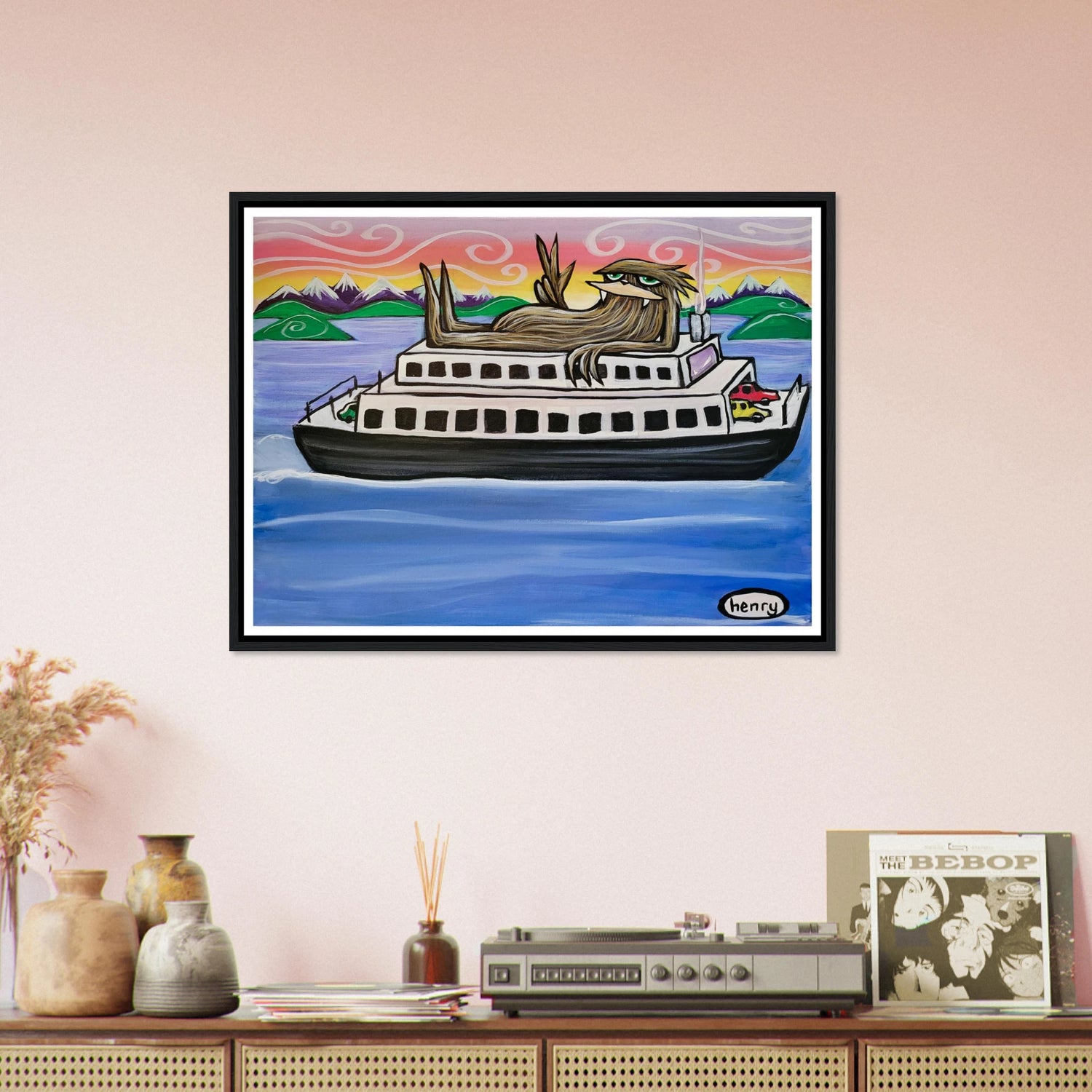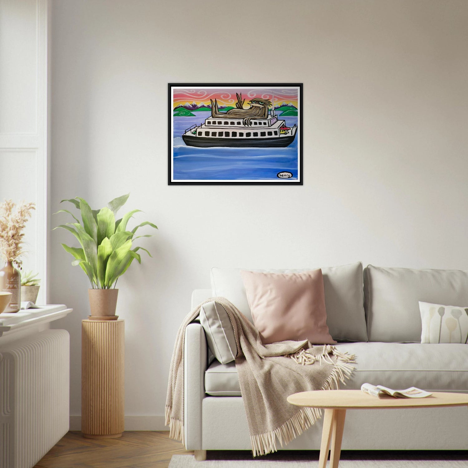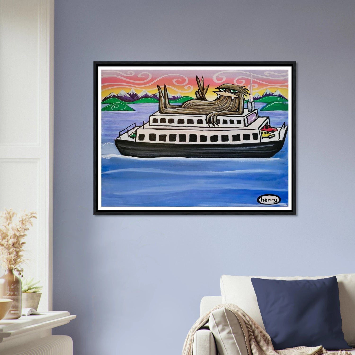 Elevate your space with our captivating Sasquatch Riding on a Ferry mounted framed poster—a unique artwork that adds a touch of whimsy and intrigue to any room.