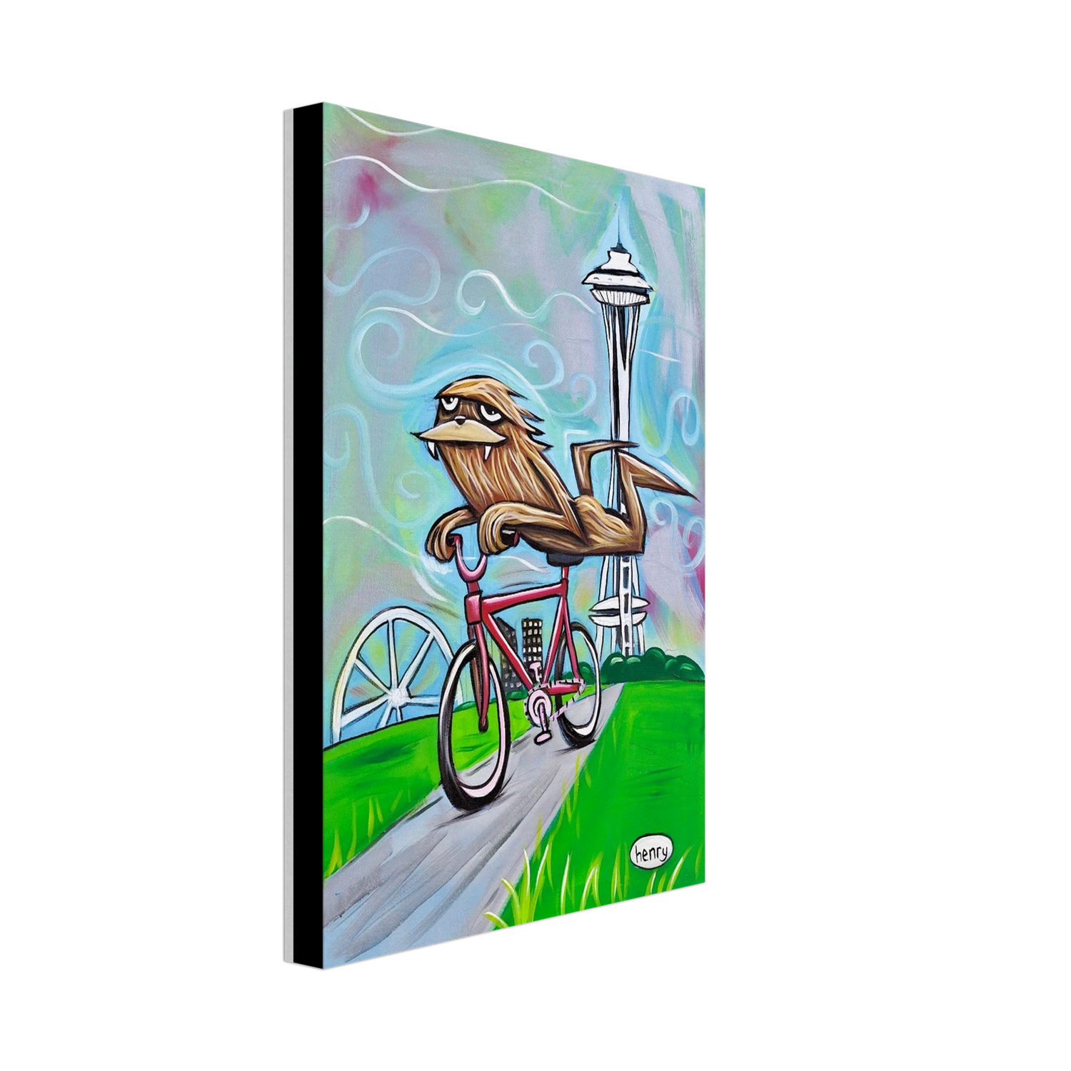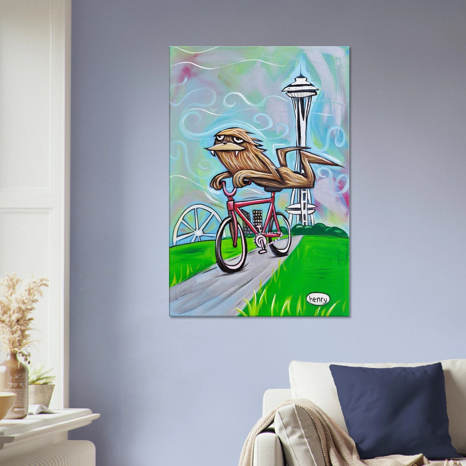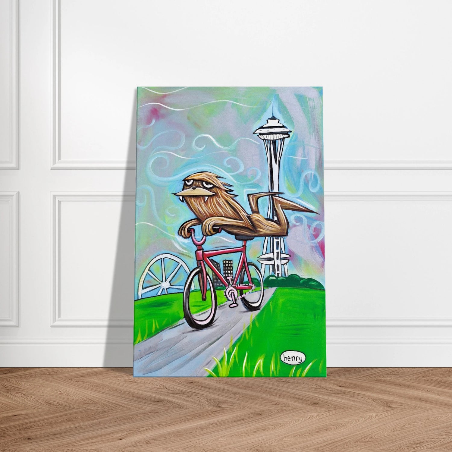 Sasquatch Riding a Bike in Seattle - Canvas Print