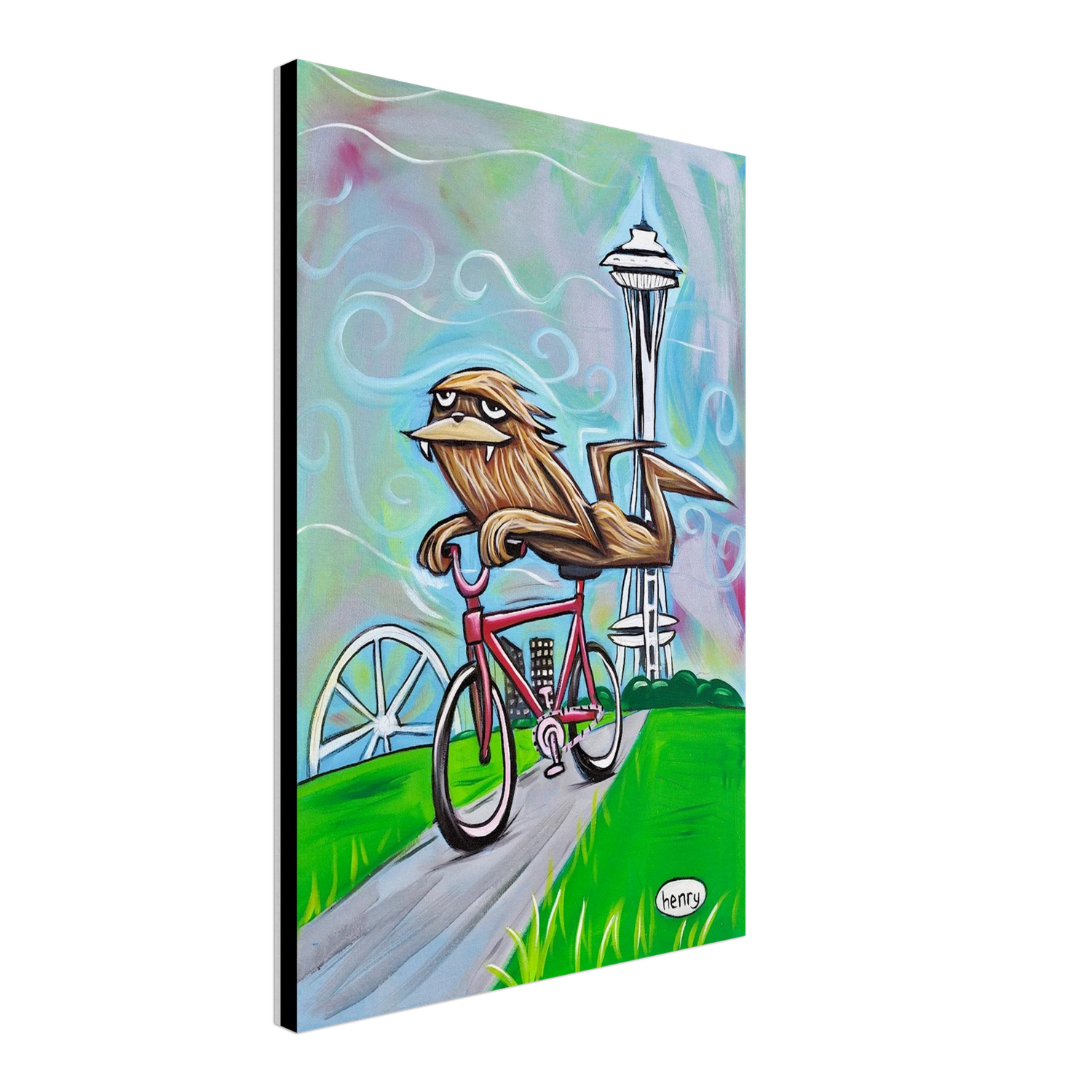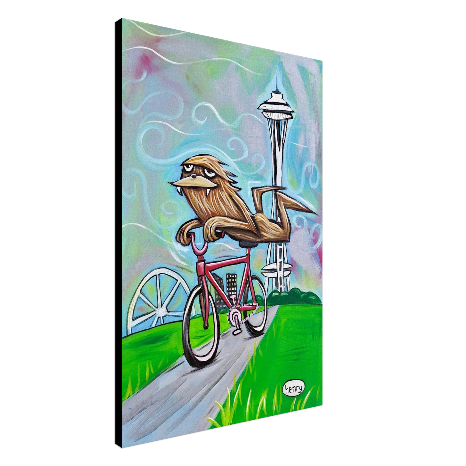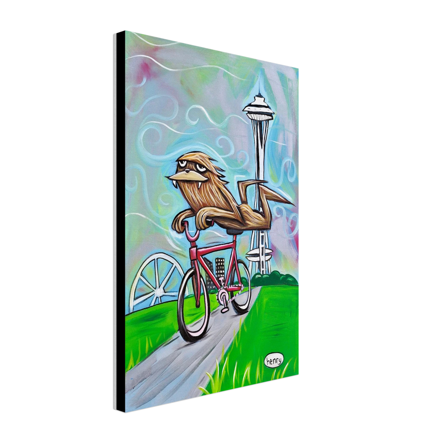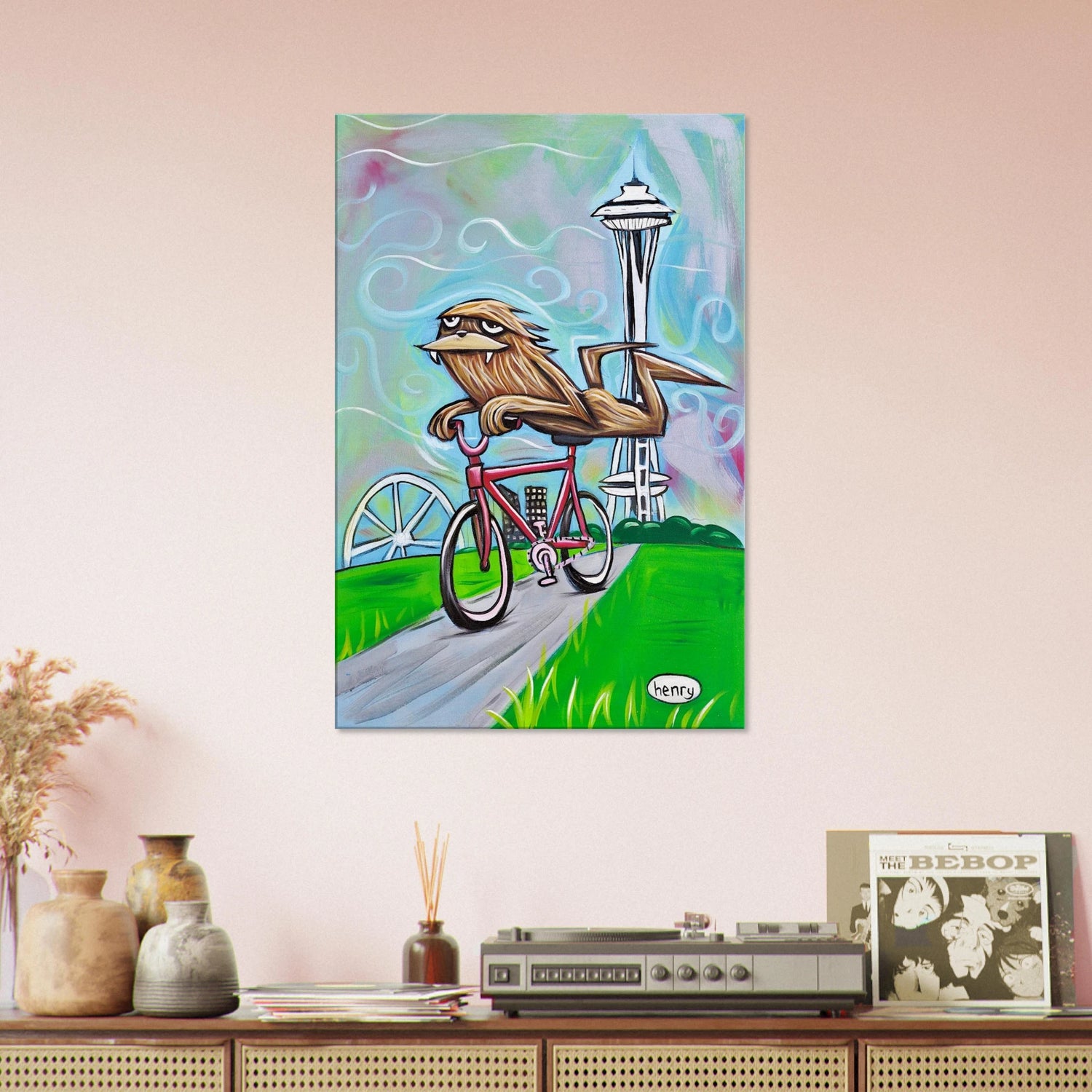 Sasquatch Riding a Bike in Seattle - Canvas Print