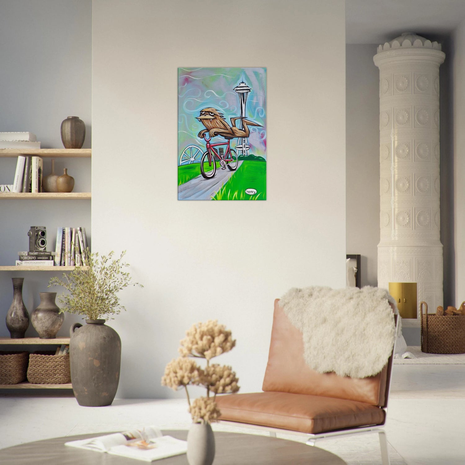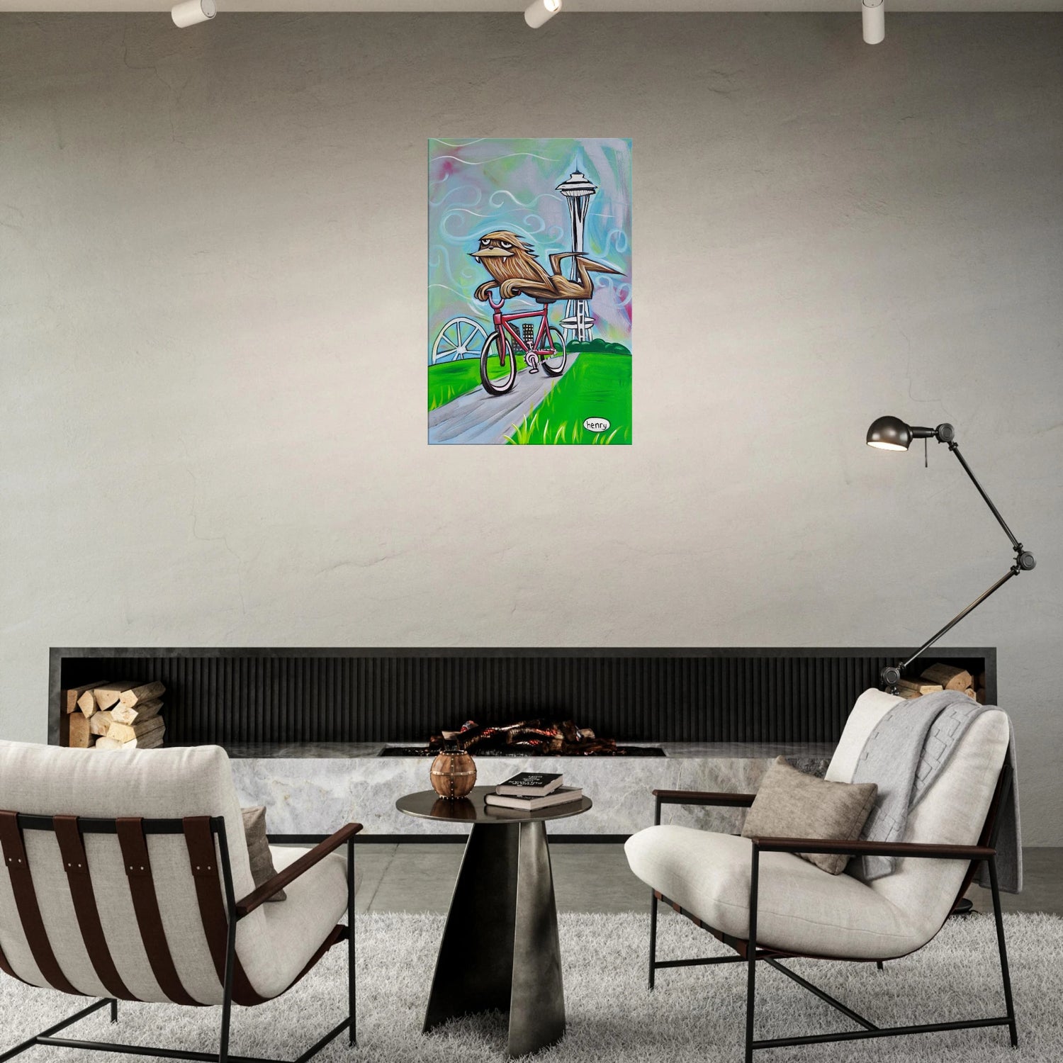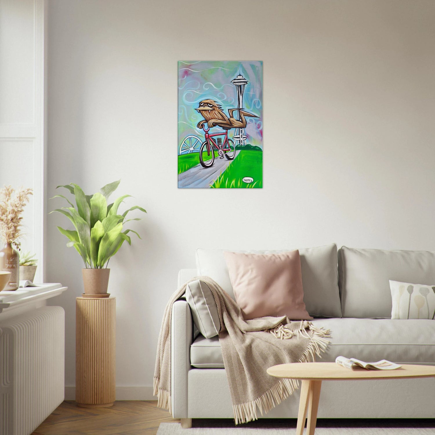 Bring a whimsical touch to your space with our unique canvas print featuring a Sasquatch riding a bike through the iconic streets of Seattle. This vibrant design combines humor and artistry, making it a conversation starter and a delightful addition to any room.