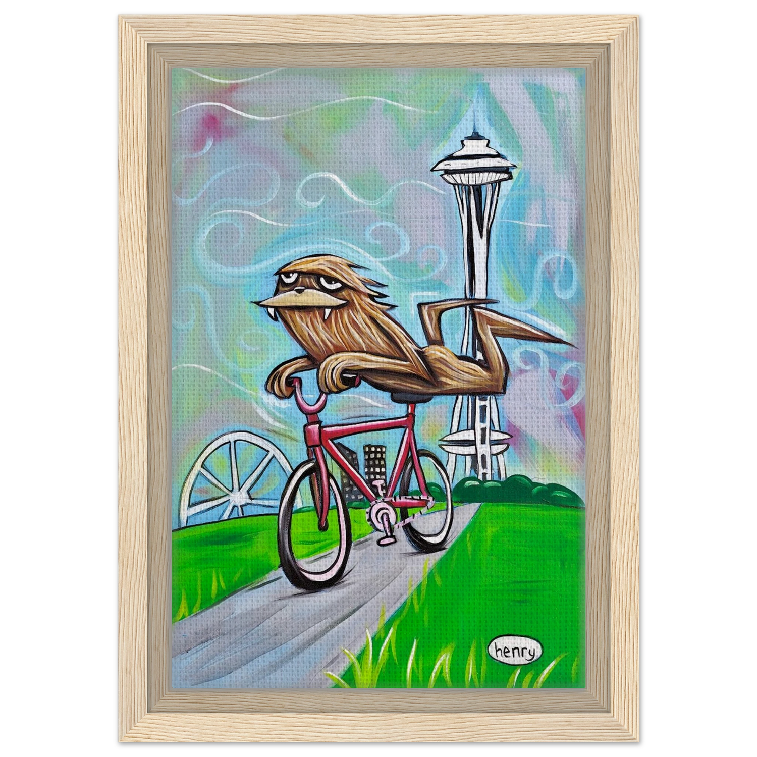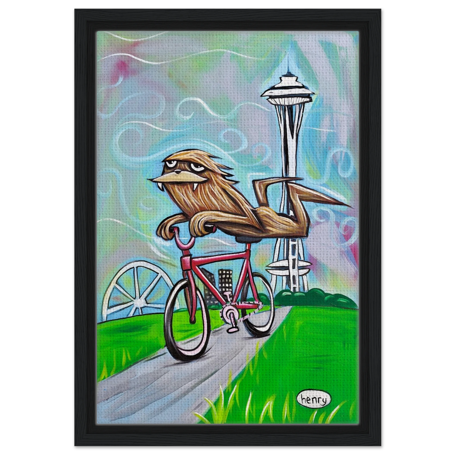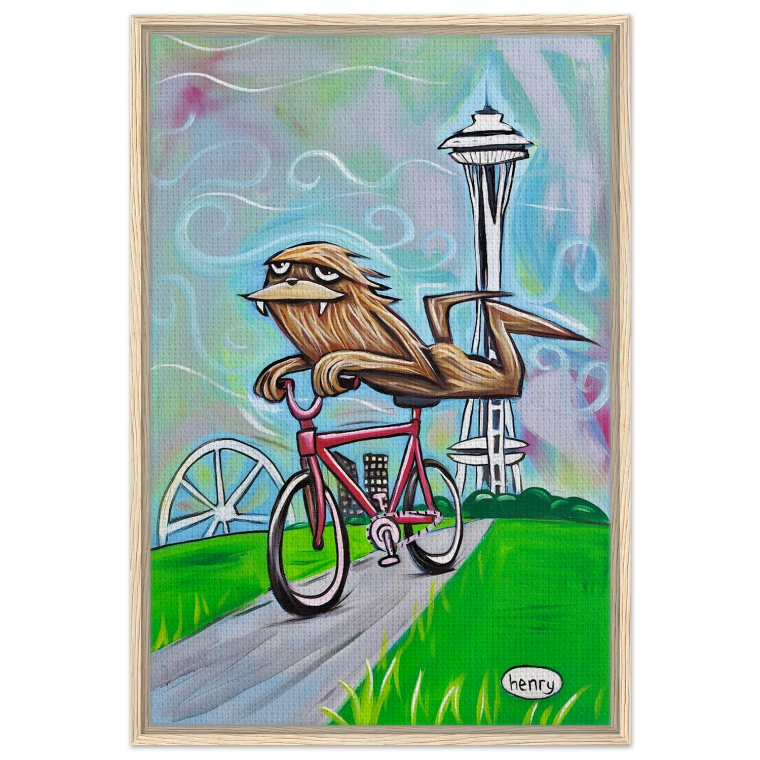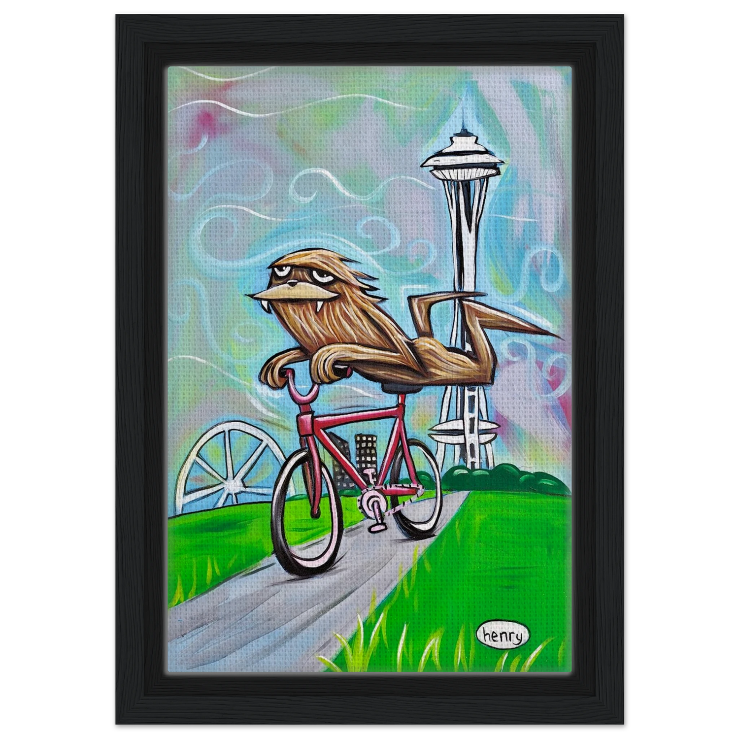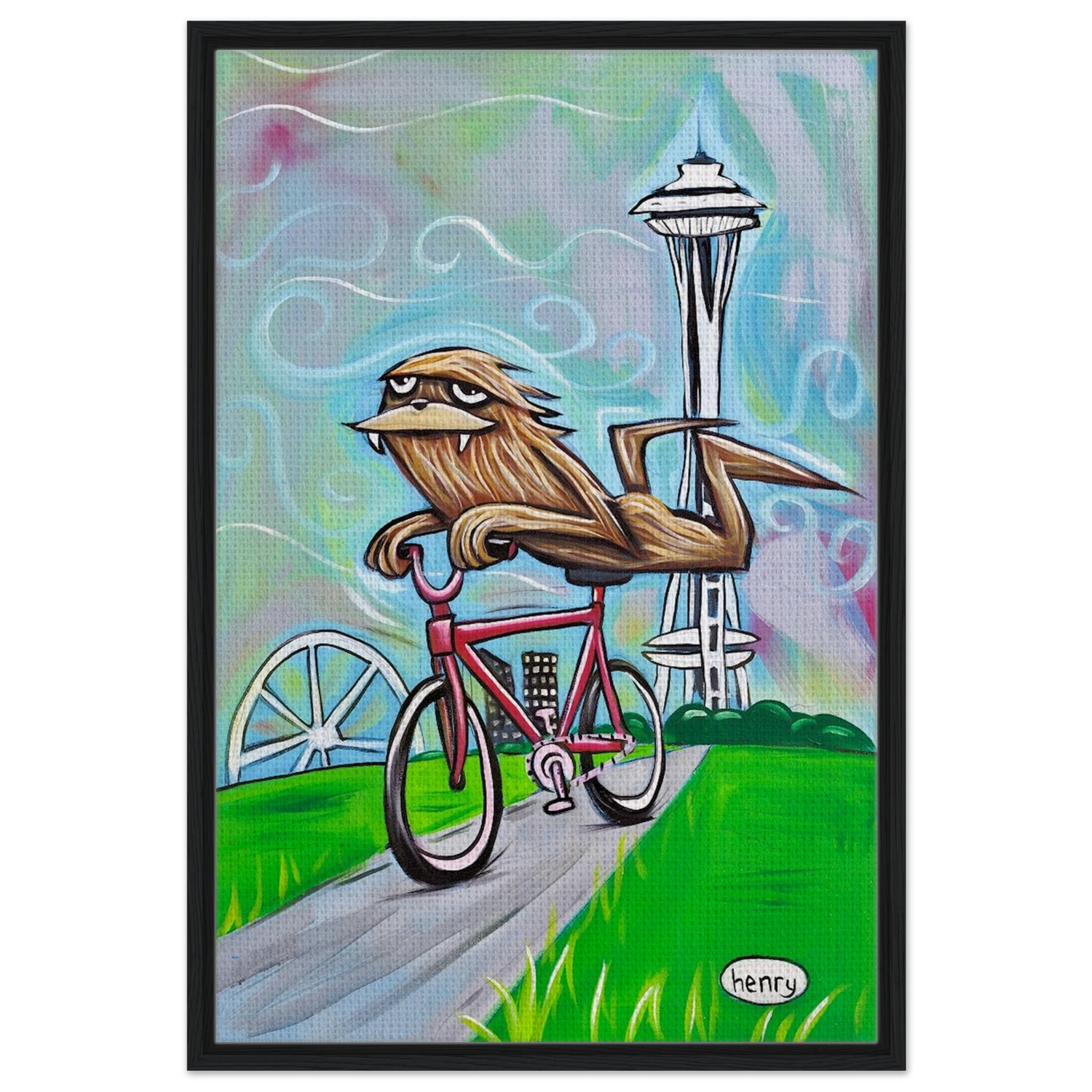 Sasquatch Riding a Bike in Seattle - Framed Canvas Print - is backordered and will ship as soon as it is back in stock.