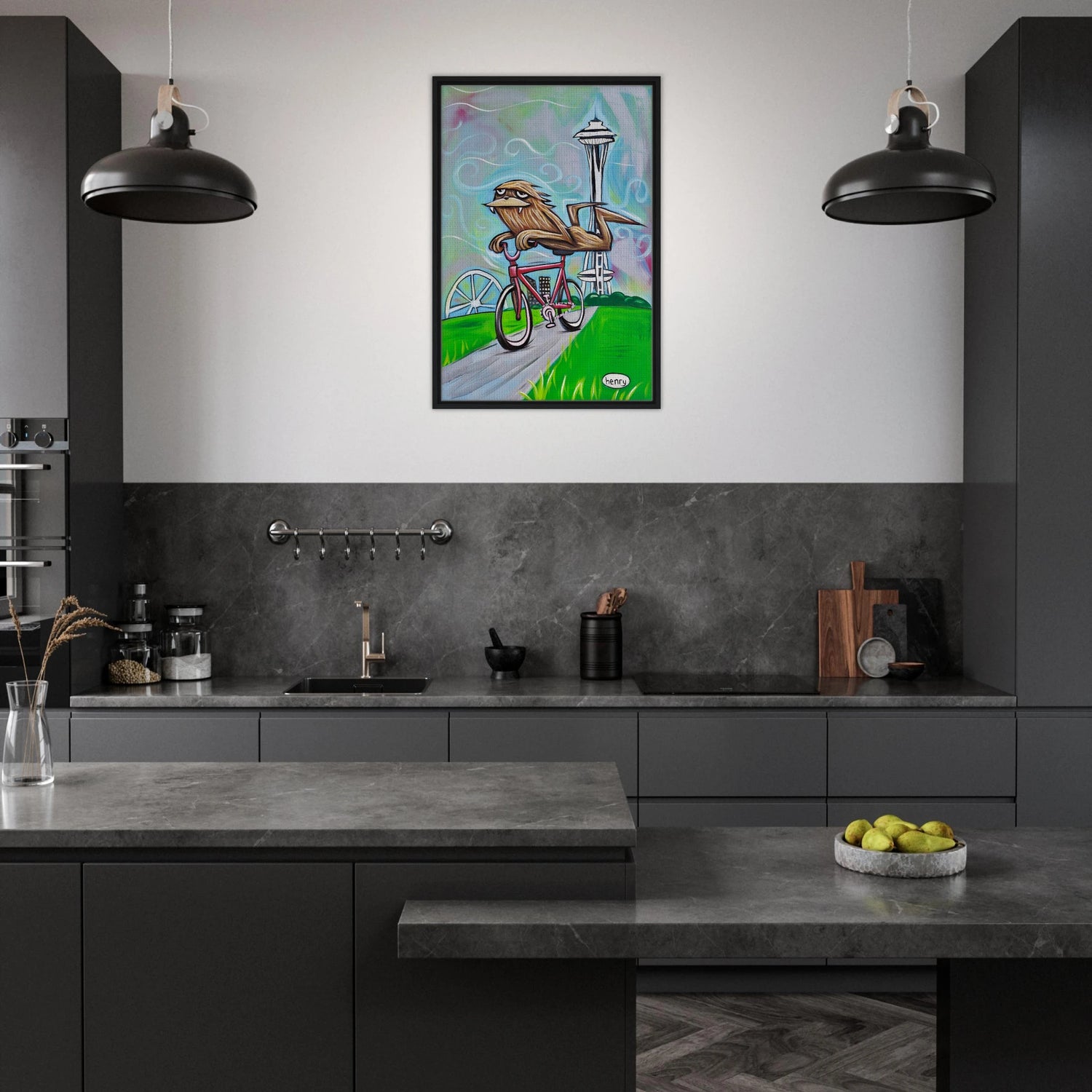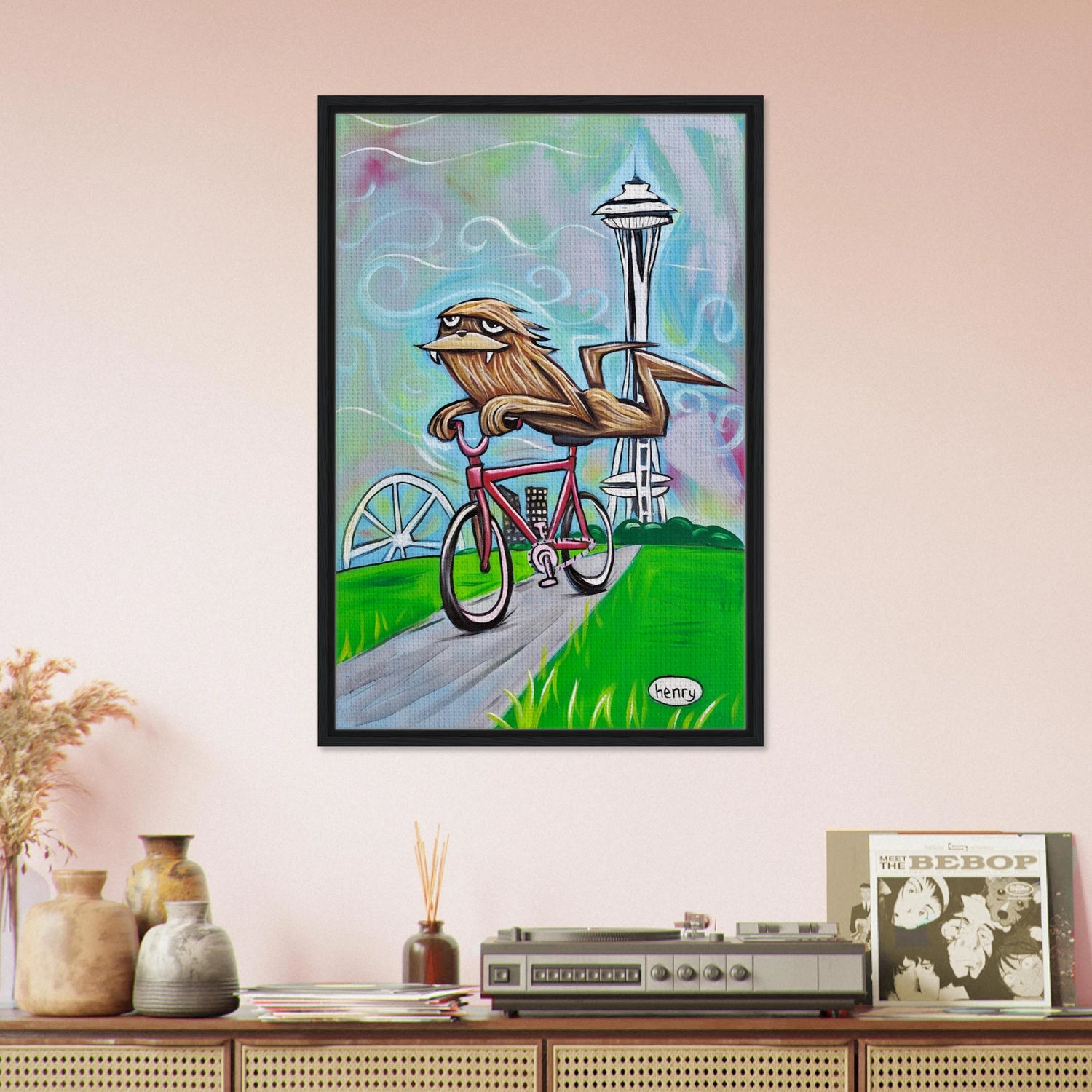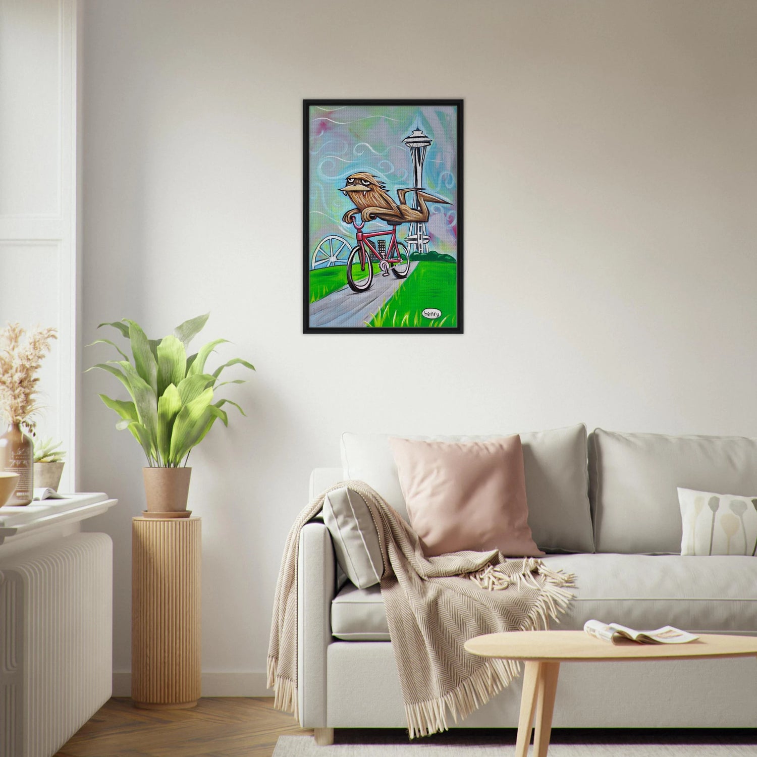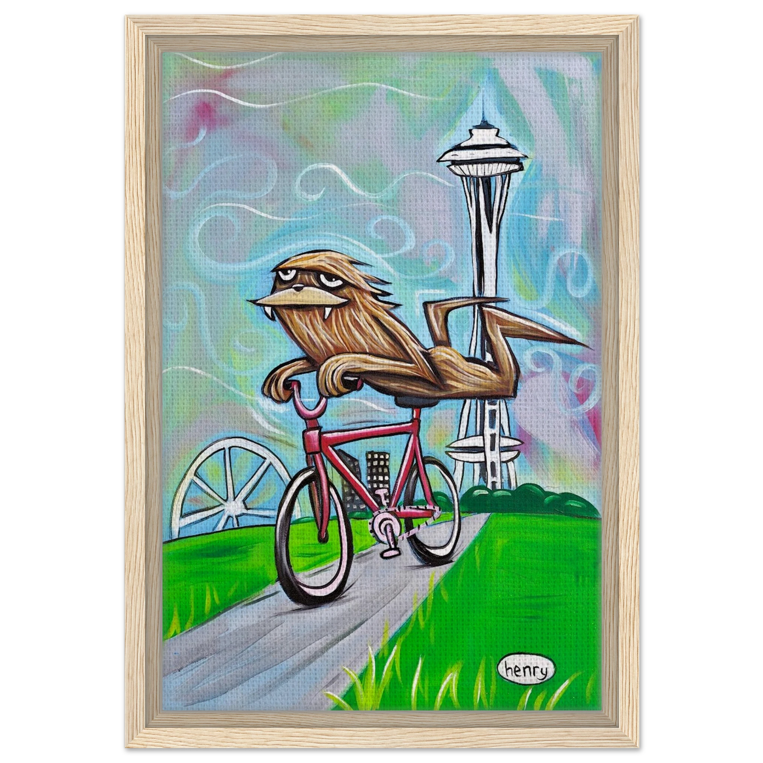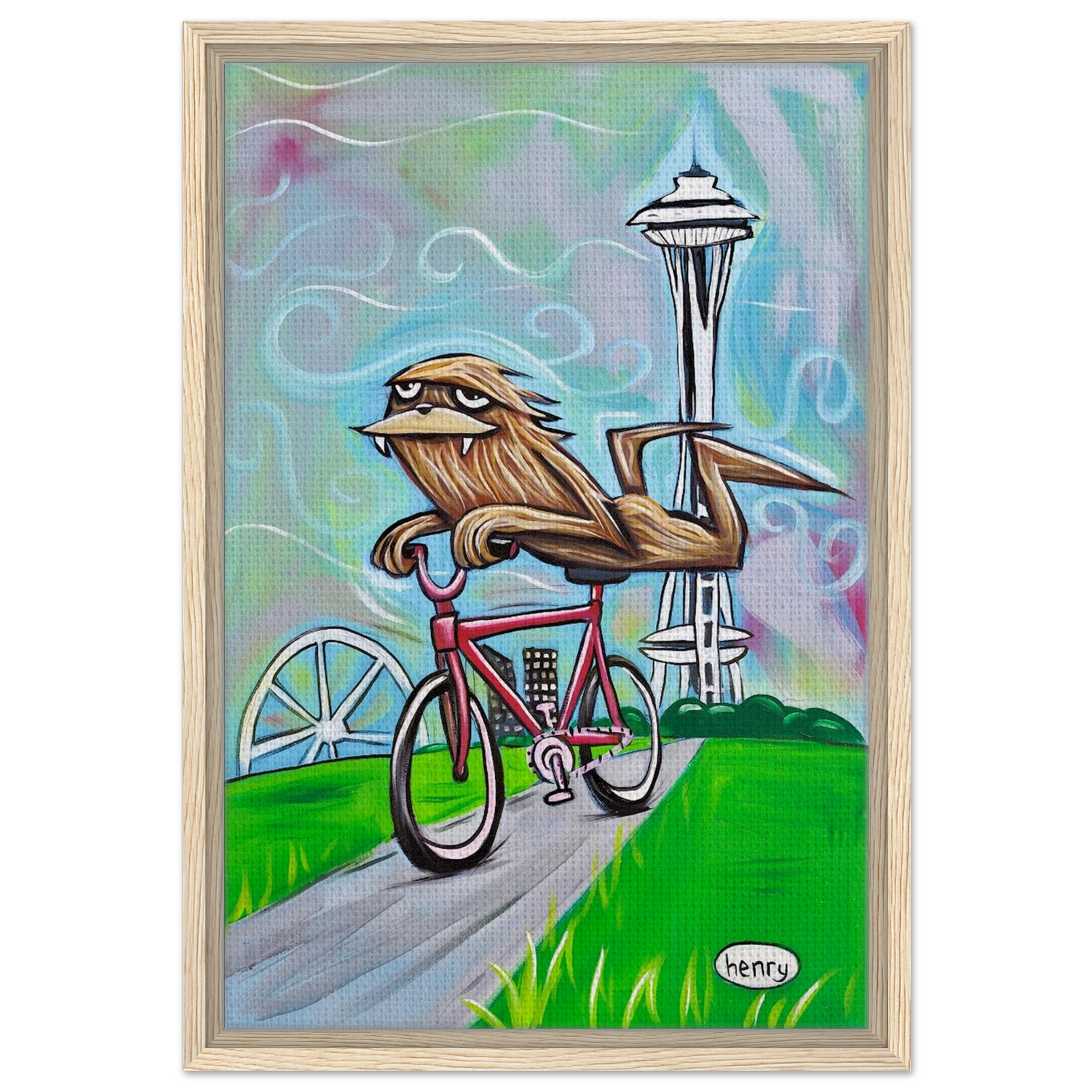 Sasquatch Riding a Bike in Seattle - Framed Canvas Print - is backordered and will ship as soon as it is back in stock.