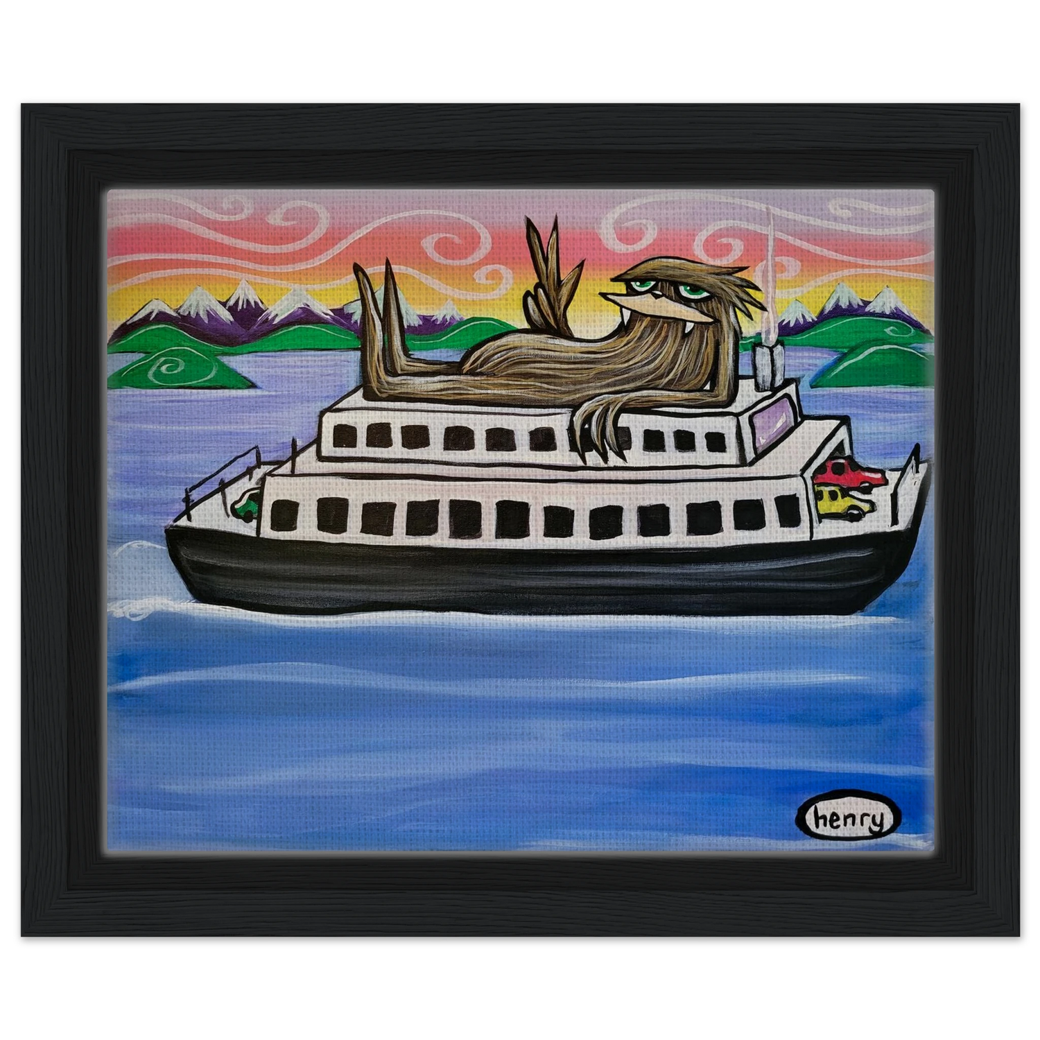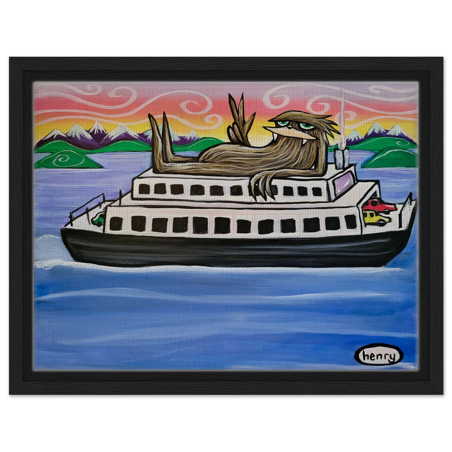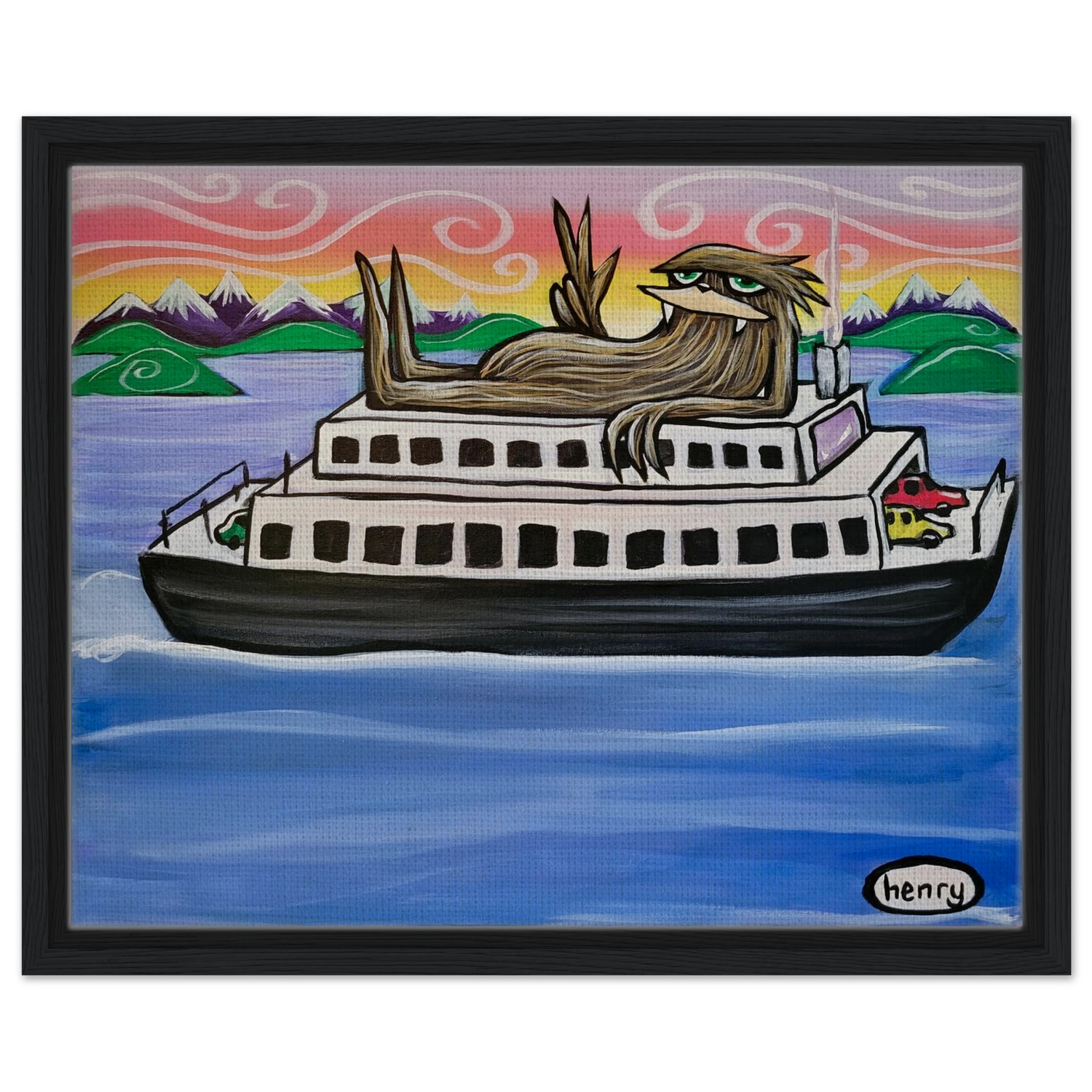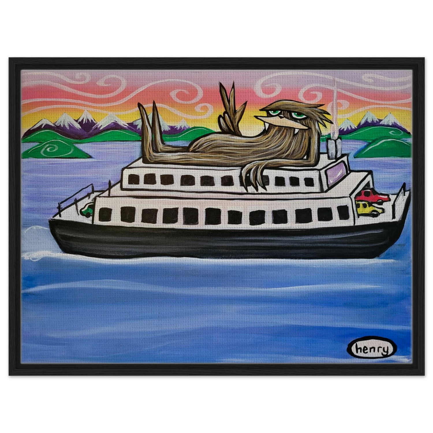 Sasquatch Riding on a Ferry - Framed Canvas Print - is backordered and will ship as soon as it is back in stock.