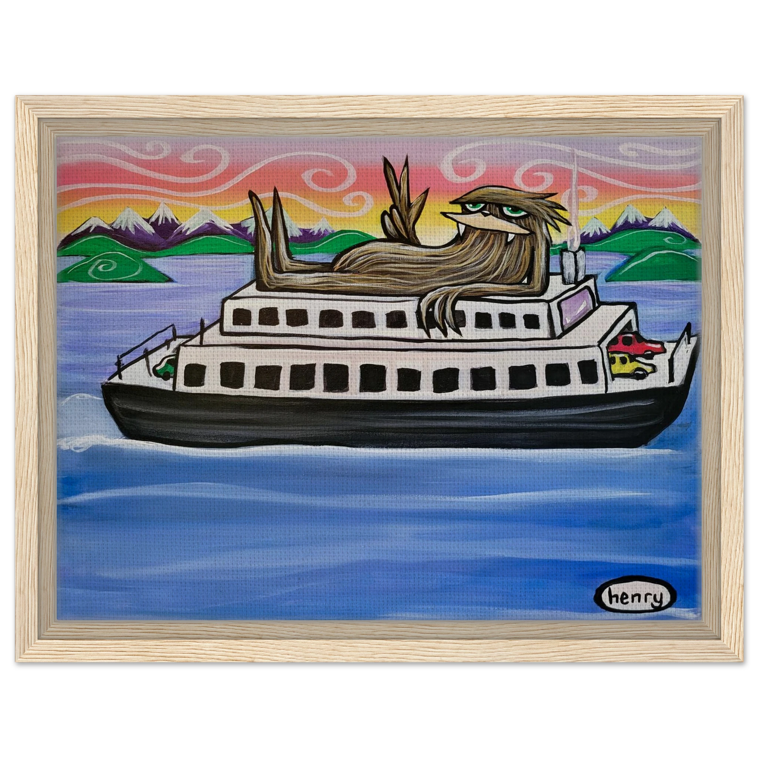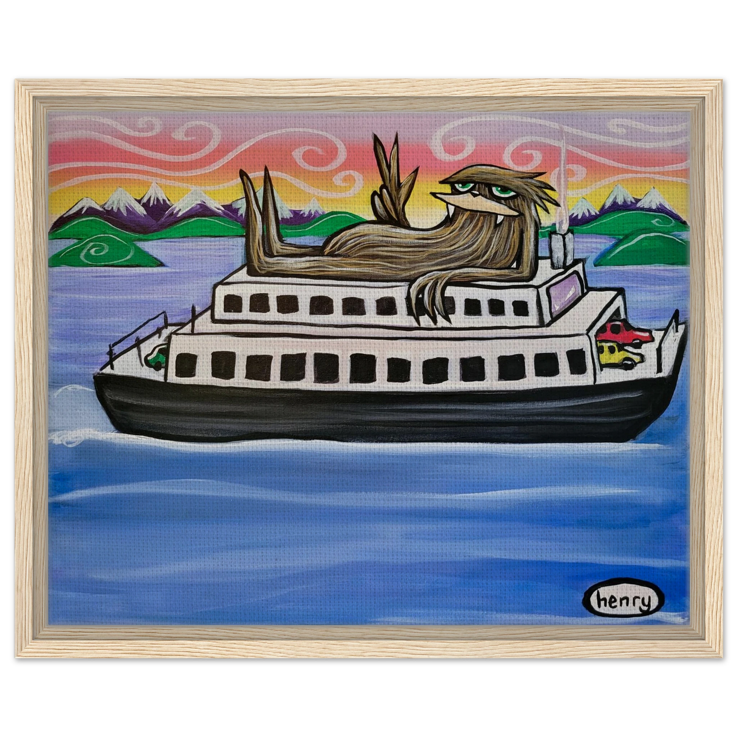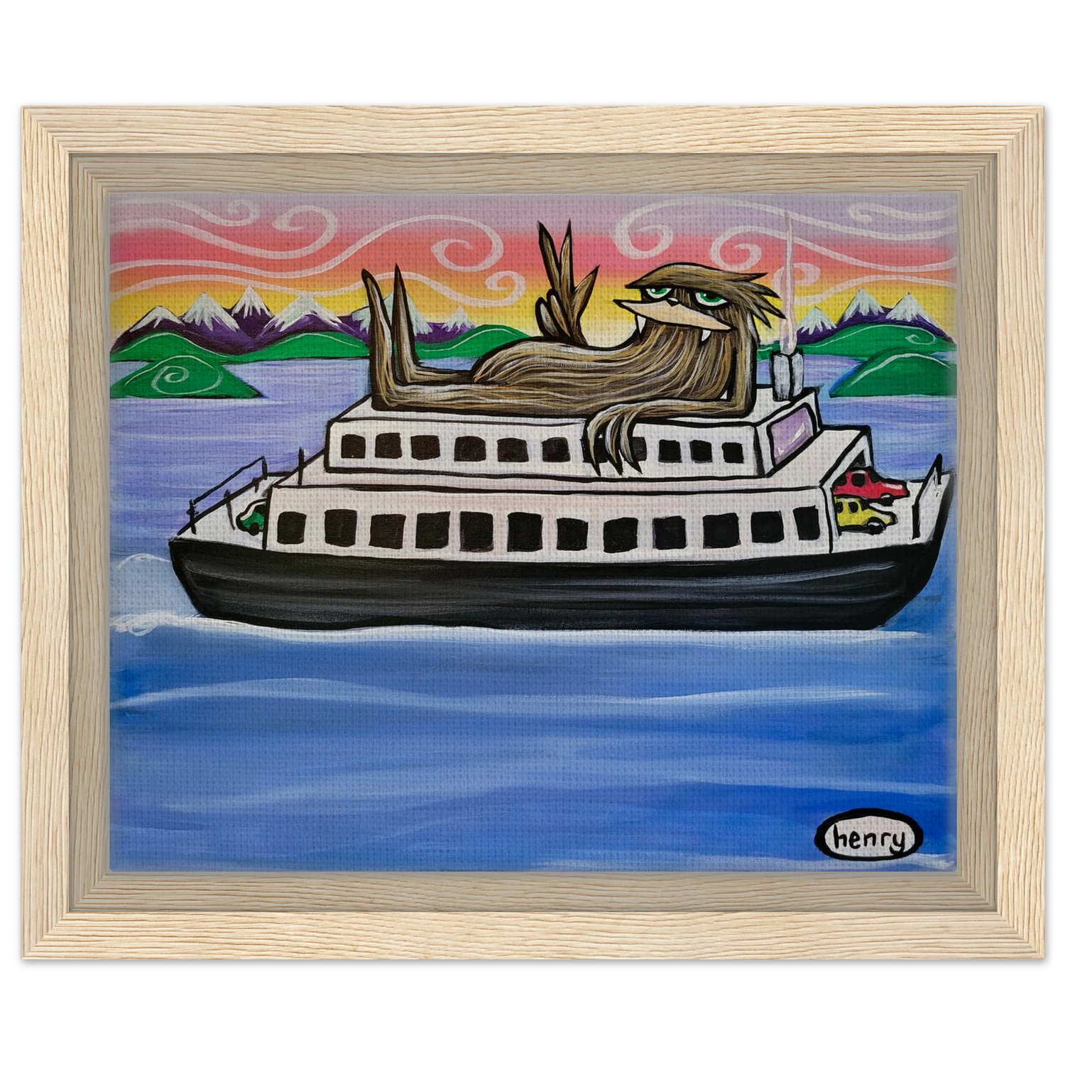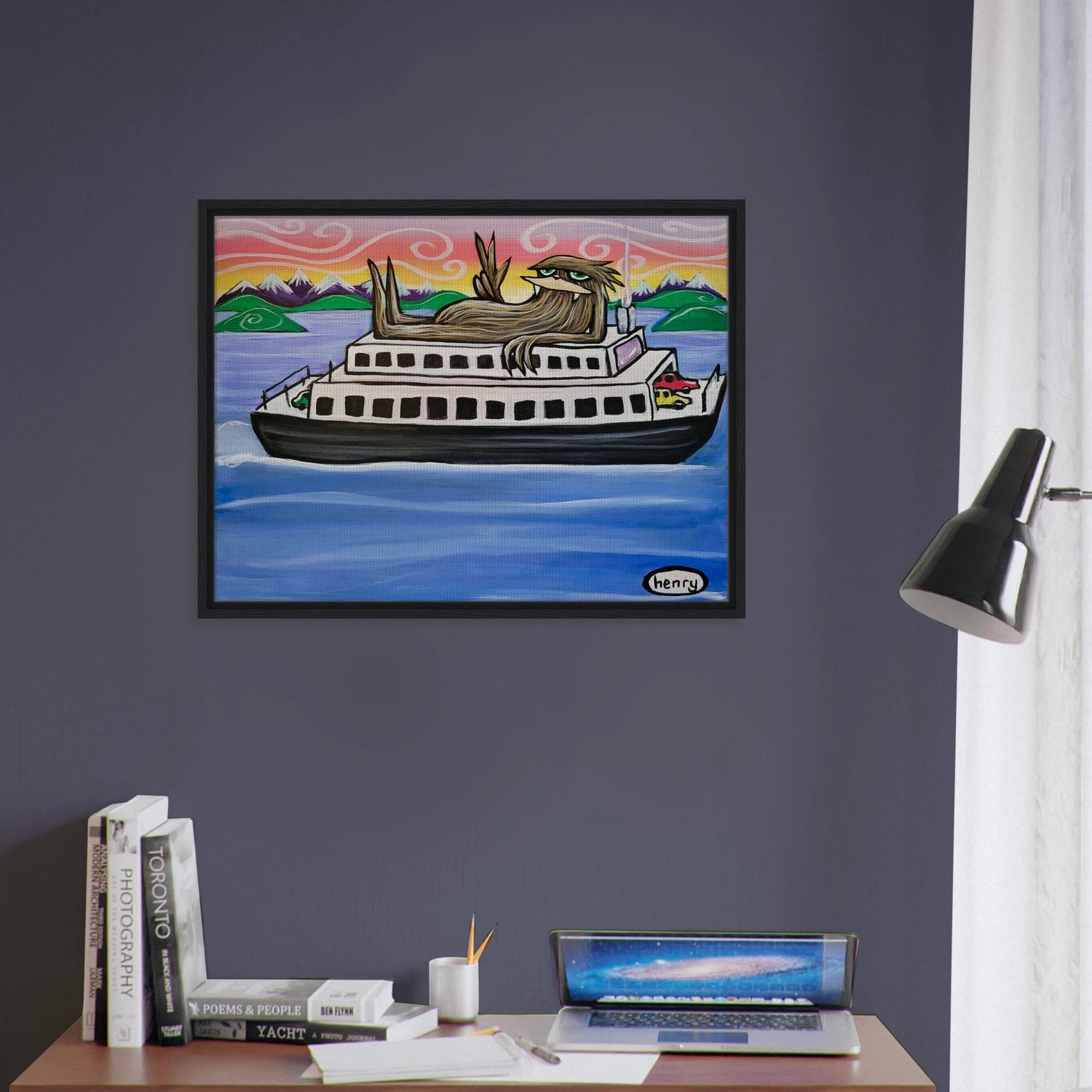 Sasquatch Riding on a Ferry - Framed Canvas Print - is backordered and will ship as soon as it is back in stock.