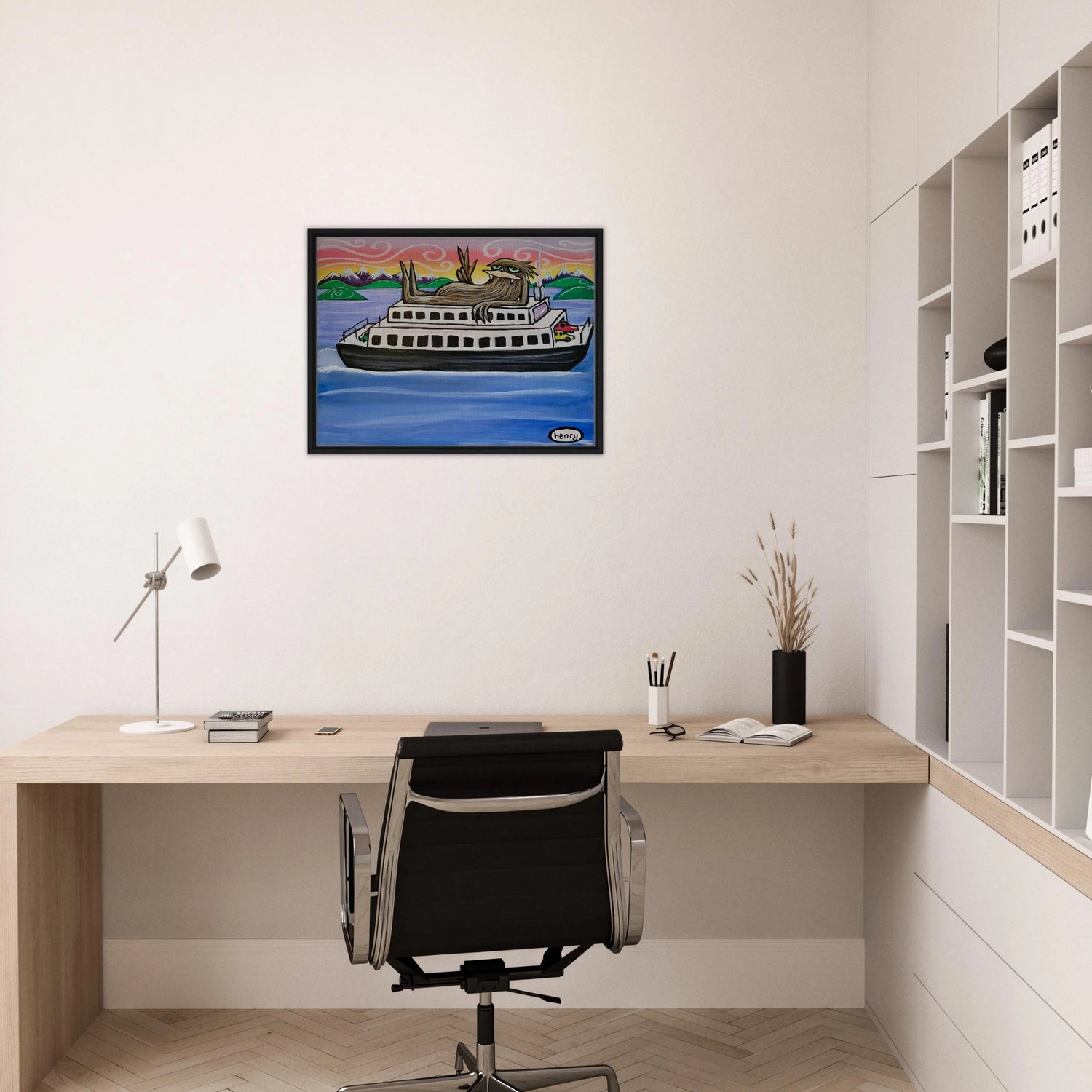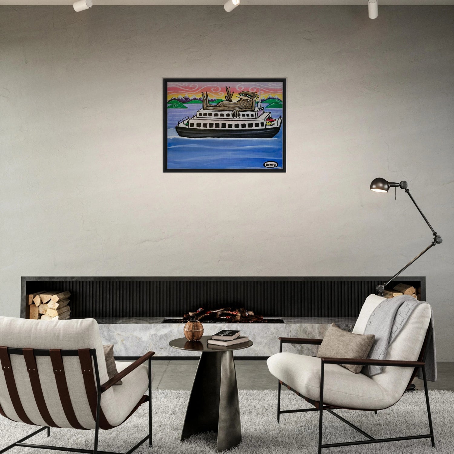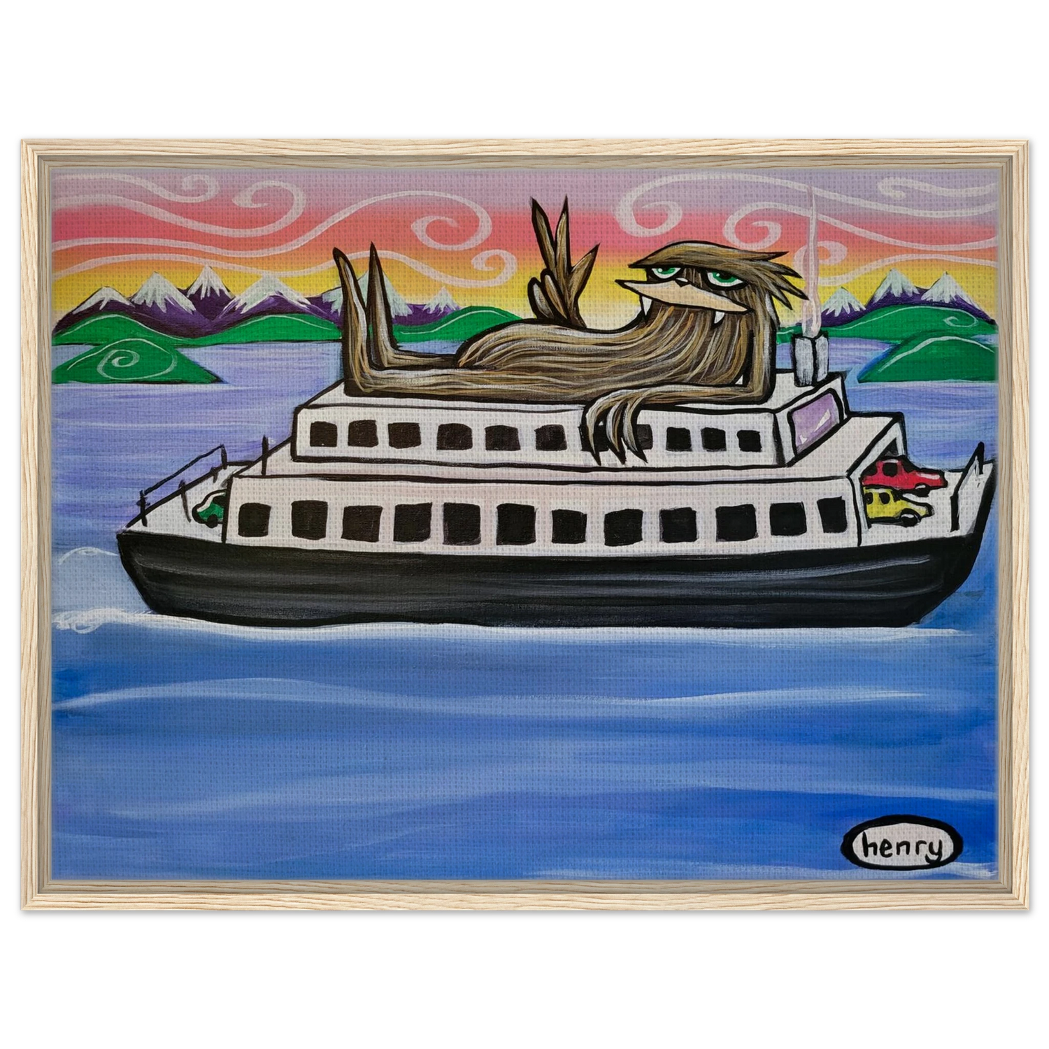 Transform your living space with our stunning framed canvas print featuring the whimsical and captivating artwork of a Sasquatch riding on a ferry. This unique piece is sure to be a conversation starter, blending humor and artistry to enhance any room.