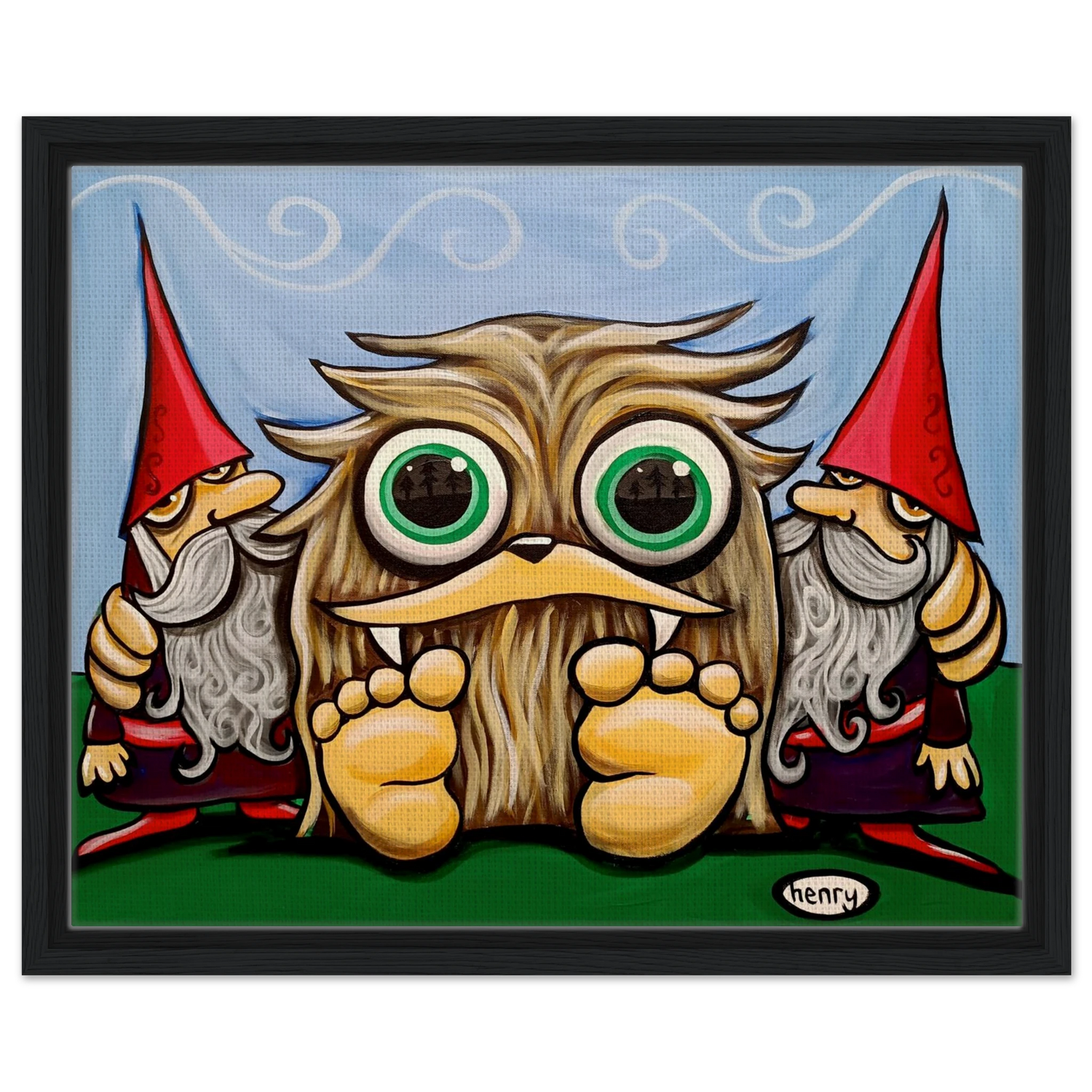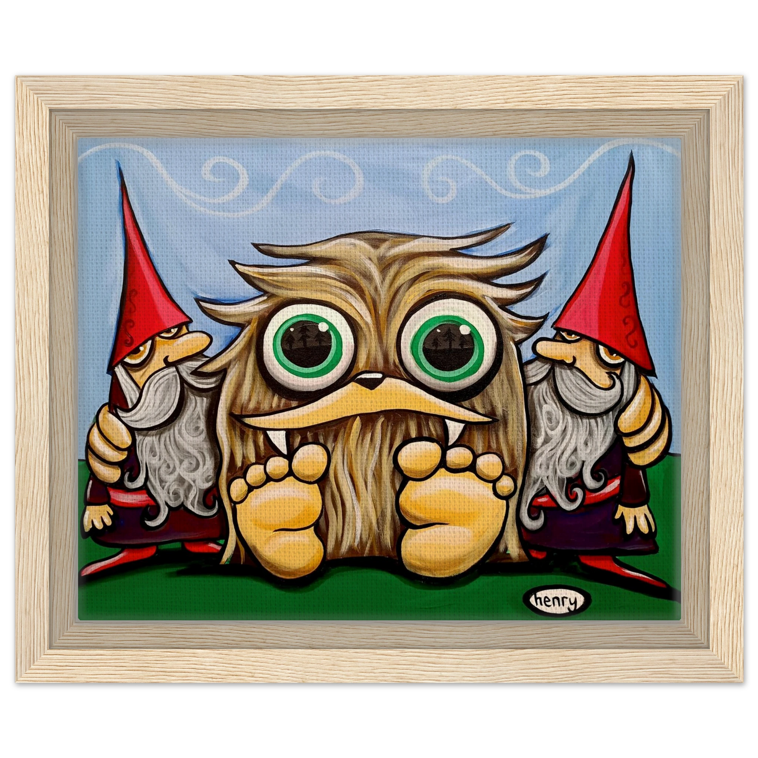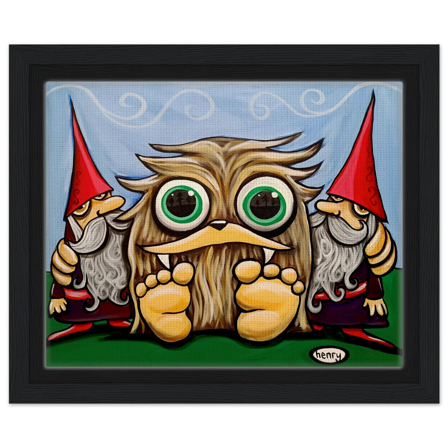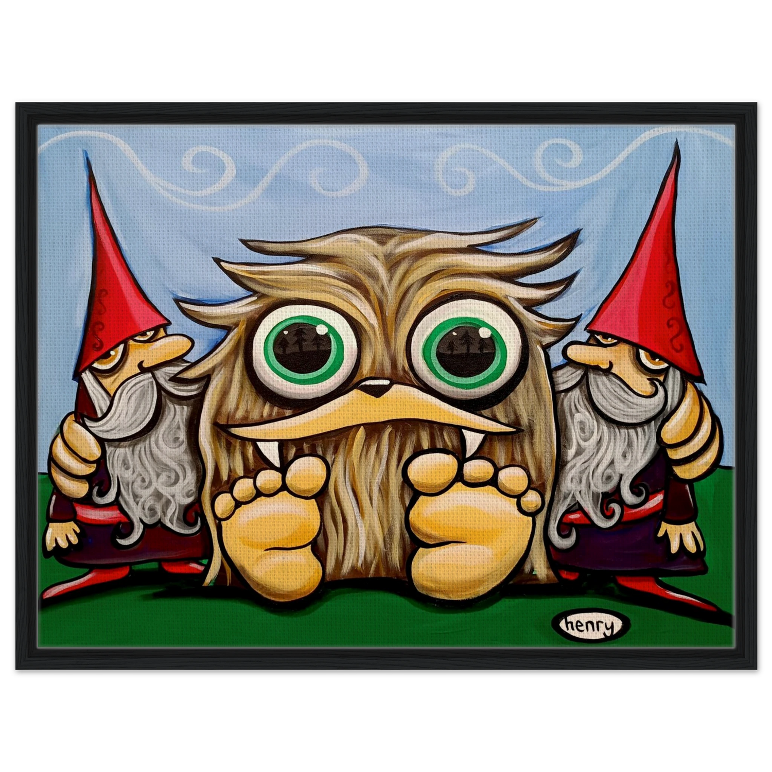 Baby Sasquatch with Gnomes - Framed Canvas Print - is backordered and will ship as soon as it is back in stock.