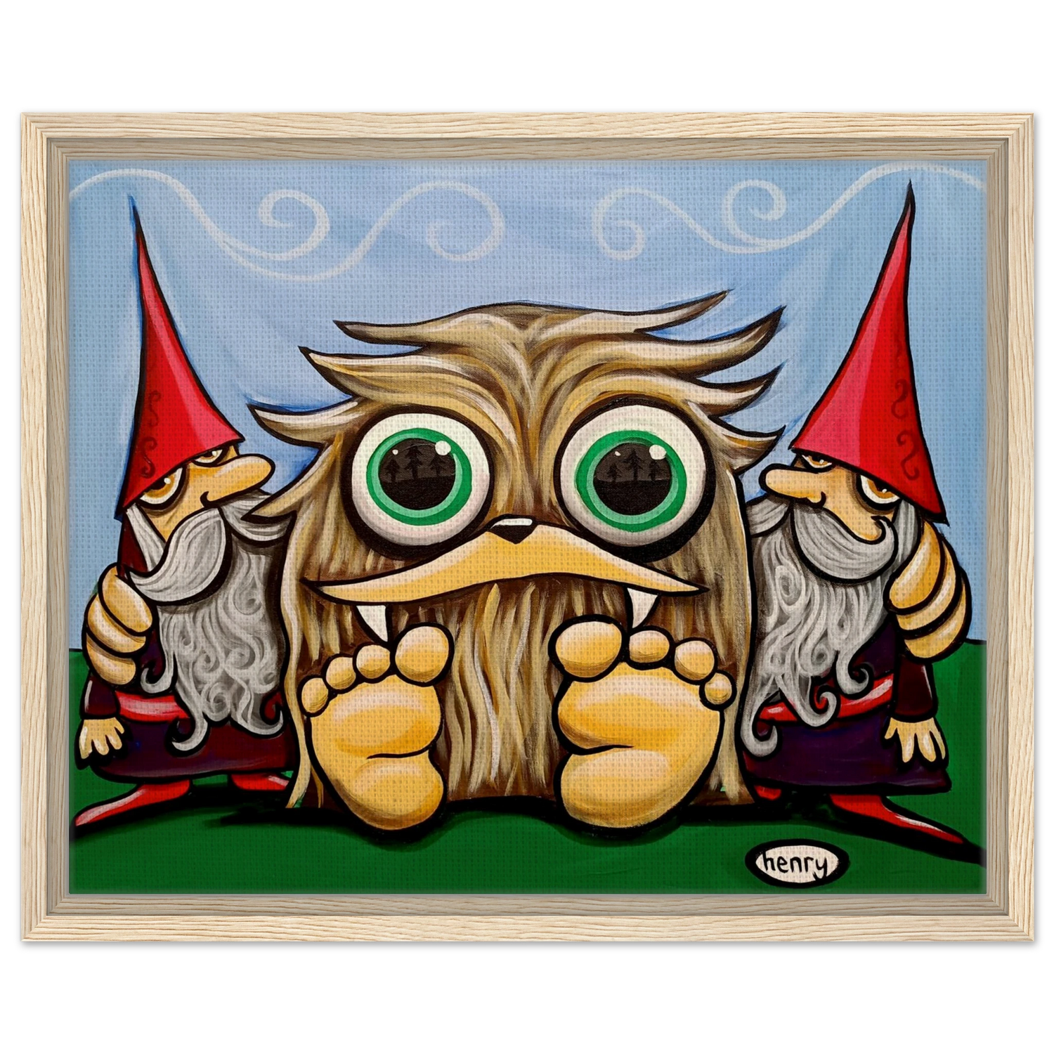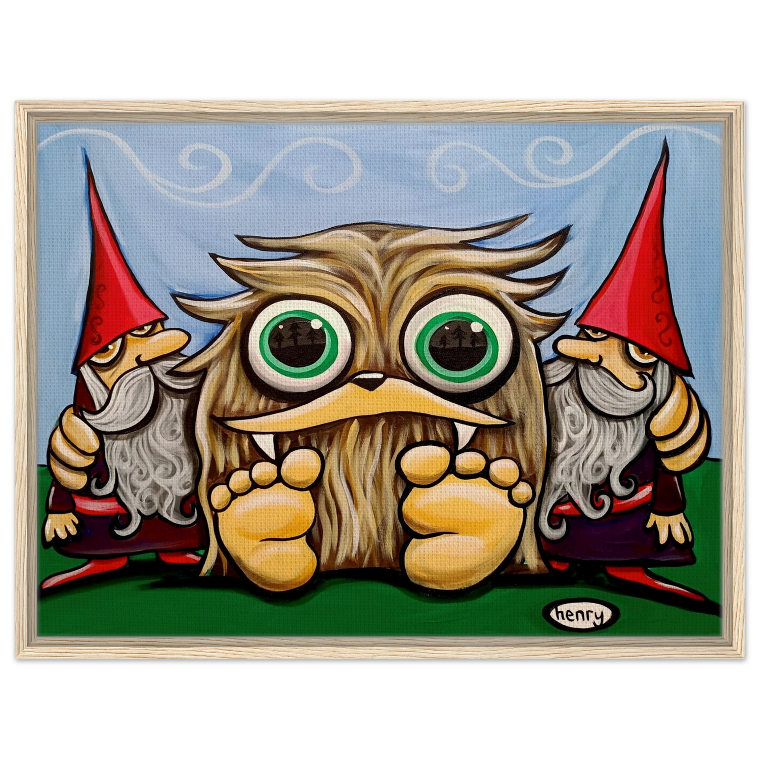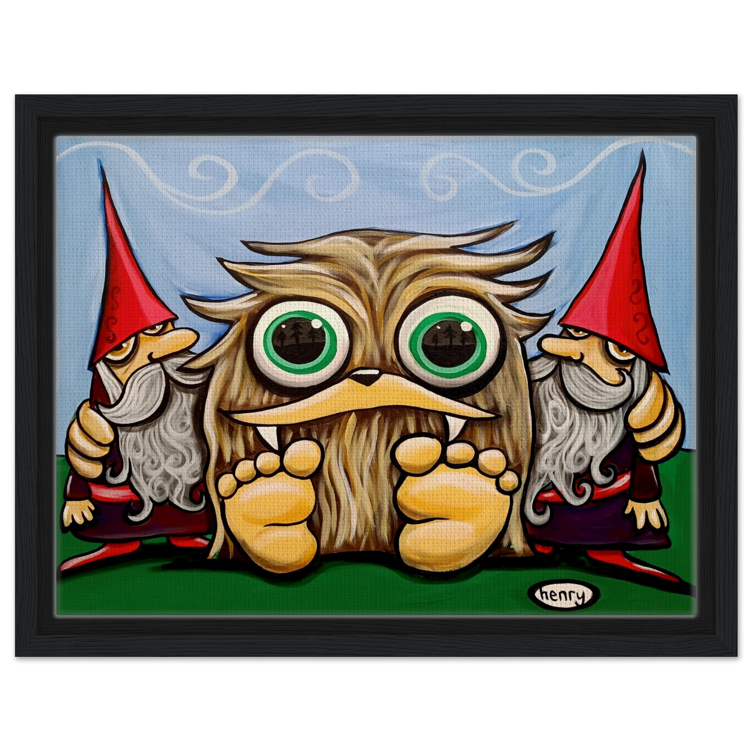 Baby Sasquatch with Gnomes - Framed Canvas Print - is backordered and will ship as soon as it is back in stock.