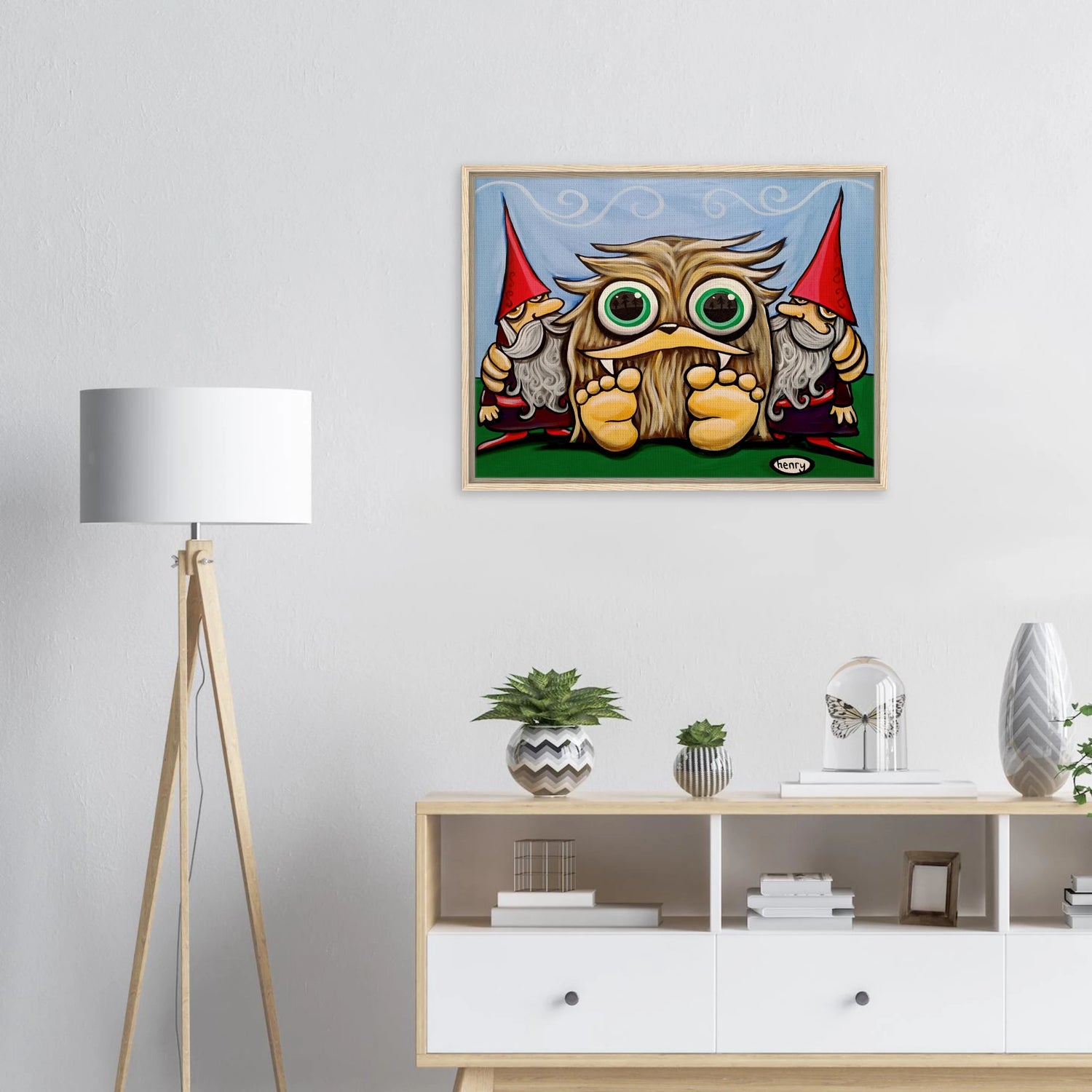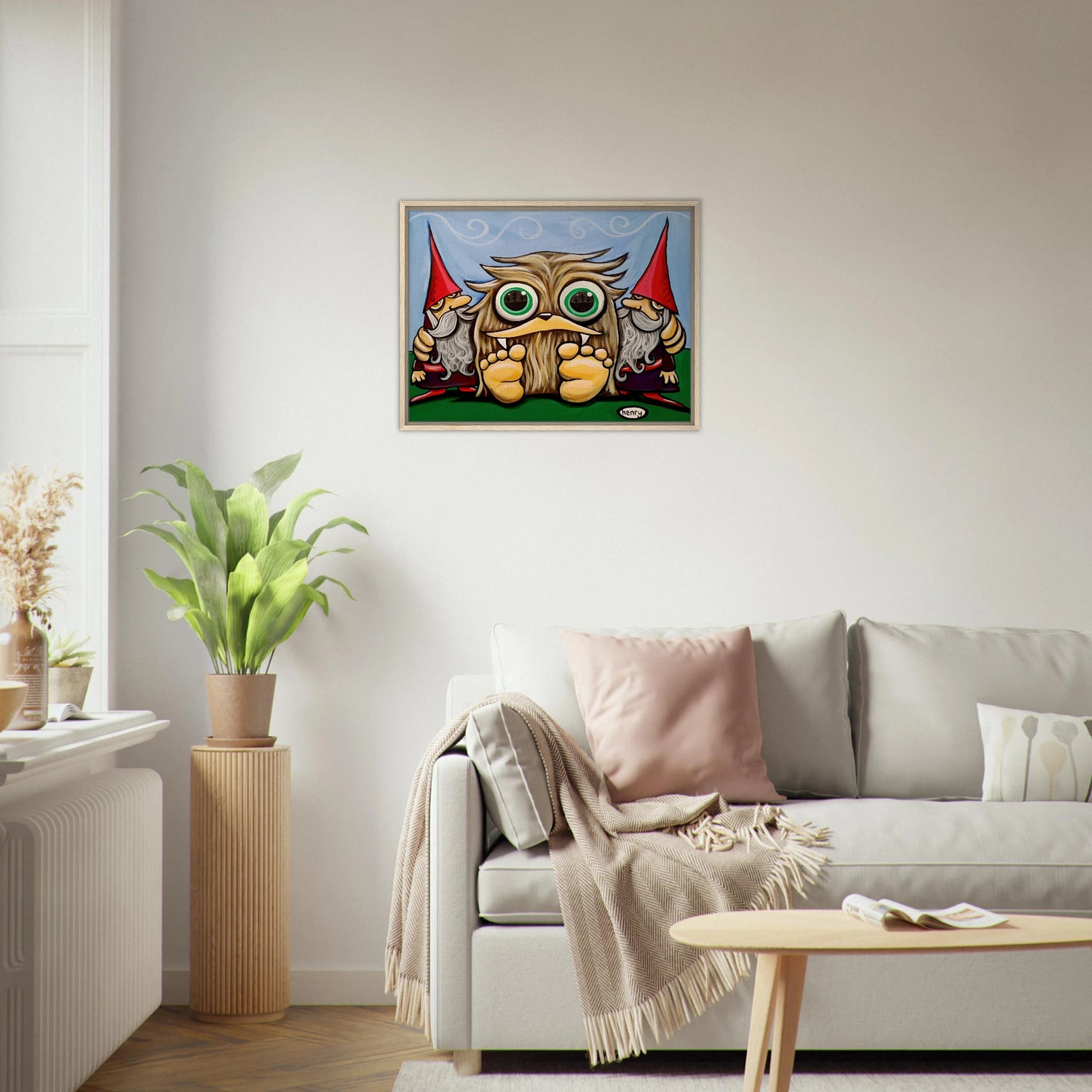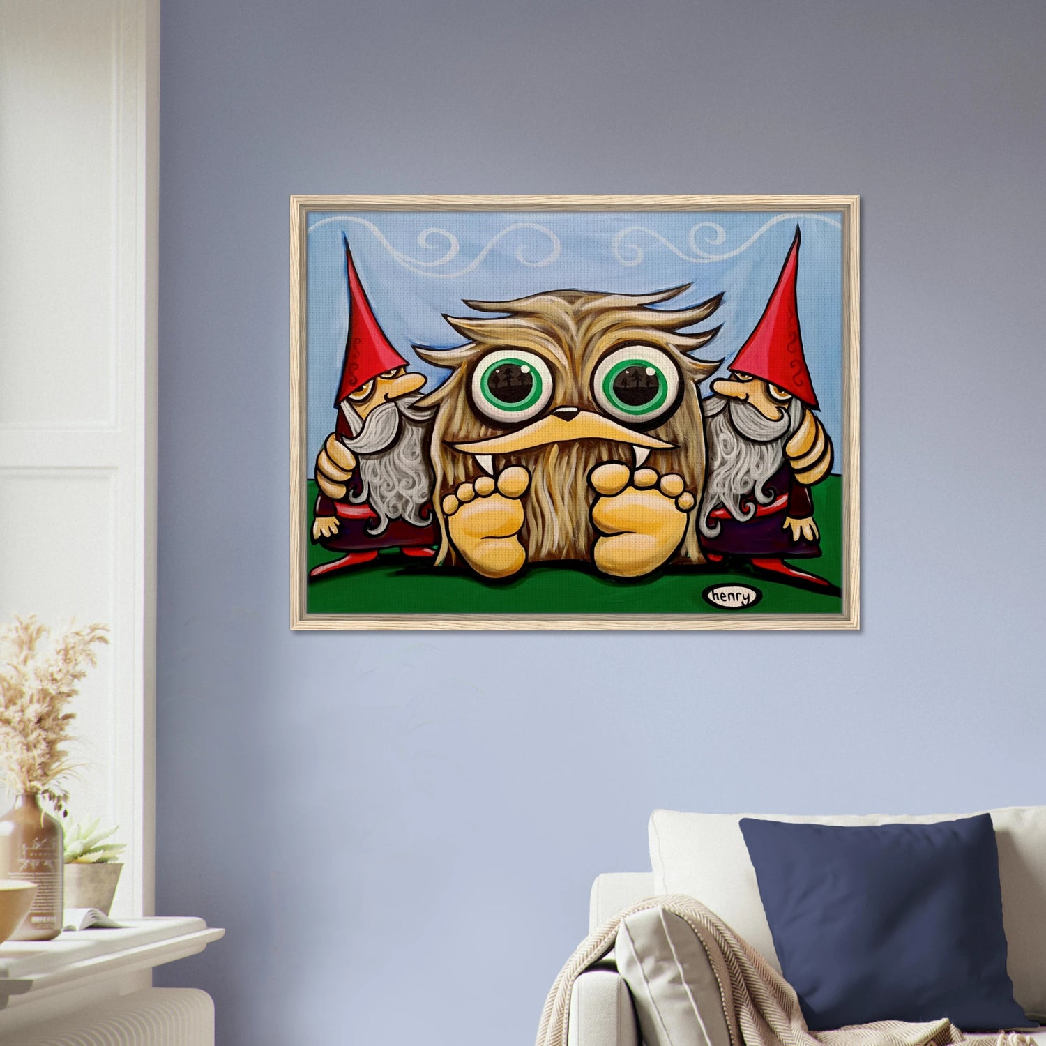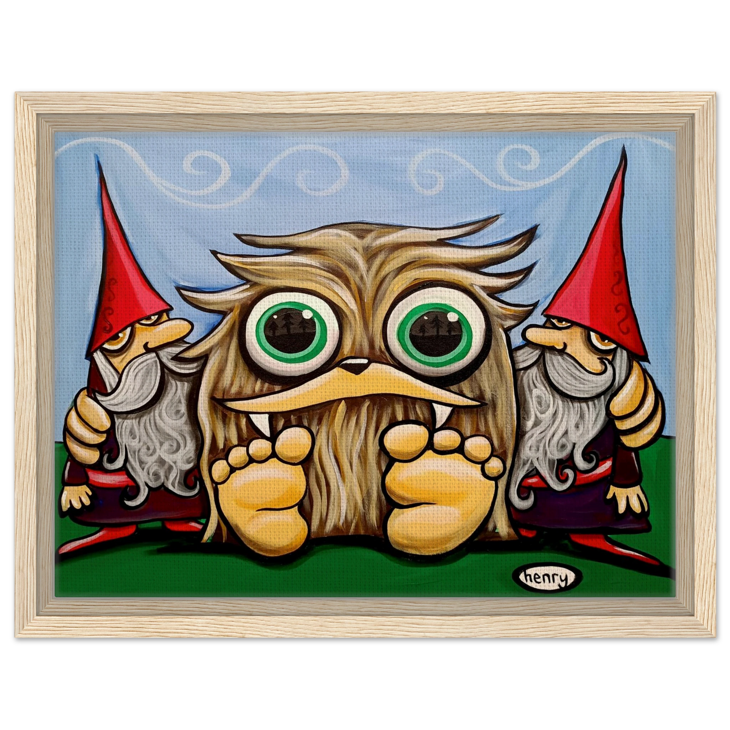 Baby Sasquatch with Gnomes - Framed Canvas Print - is backordered and will ship as soon as it is back in stock.