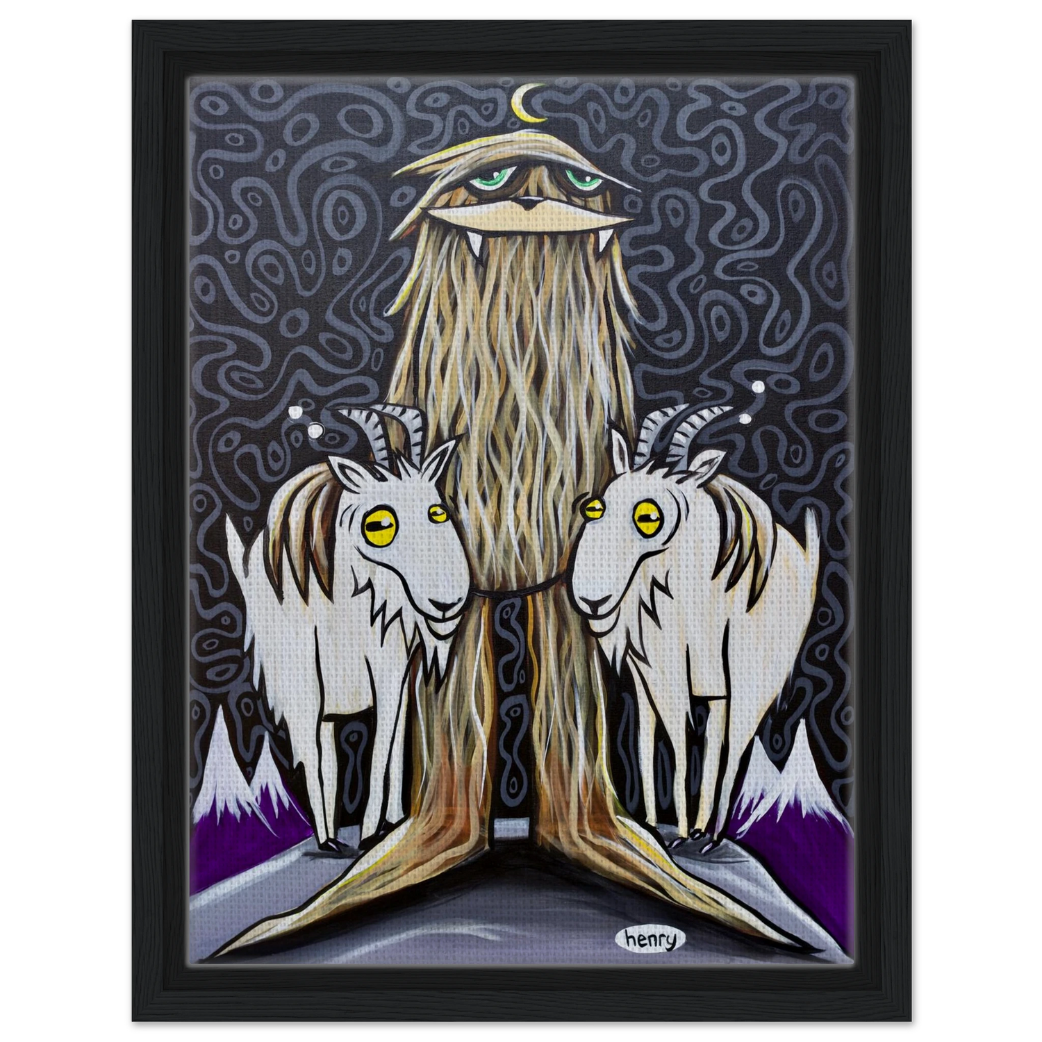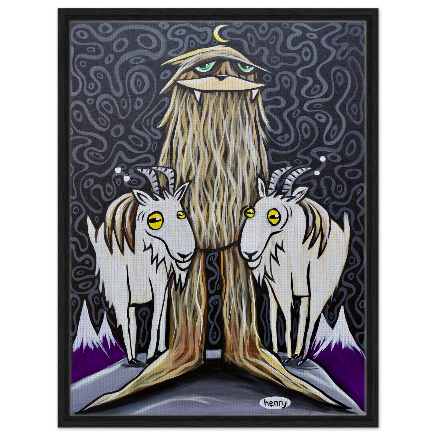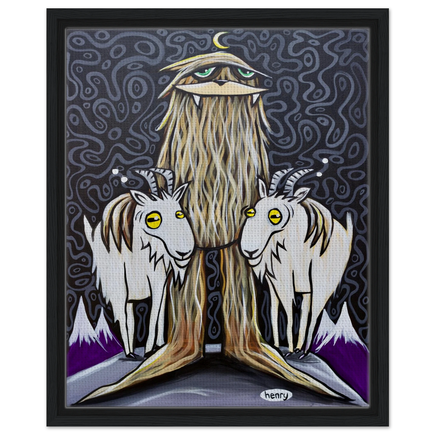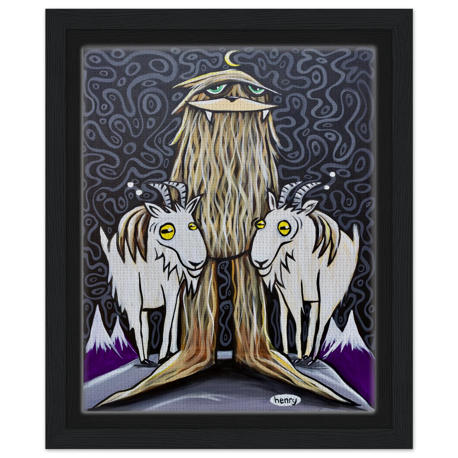 Sasquatch with Two Goats - Framed Canvas Print - is backordered and will ship as soon as it is back in stock.