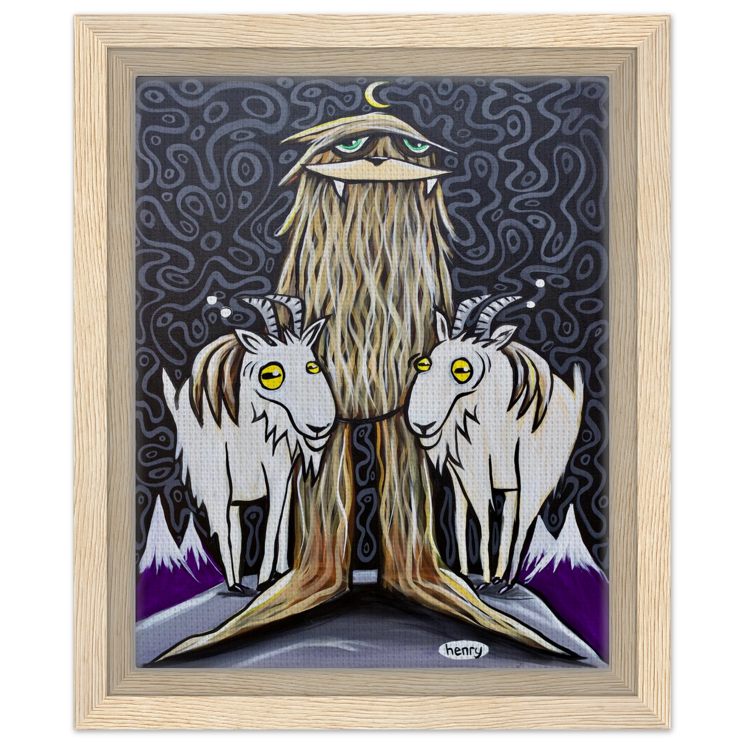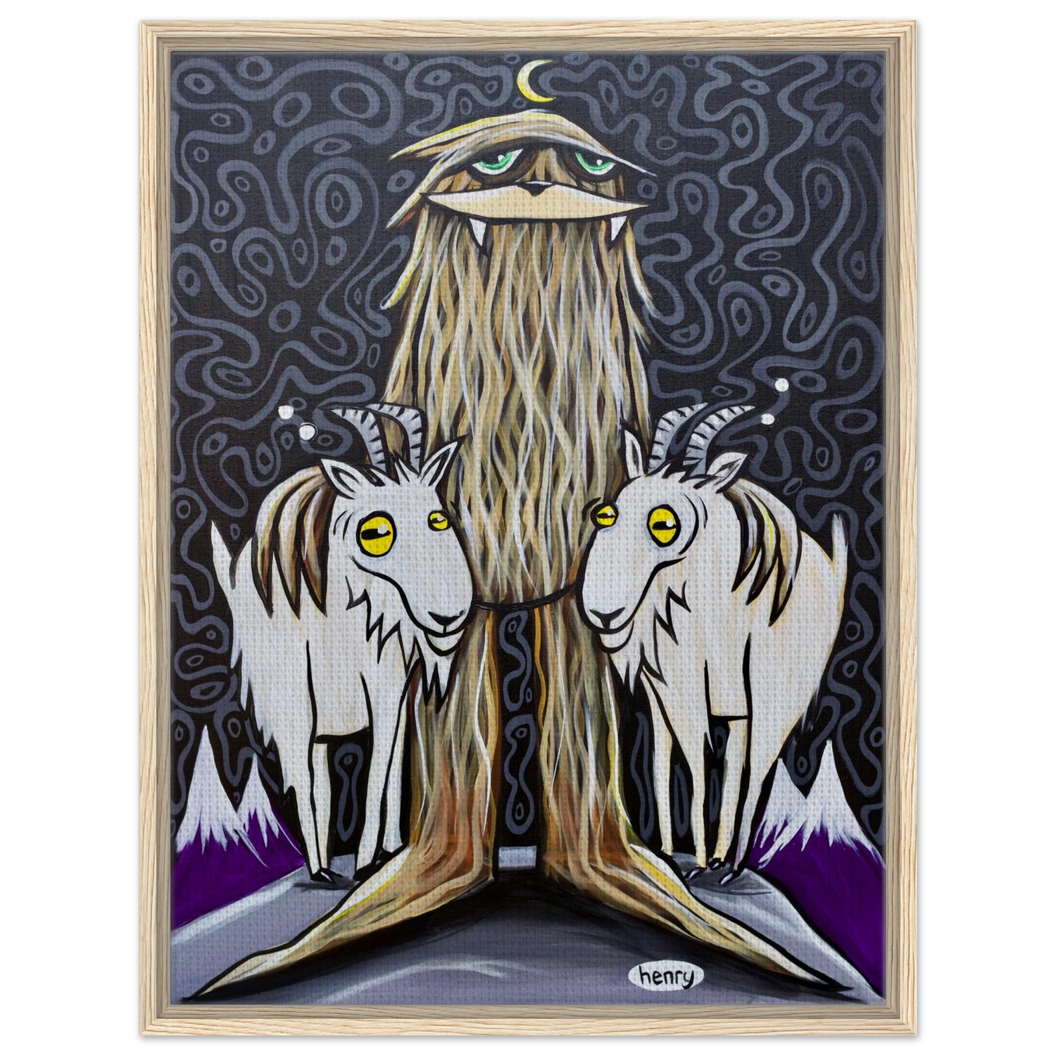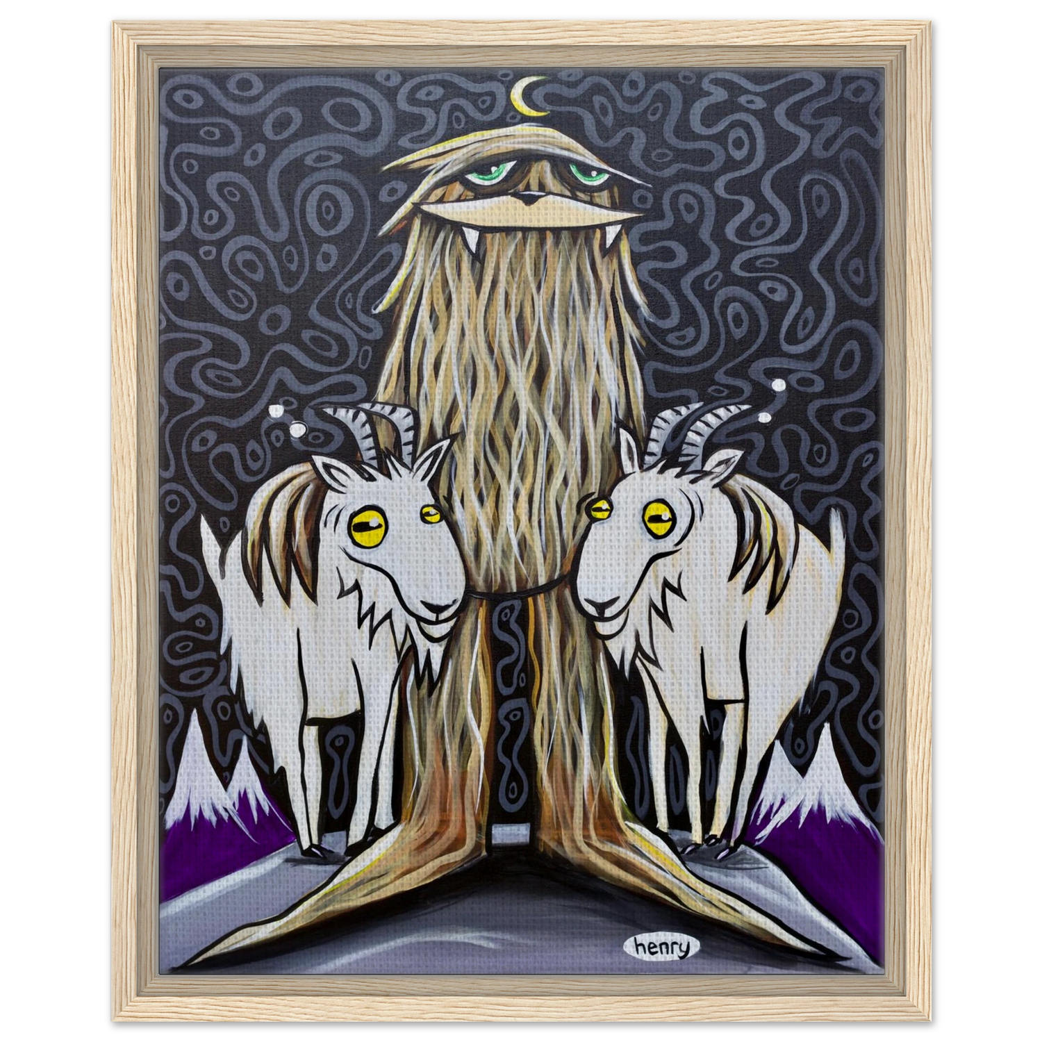 Sasquatch with Two Goats - Framed Canvas Print - is backordered and will ship as soon as it is back in stock.