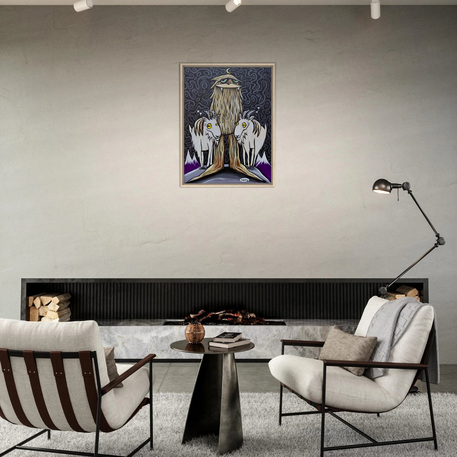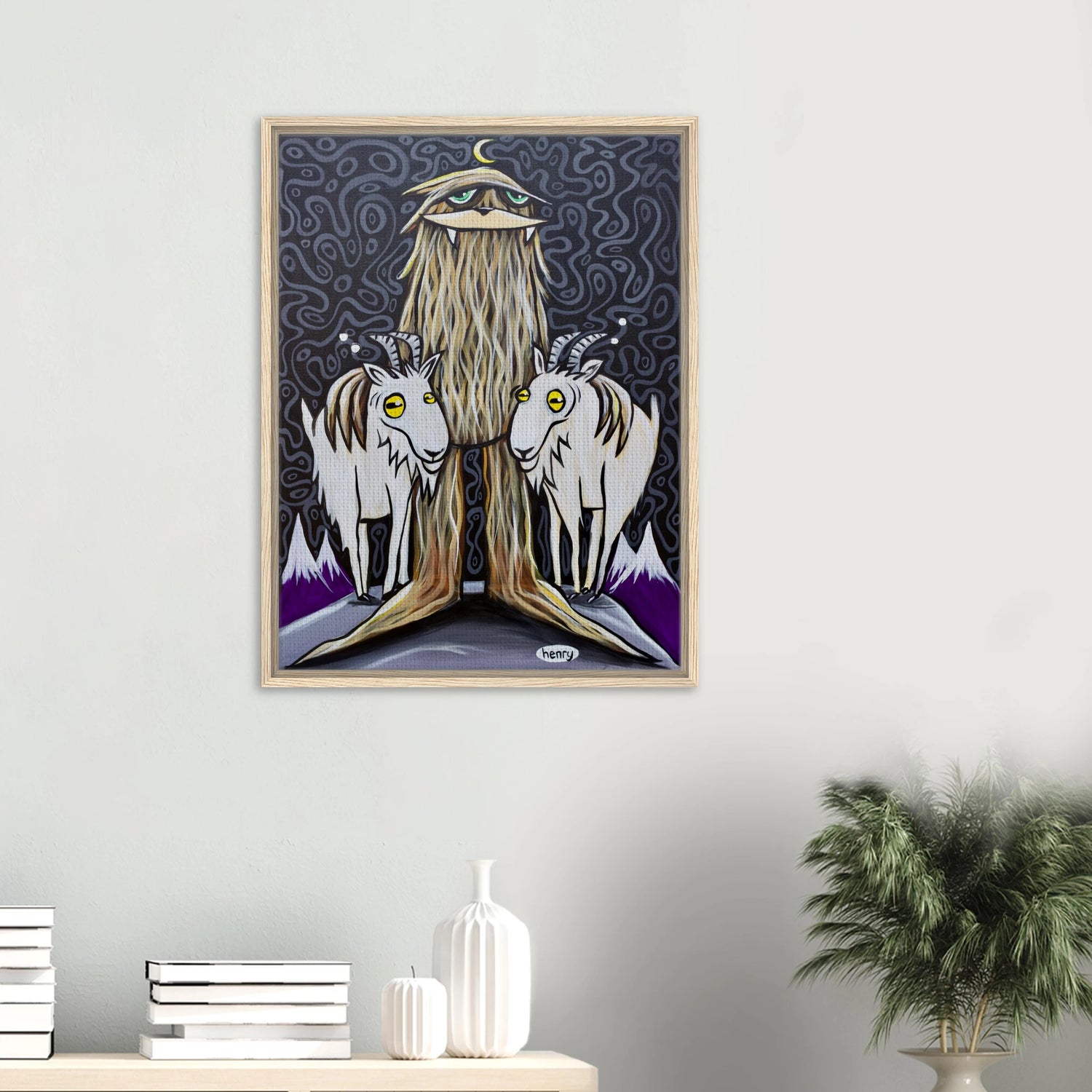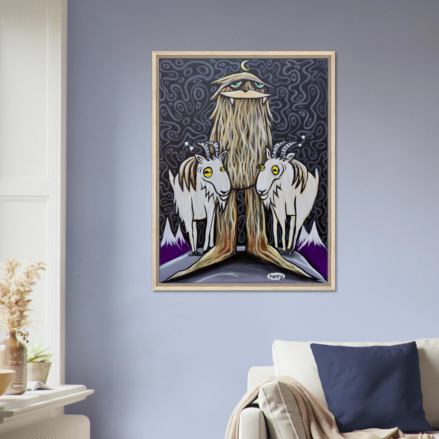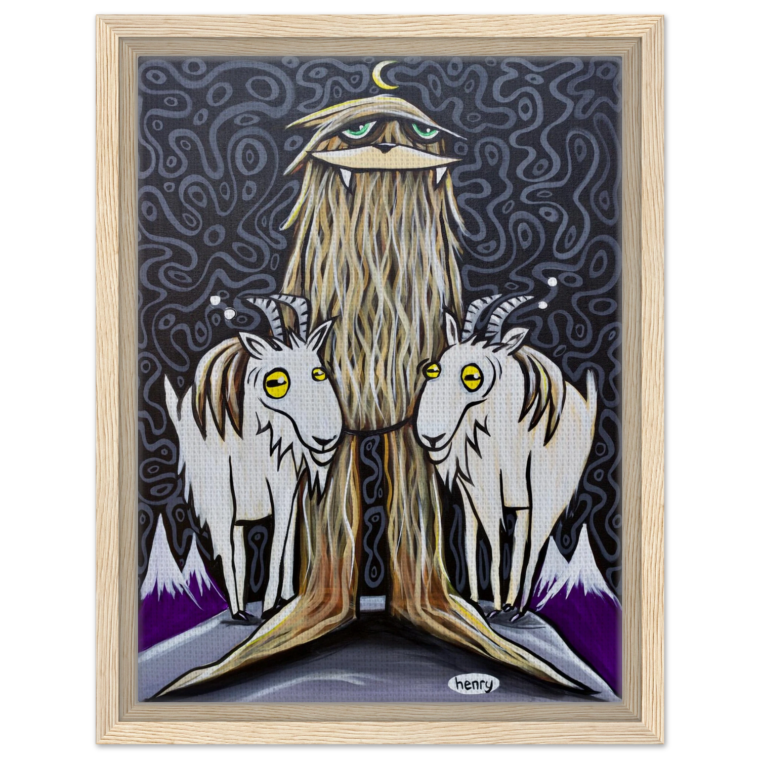 Sasquatch with Two Goats - Framed Canvas Print - is backordered and will ship as soon as it is back in stock.