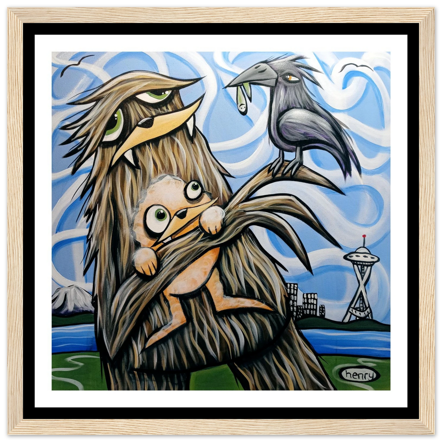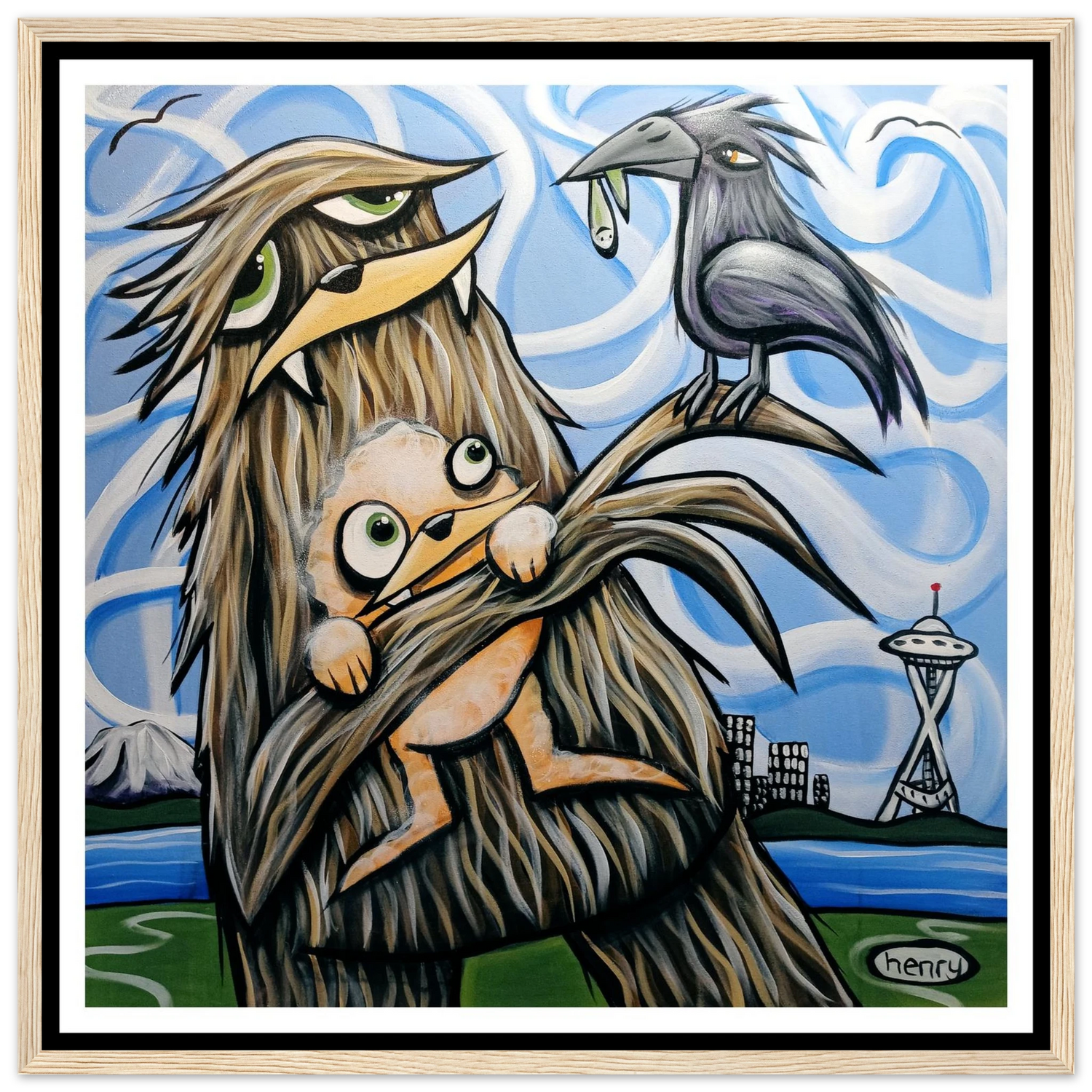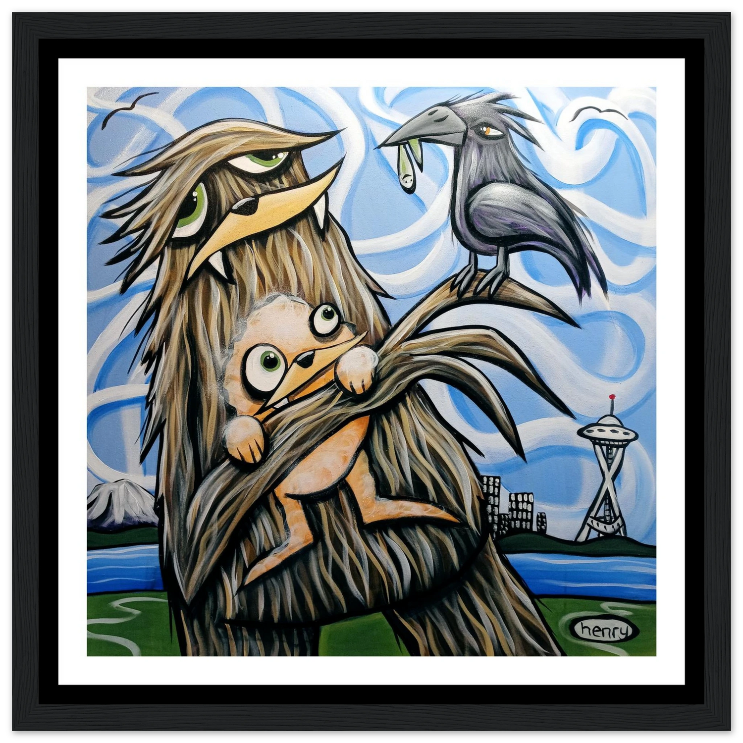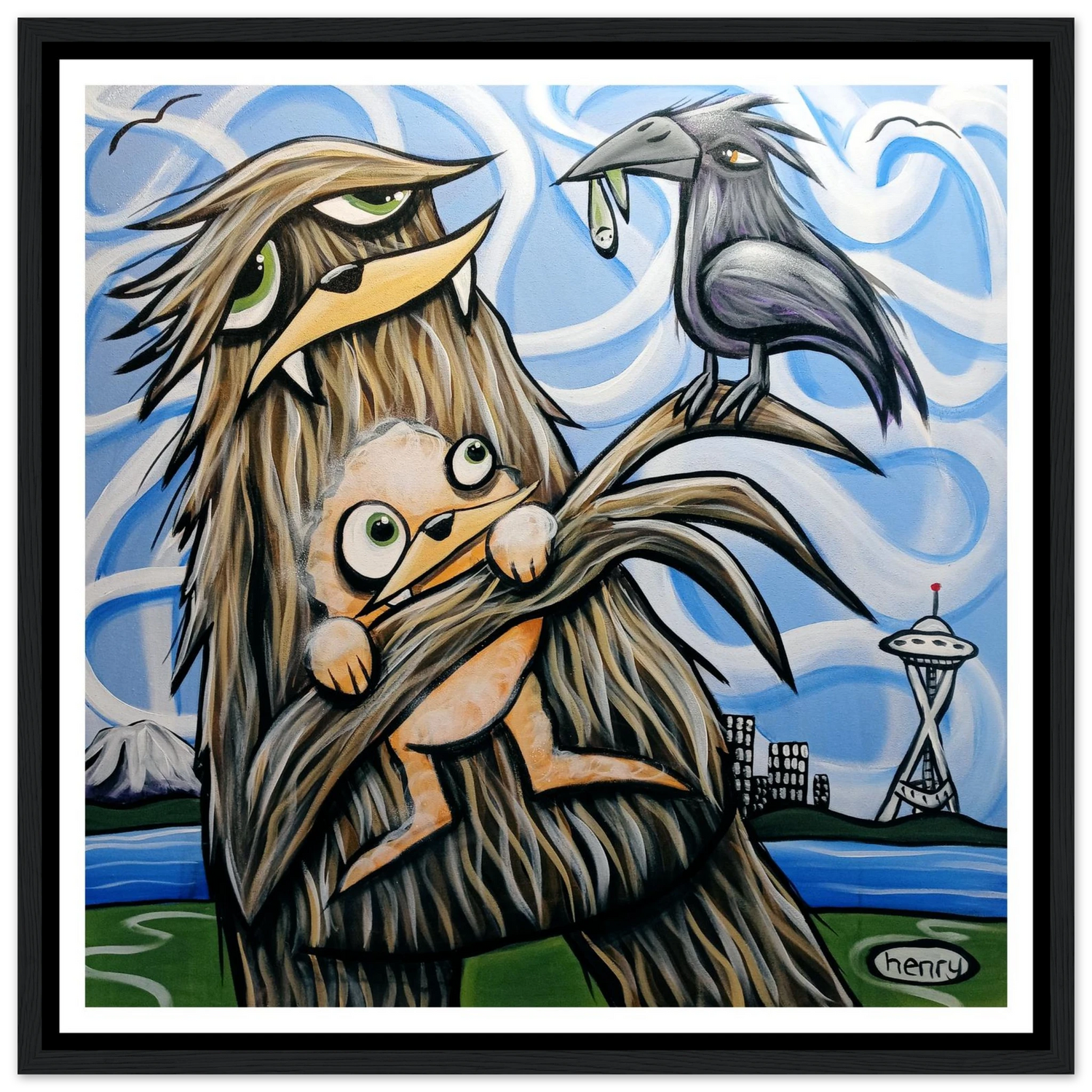 Sasquatch Dad and Hungry Crow - Mounted Framed Poster