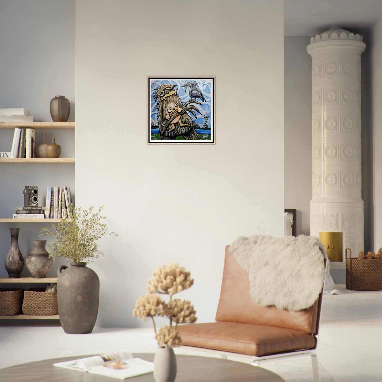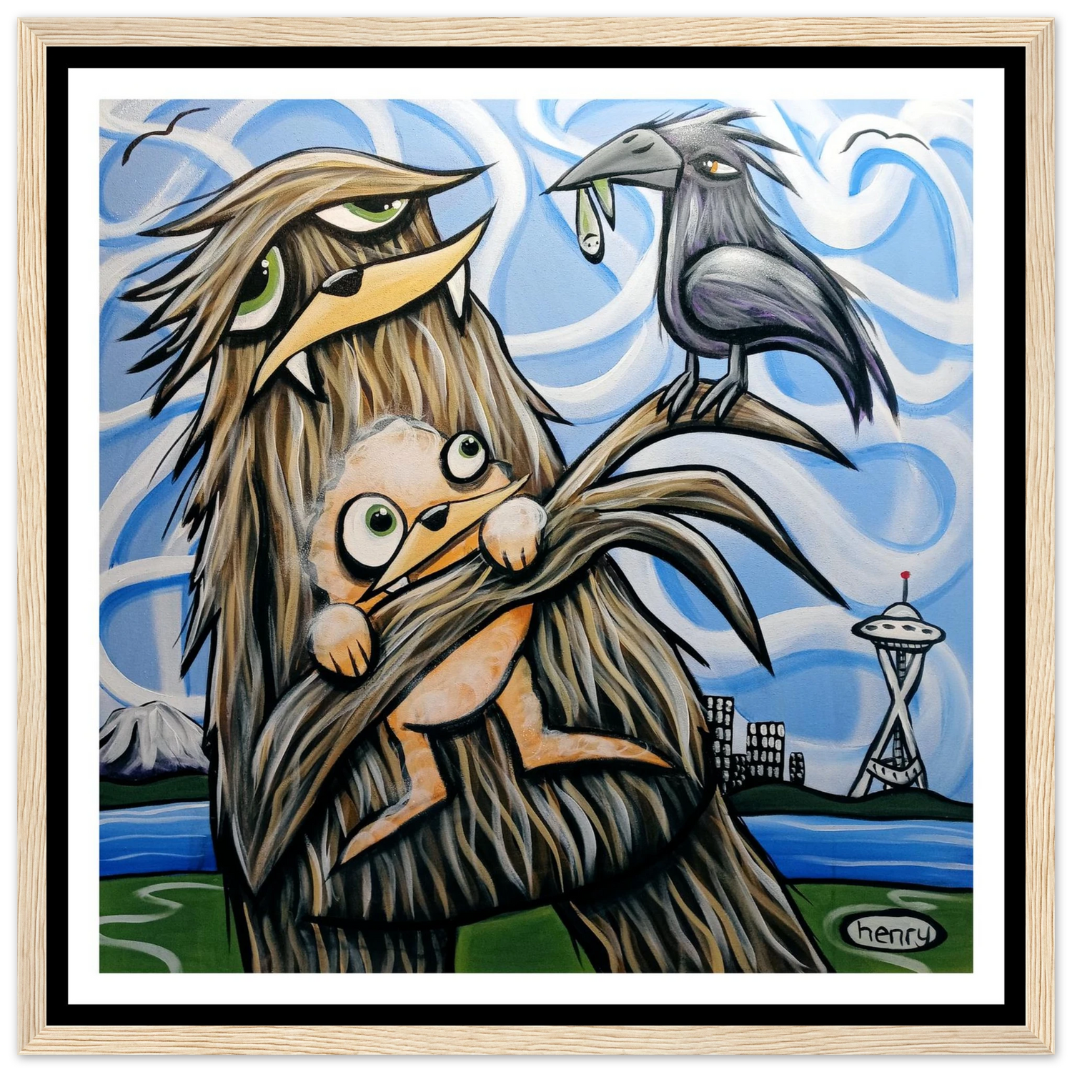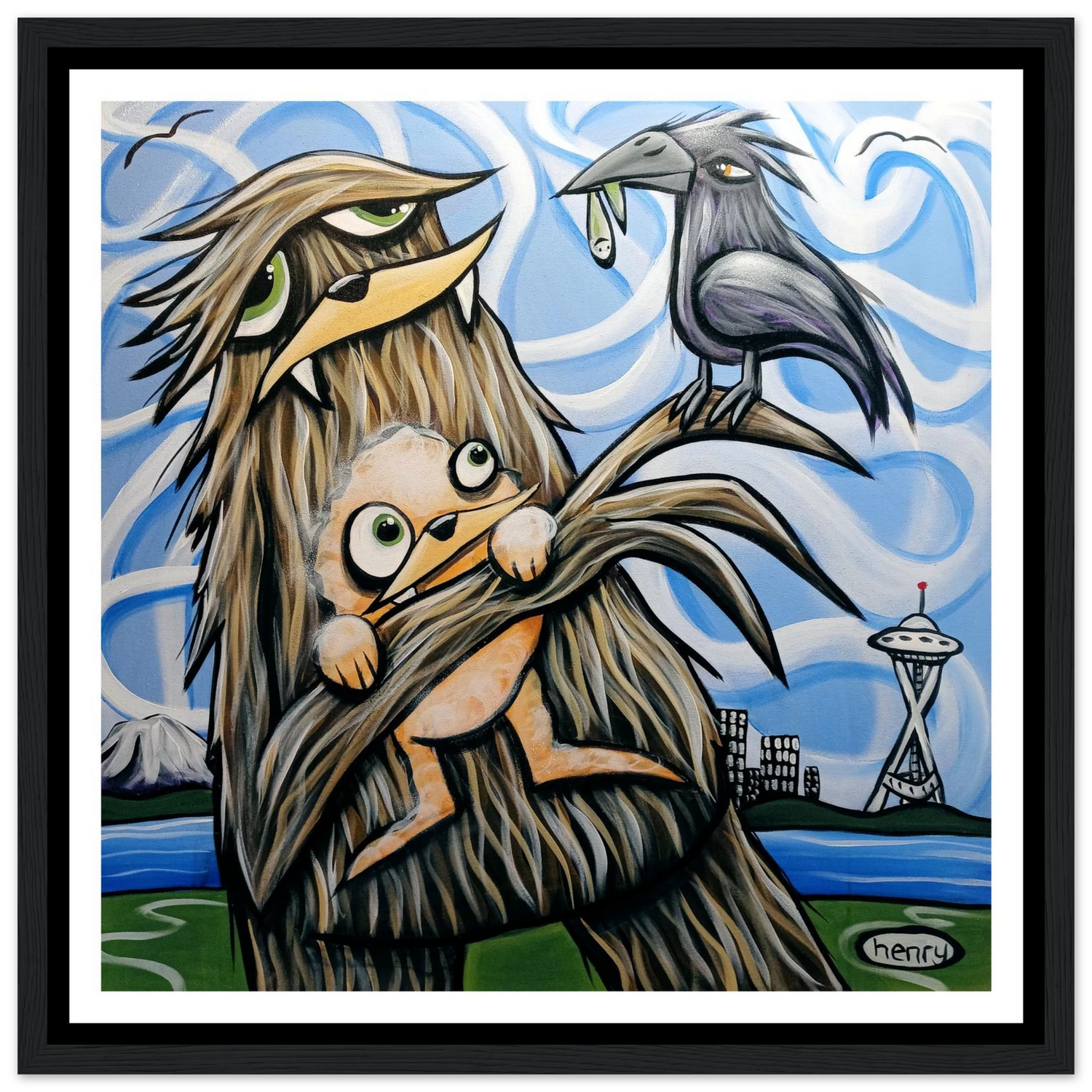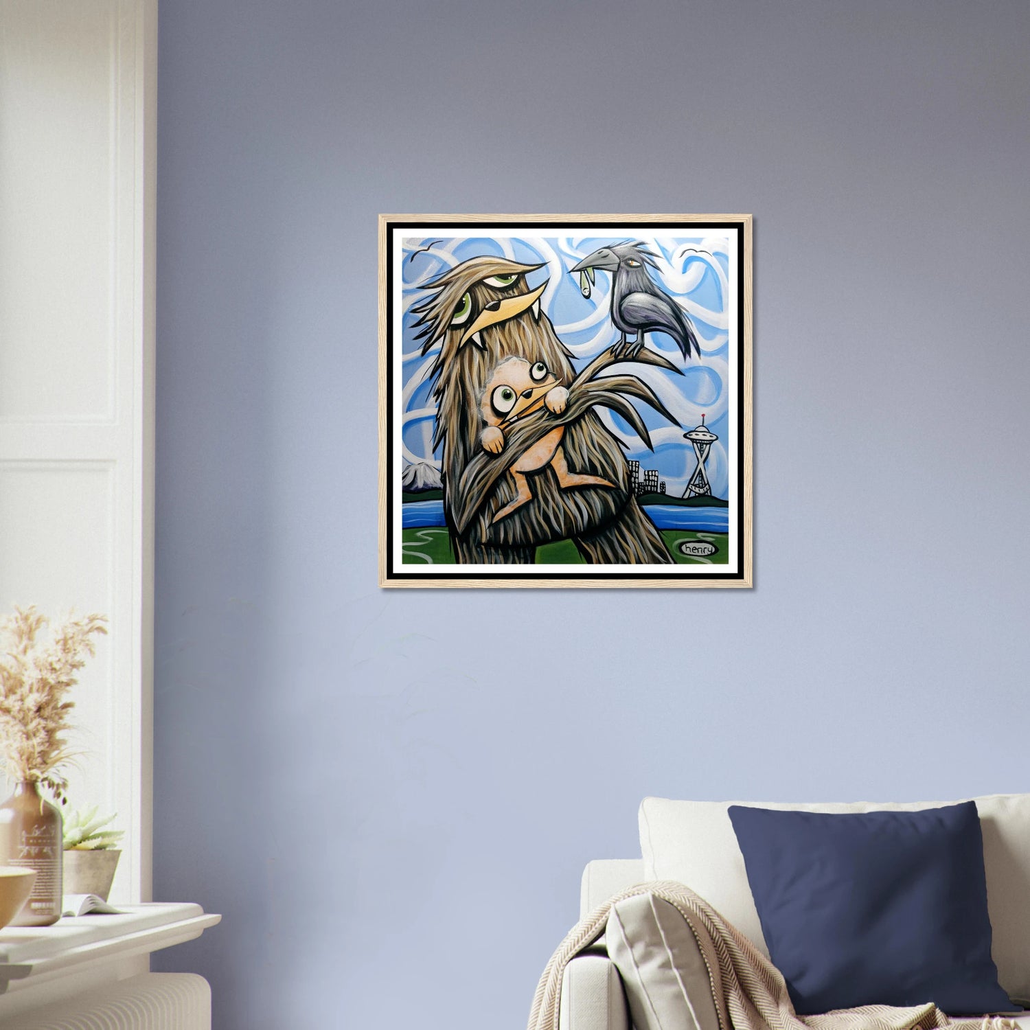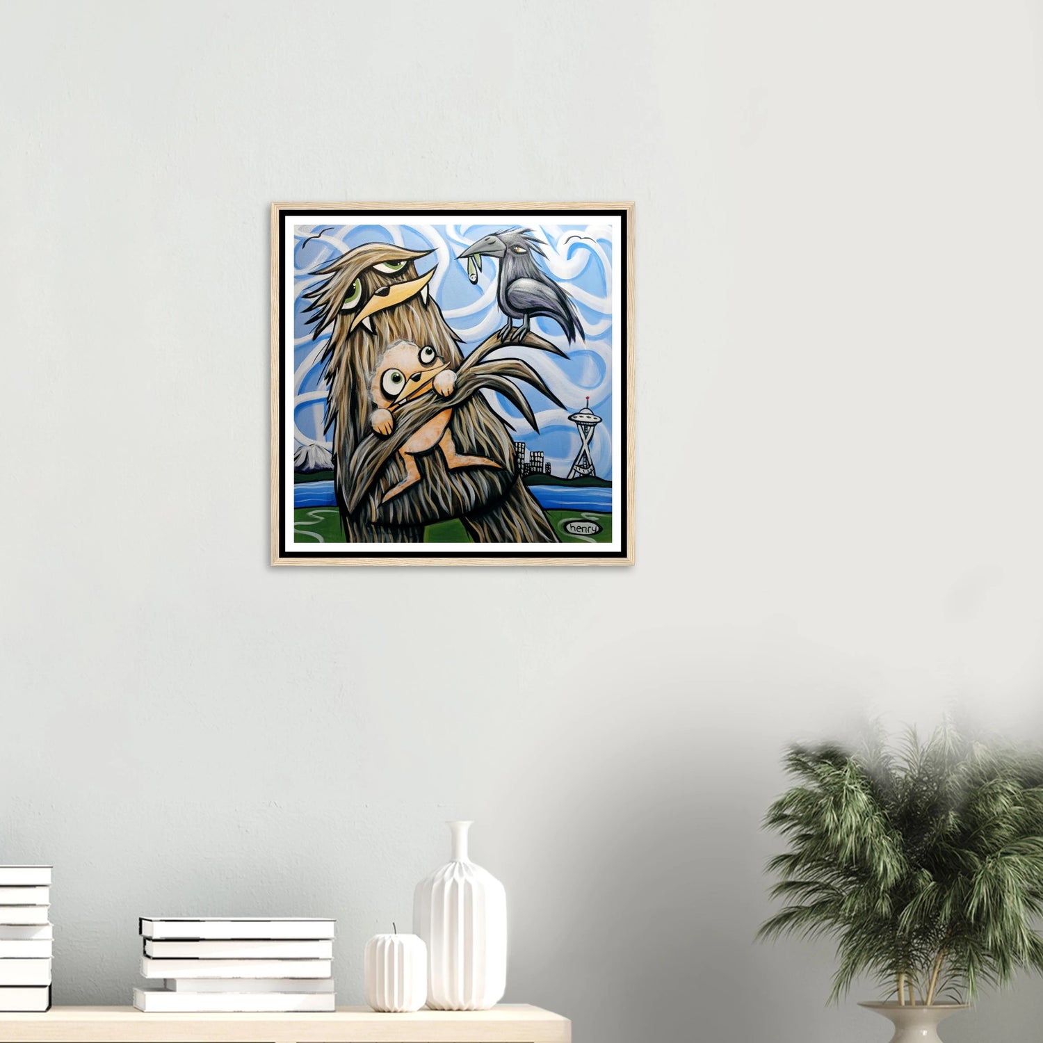 Sasquatch Dad and Hungry Crow - Mounted Framed Poster