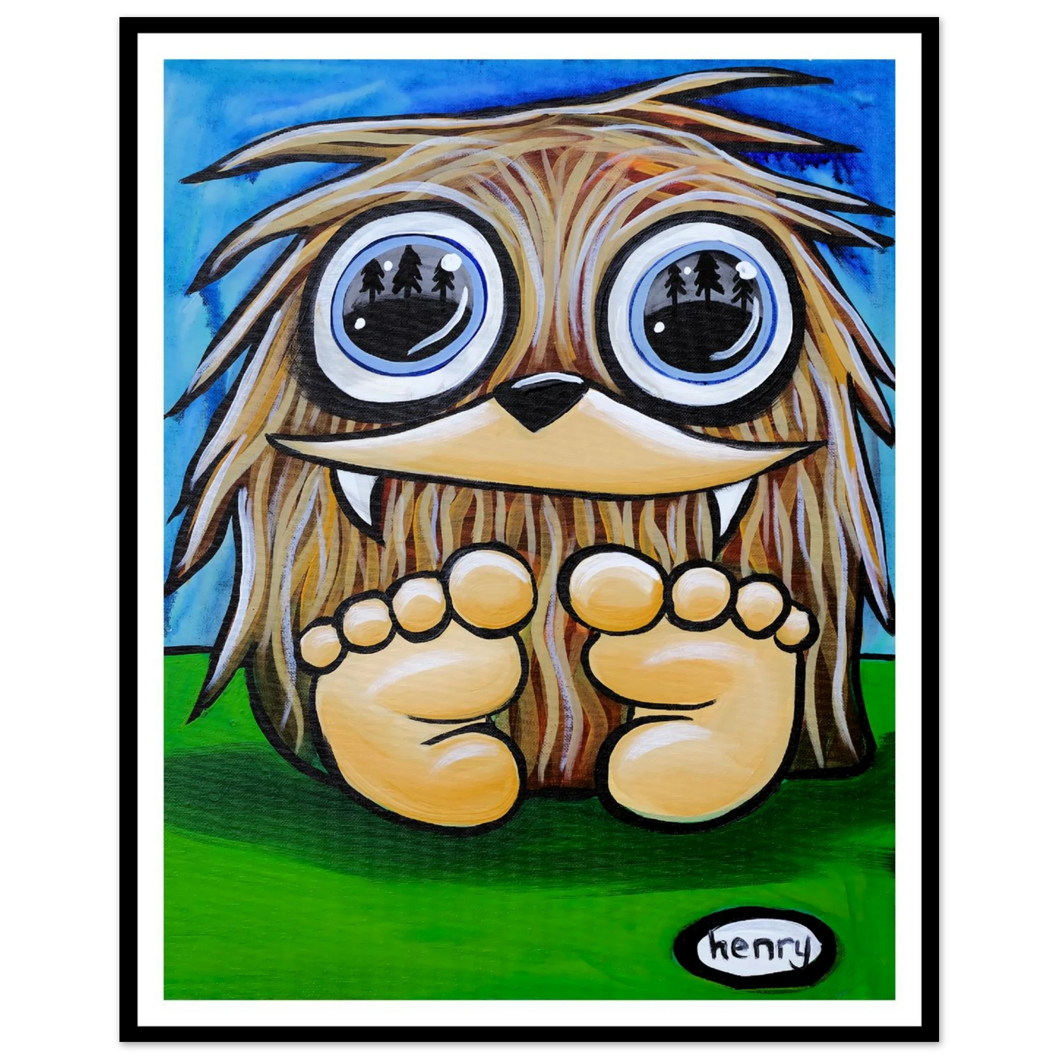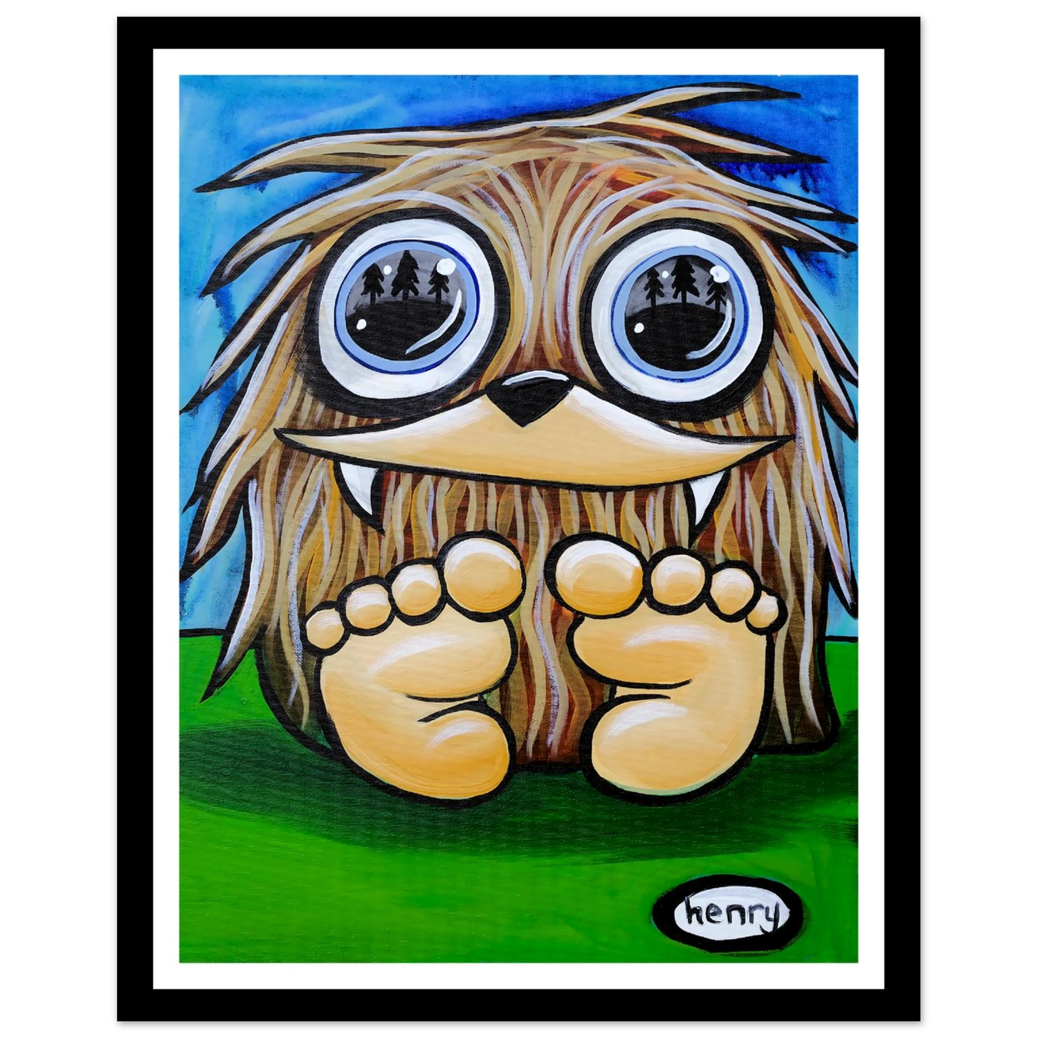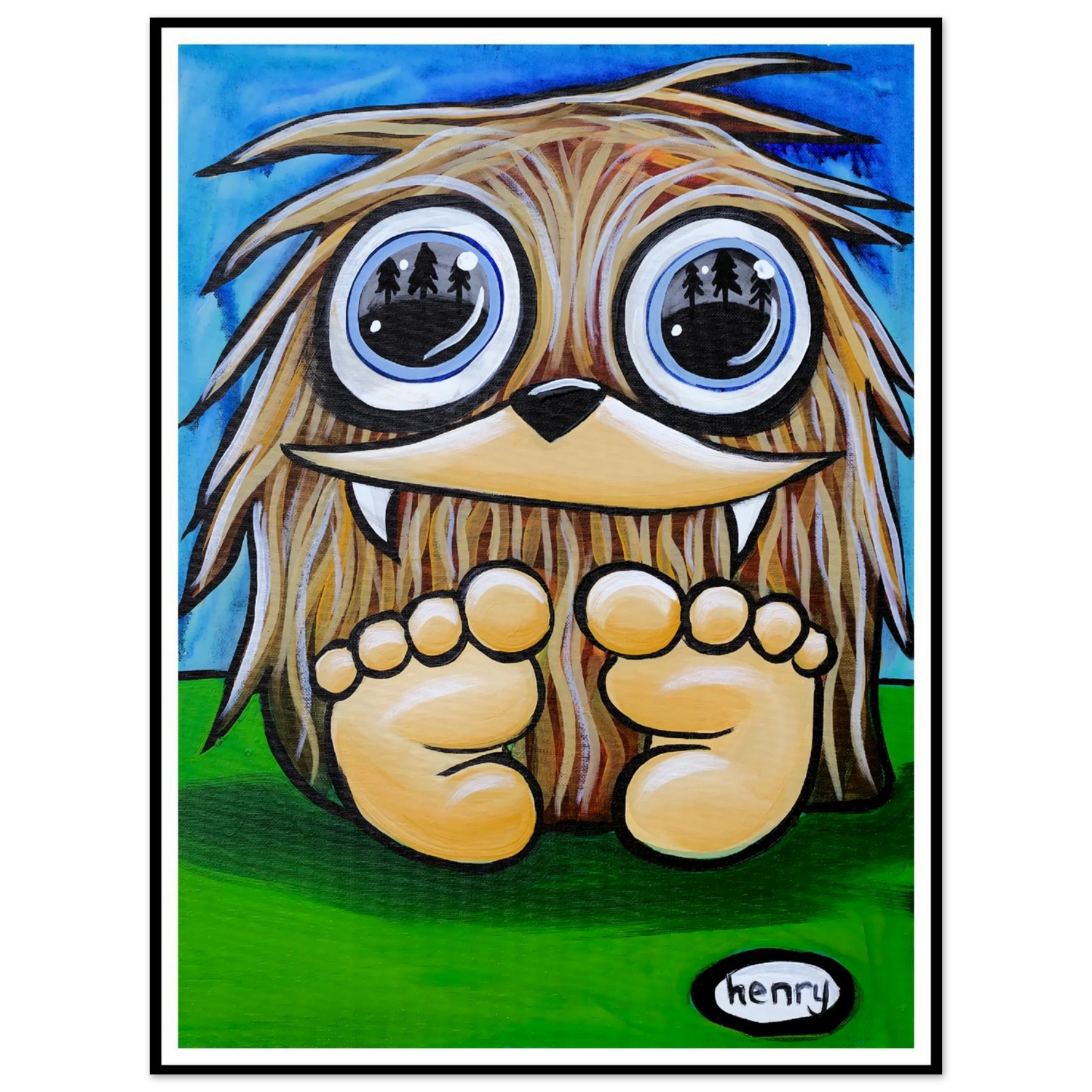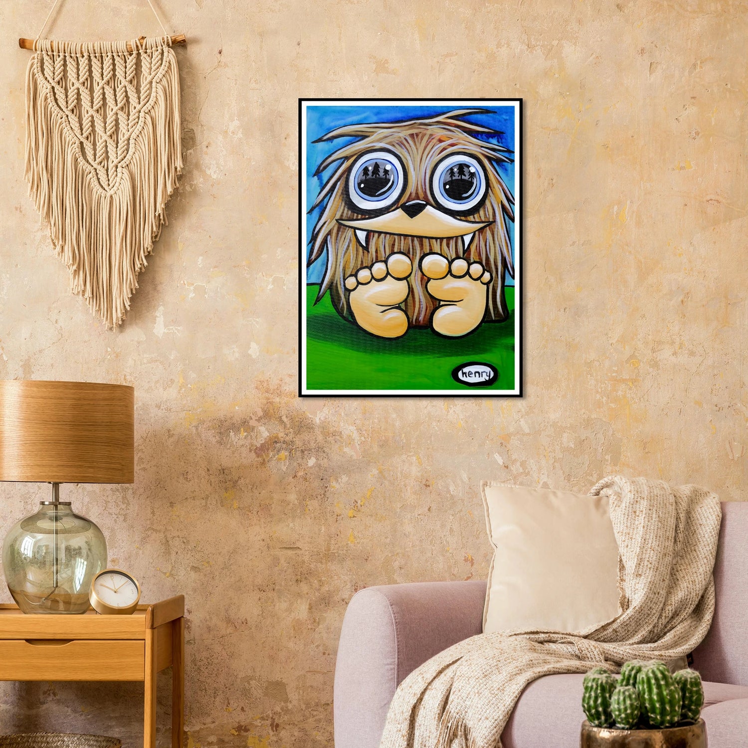 This poster is perfect for creating a whimsical atmosphere in a nursery, child's room, or even a cozy reading nook. The charming blend of the Baby Sasquatch and the trees depicted in its eyes will spark imaginations and create a focal piece that inspires wonder.
