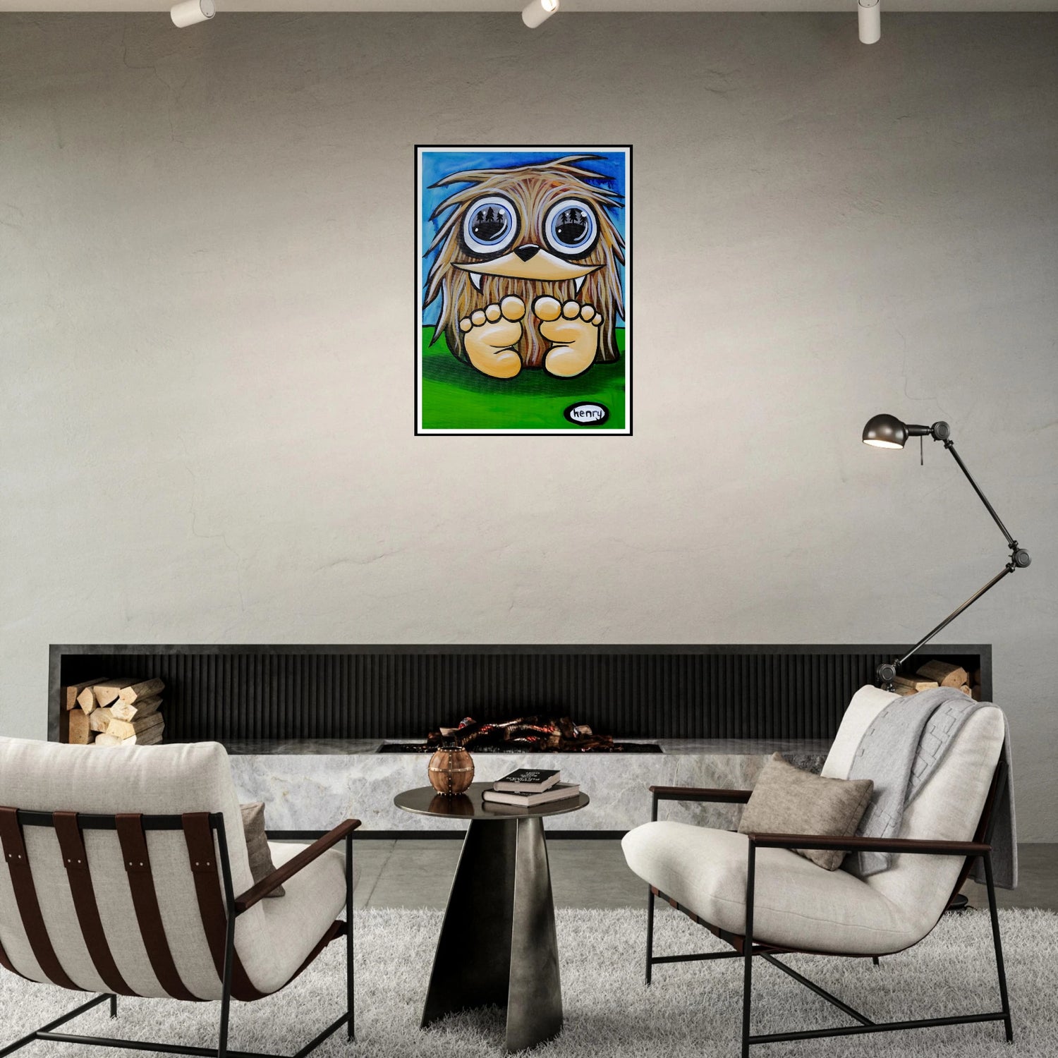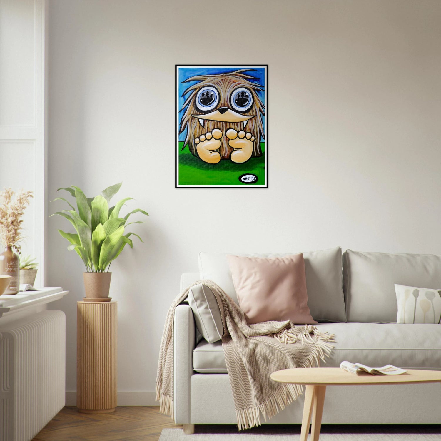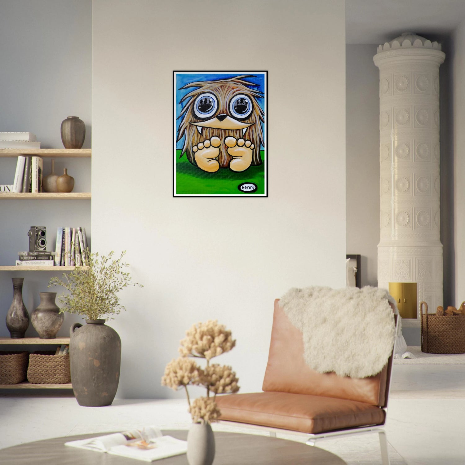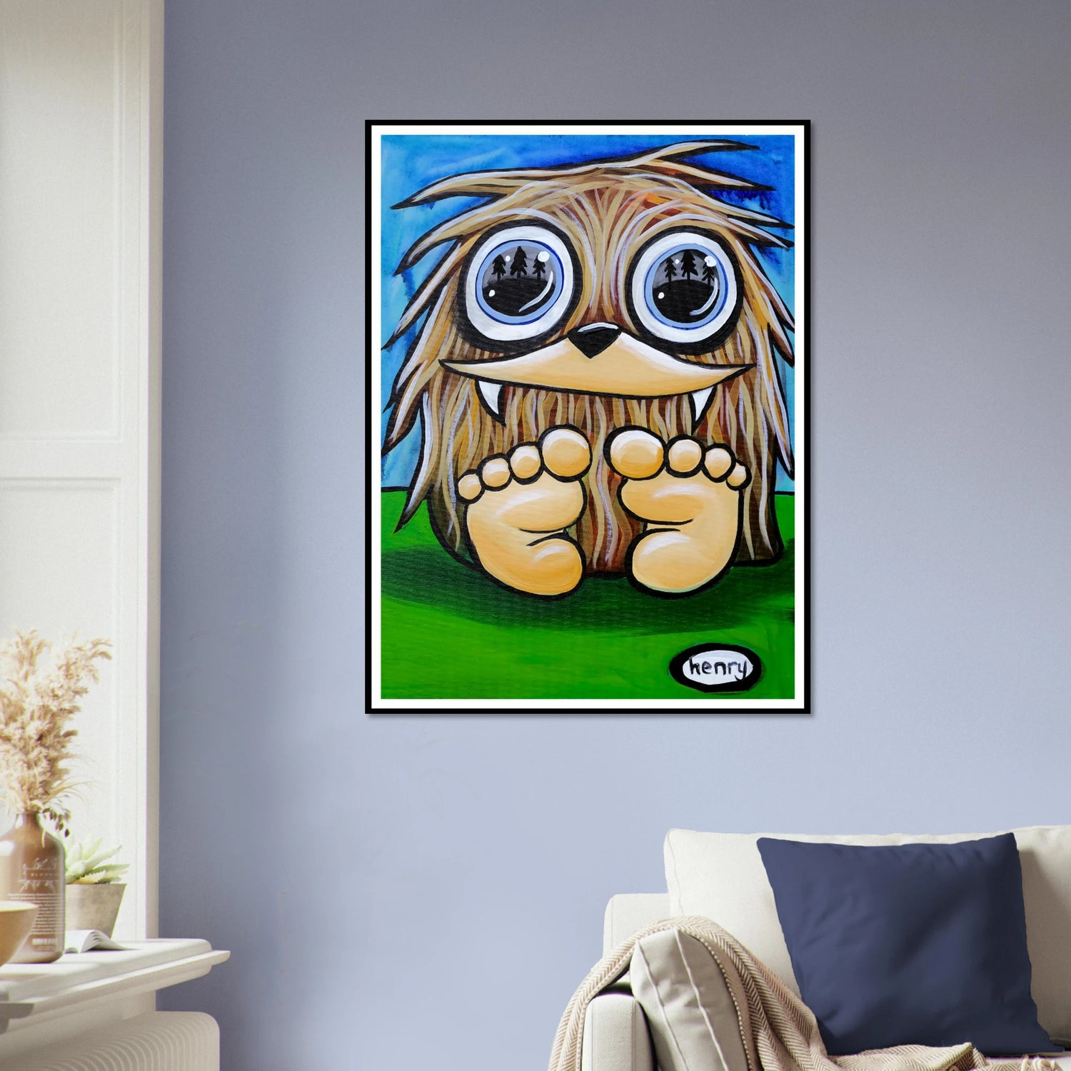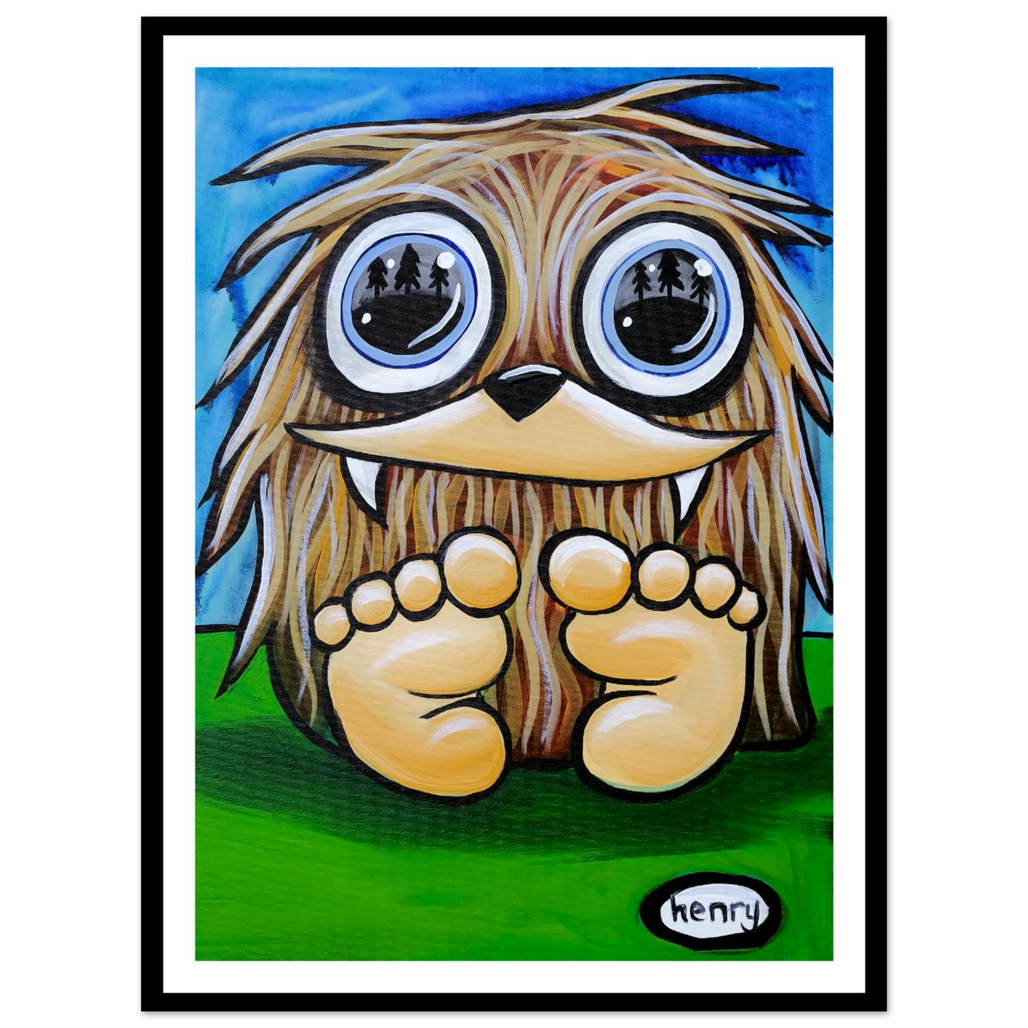 This poster is perfect for creating a whimsical atmosphere in a nursery, child's room, or even a cozy reading nook. The charming blend of the Baby Sasquatch and the trees depicted in its eyes will spark imaginations and create a focal piece that inspires wonder.