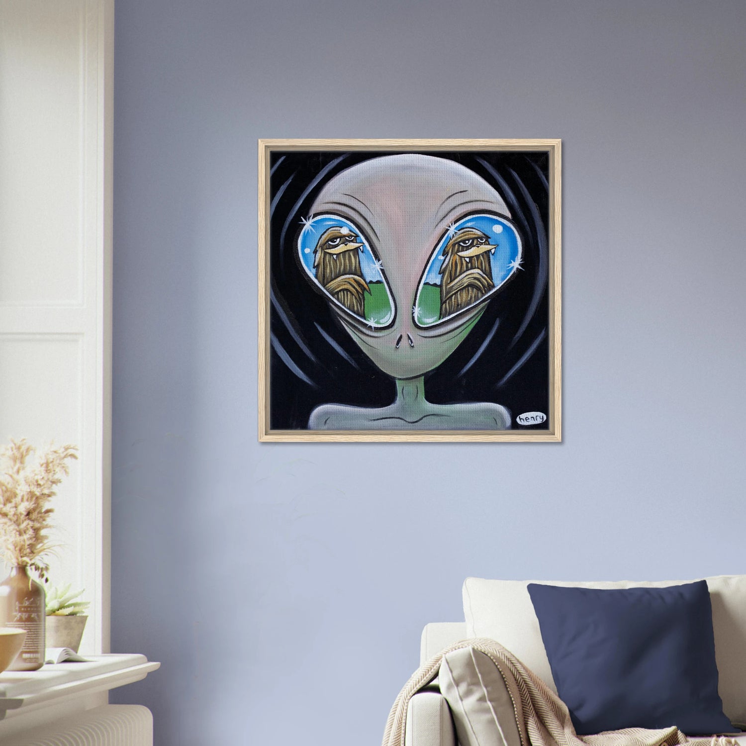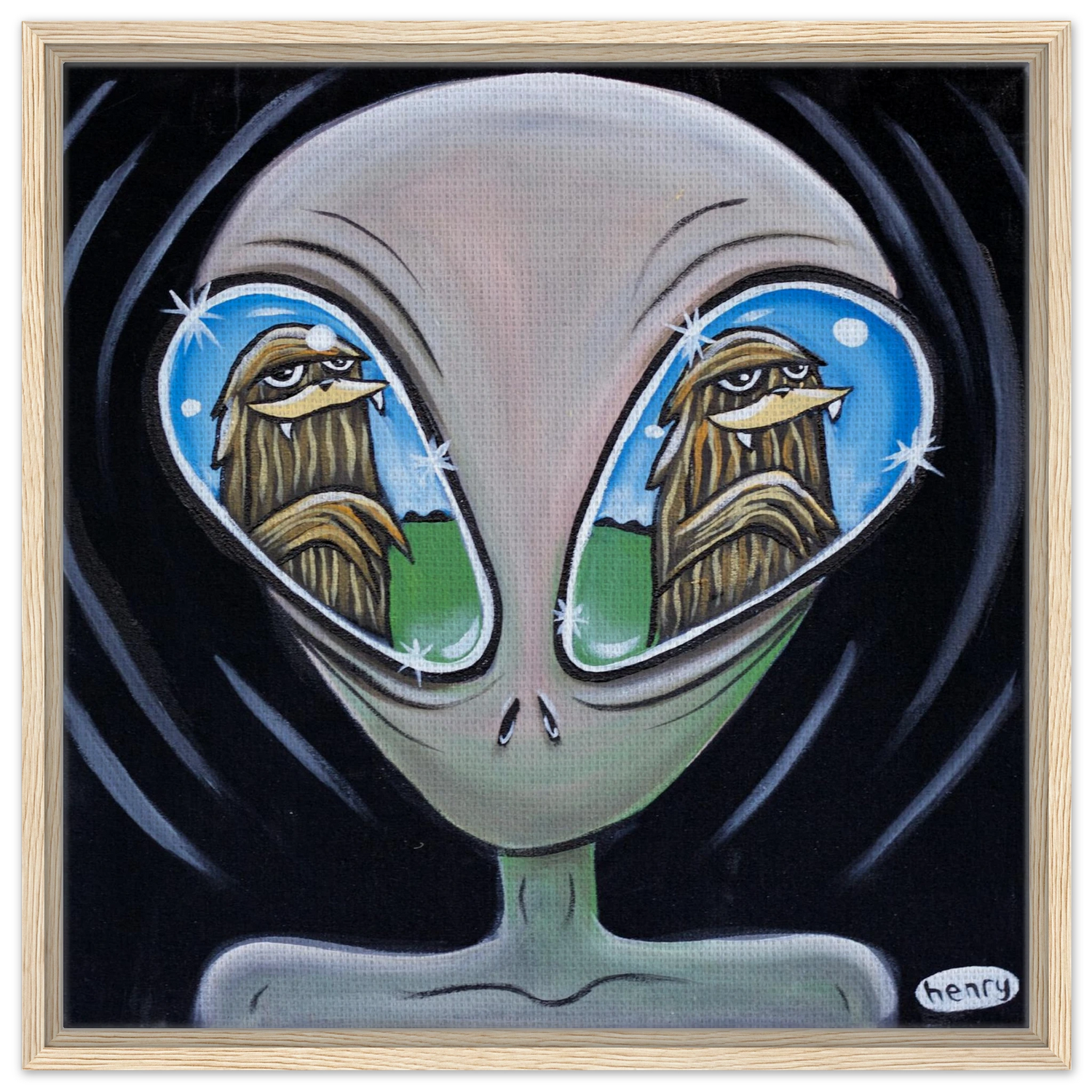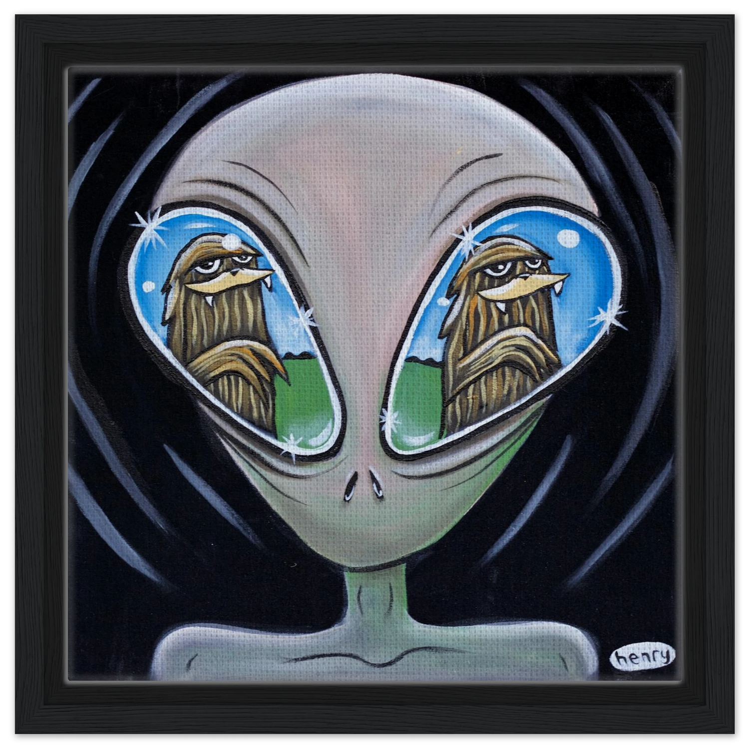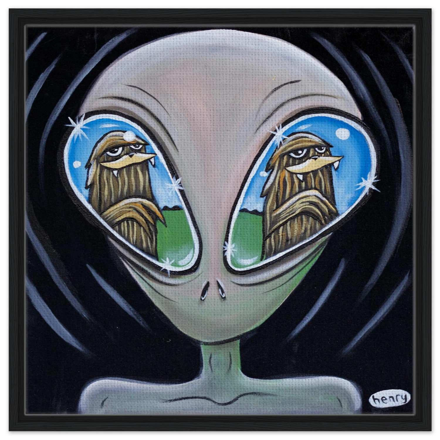 Alien Eyeing Sasquatch - Framed Canvas Print