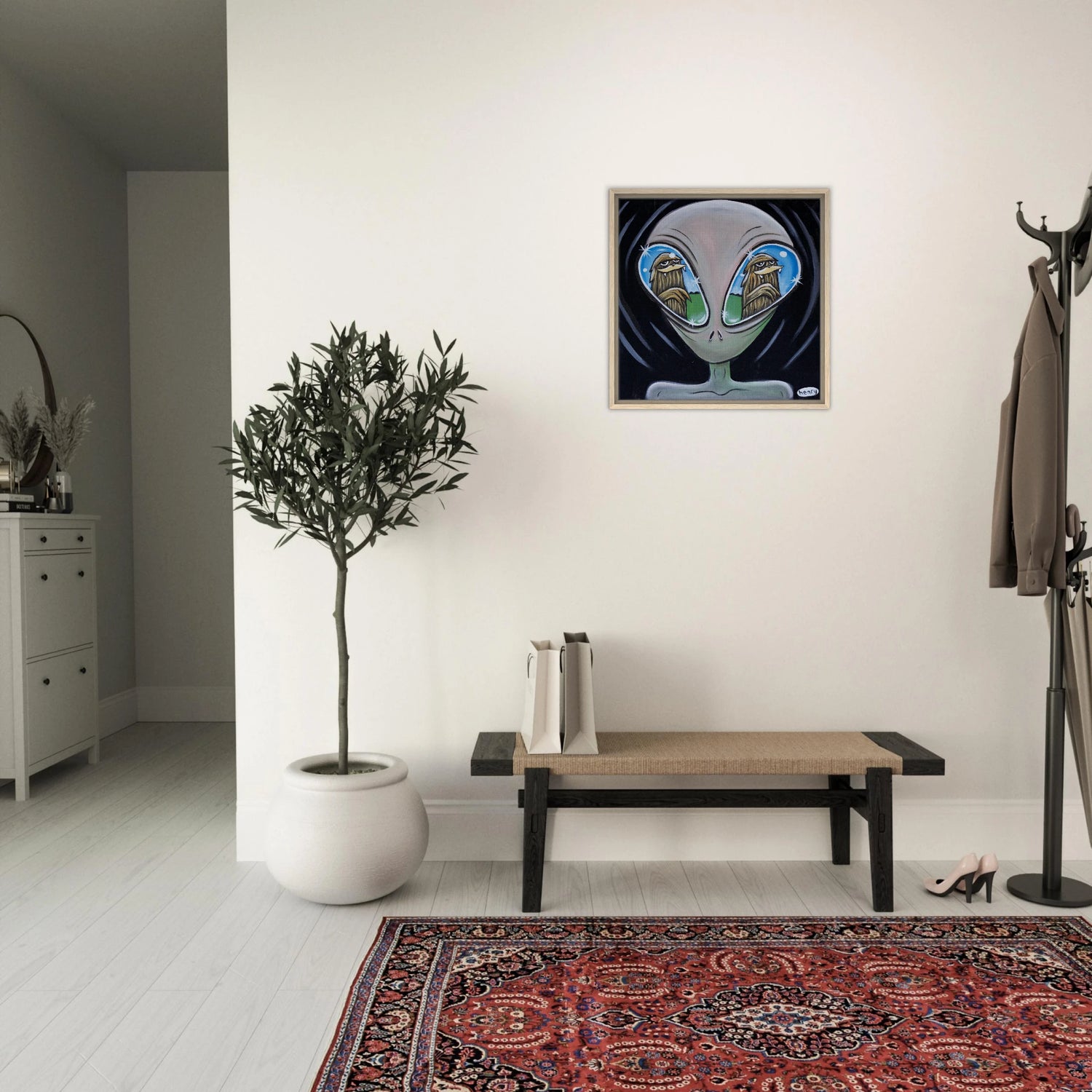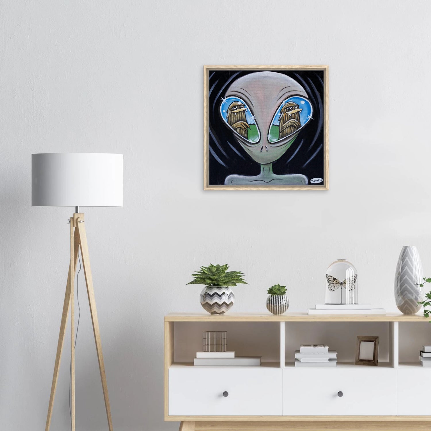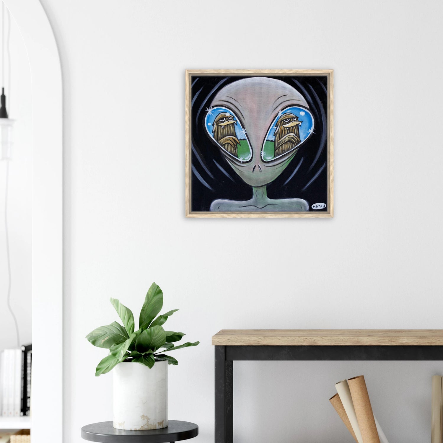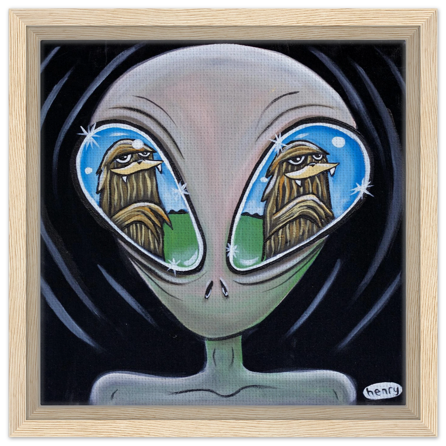 Alien Eyeing Sasquatch - Framed Canvas Print