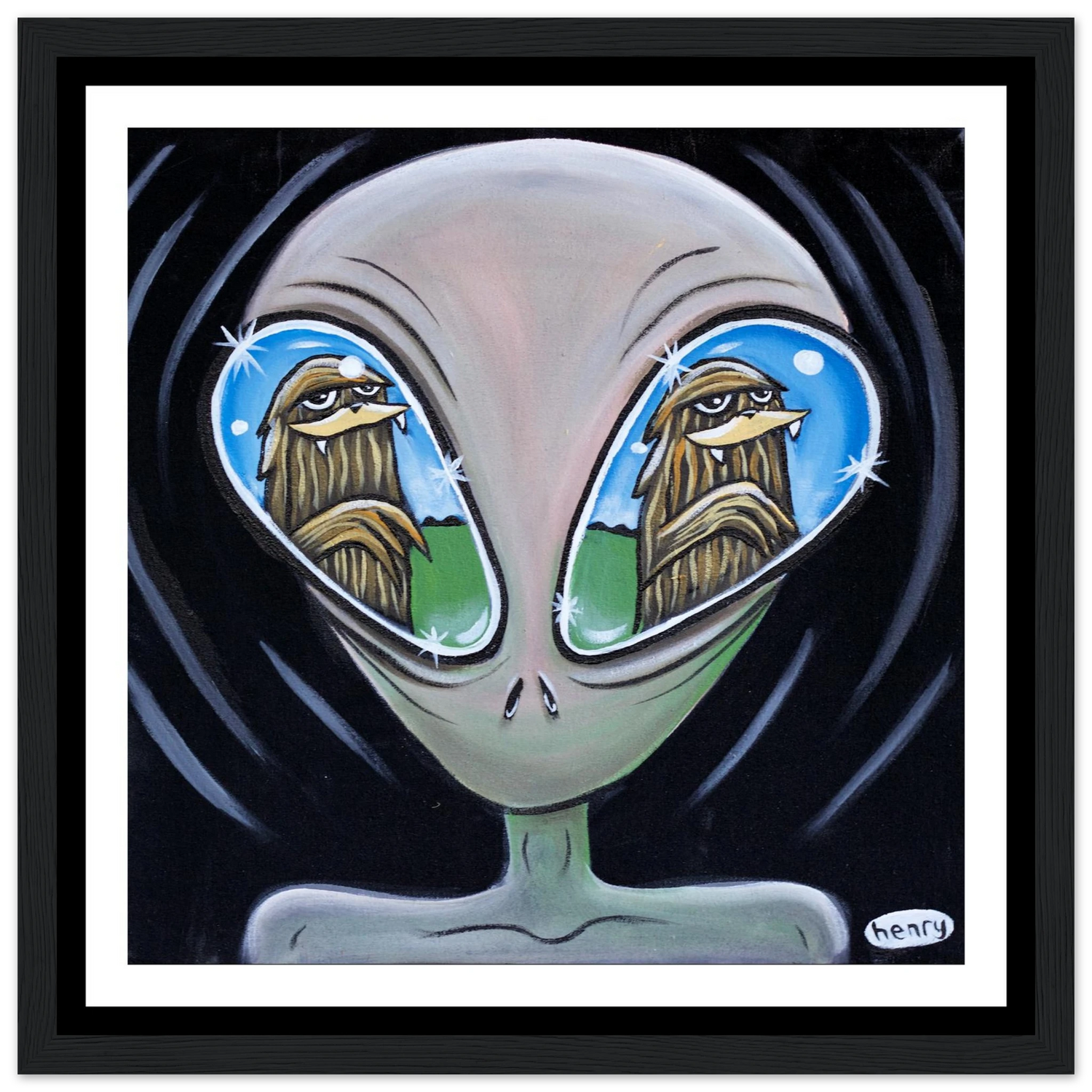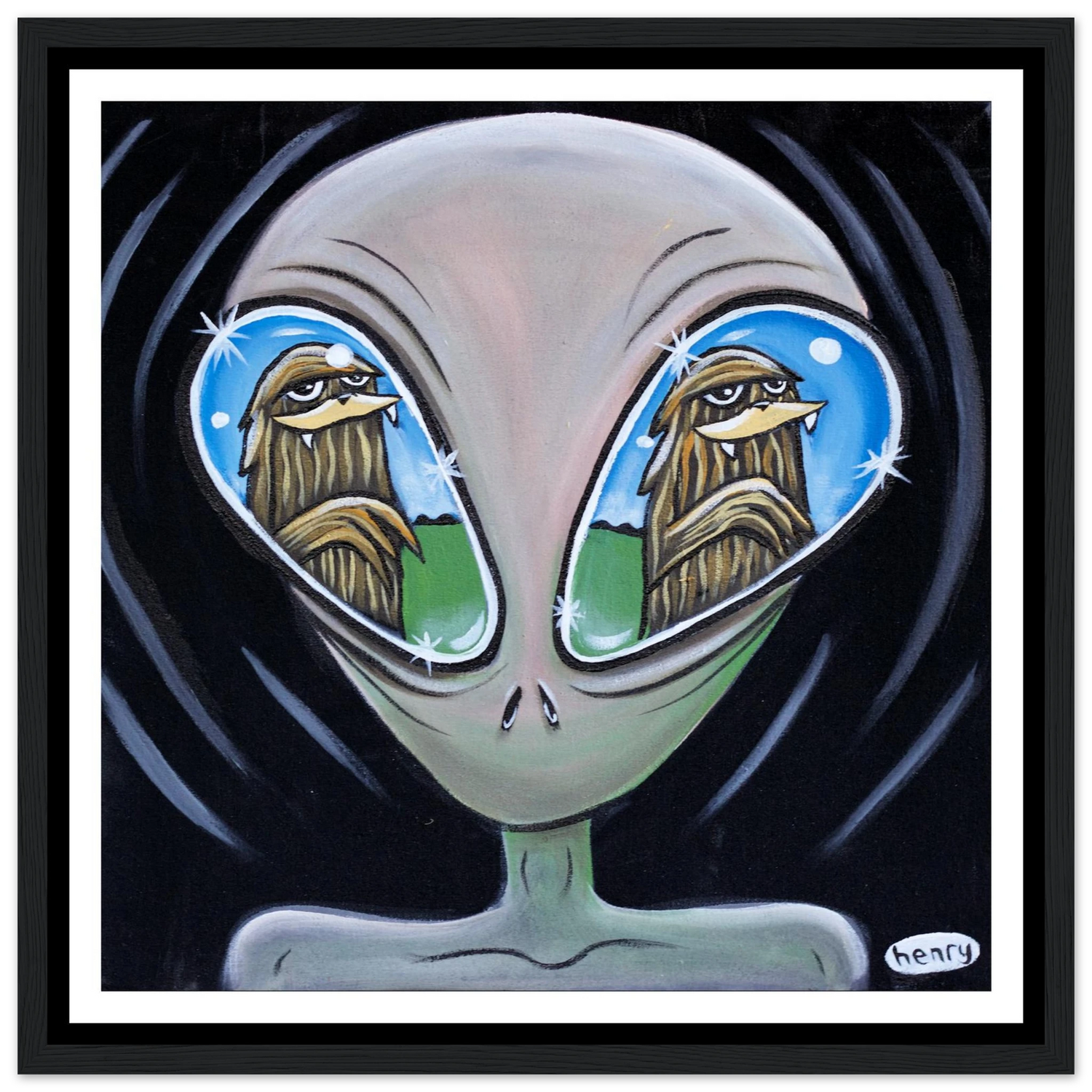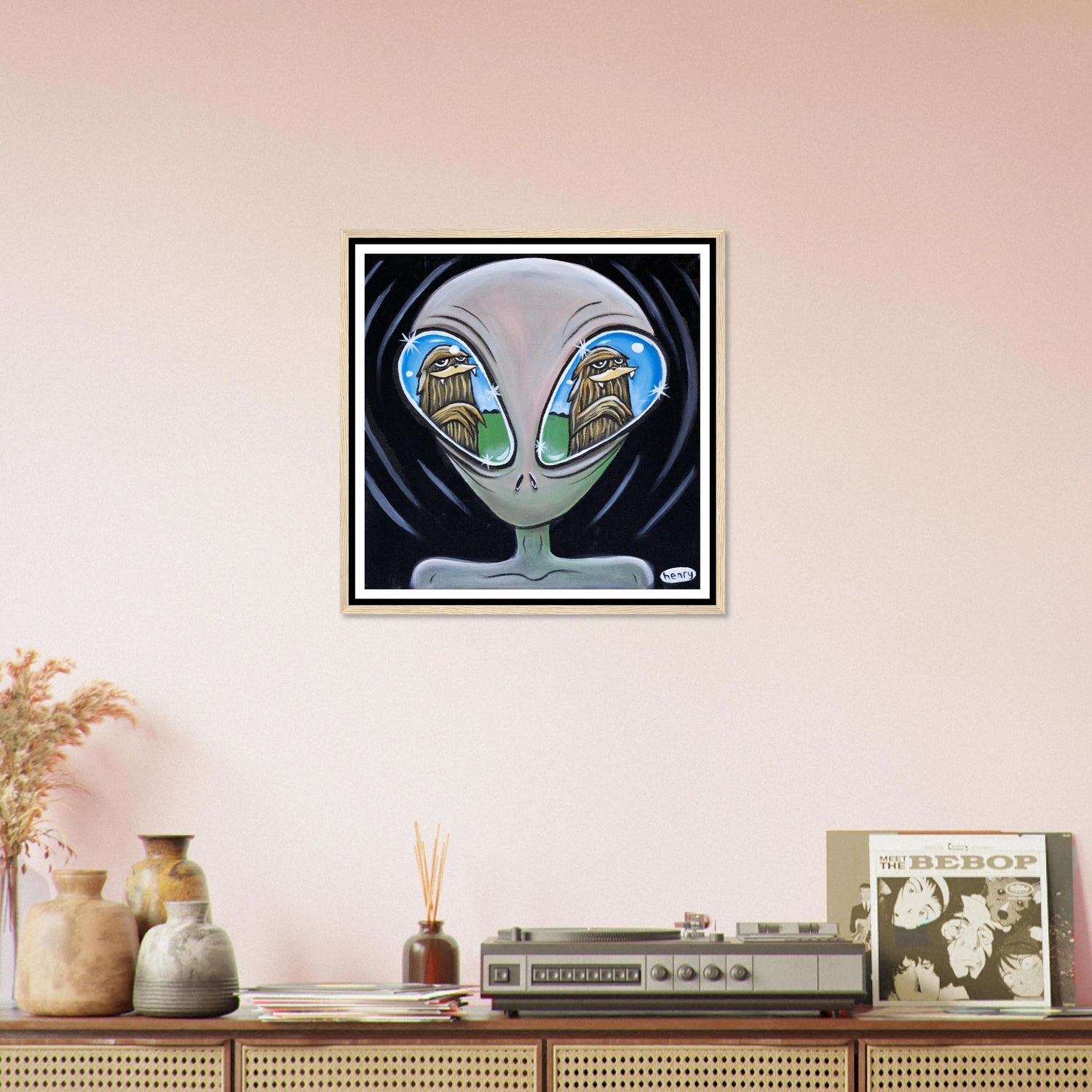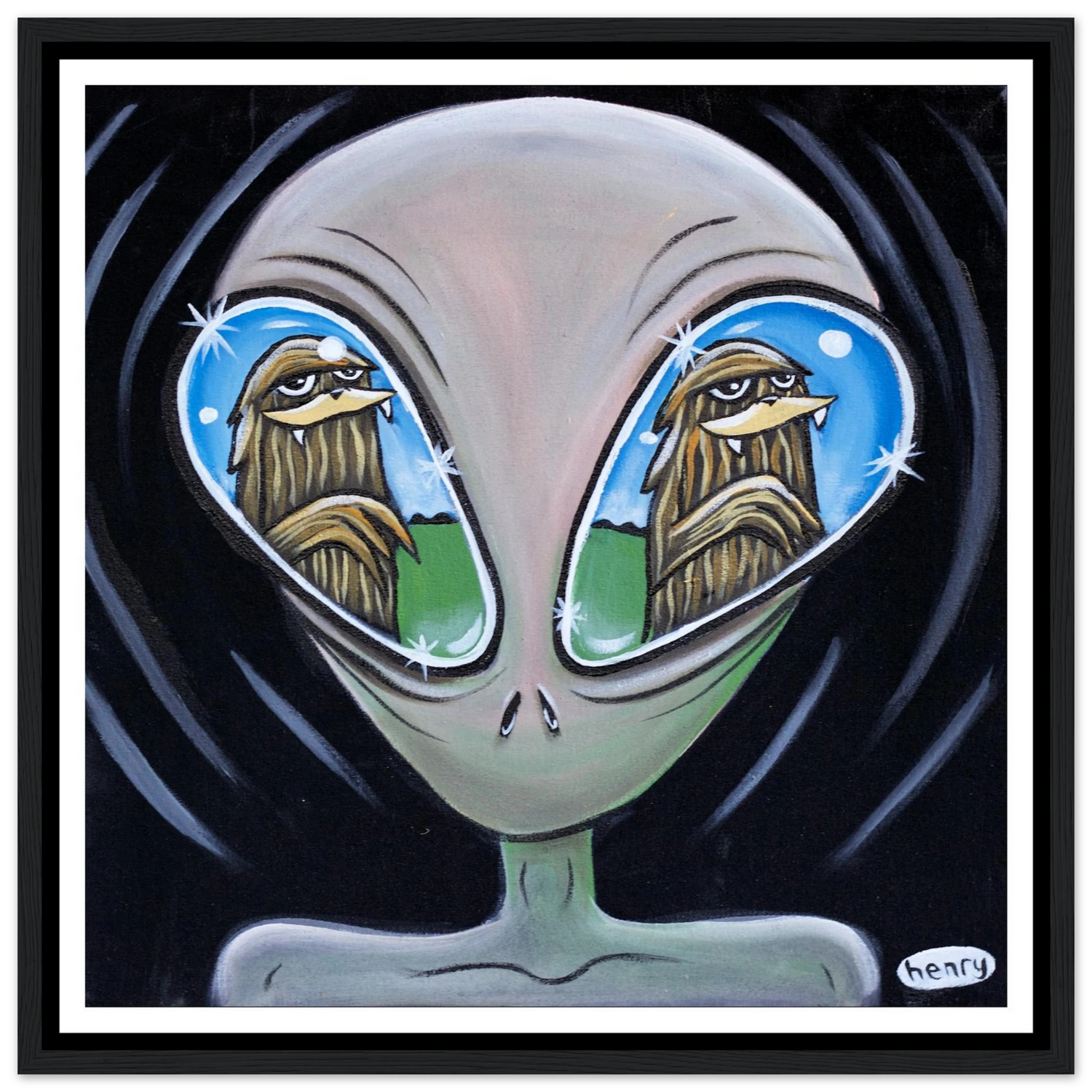 Alien Eyeing Sasquatch - Mounted Framed Poster
