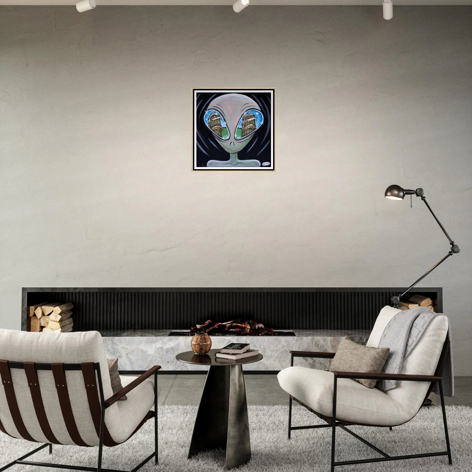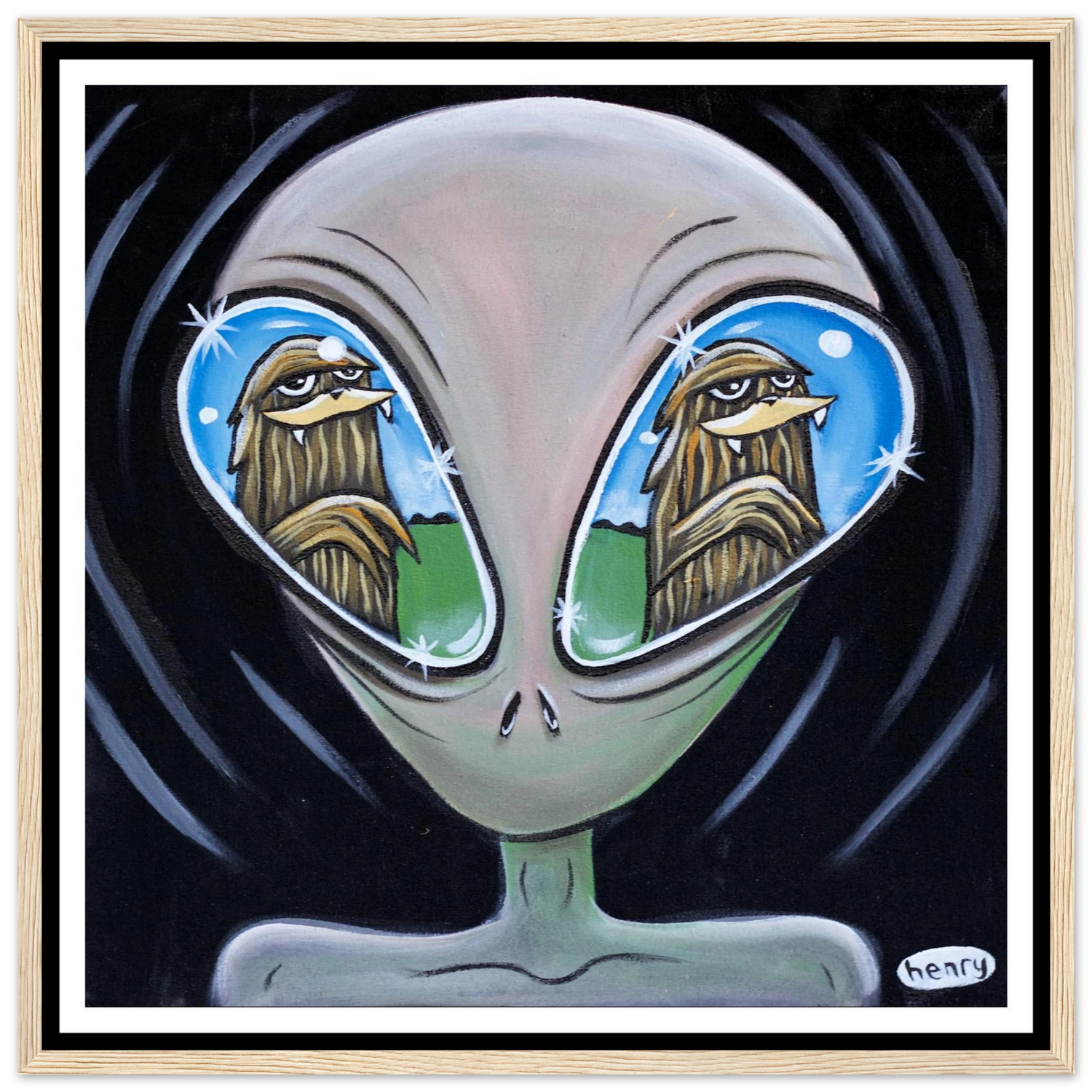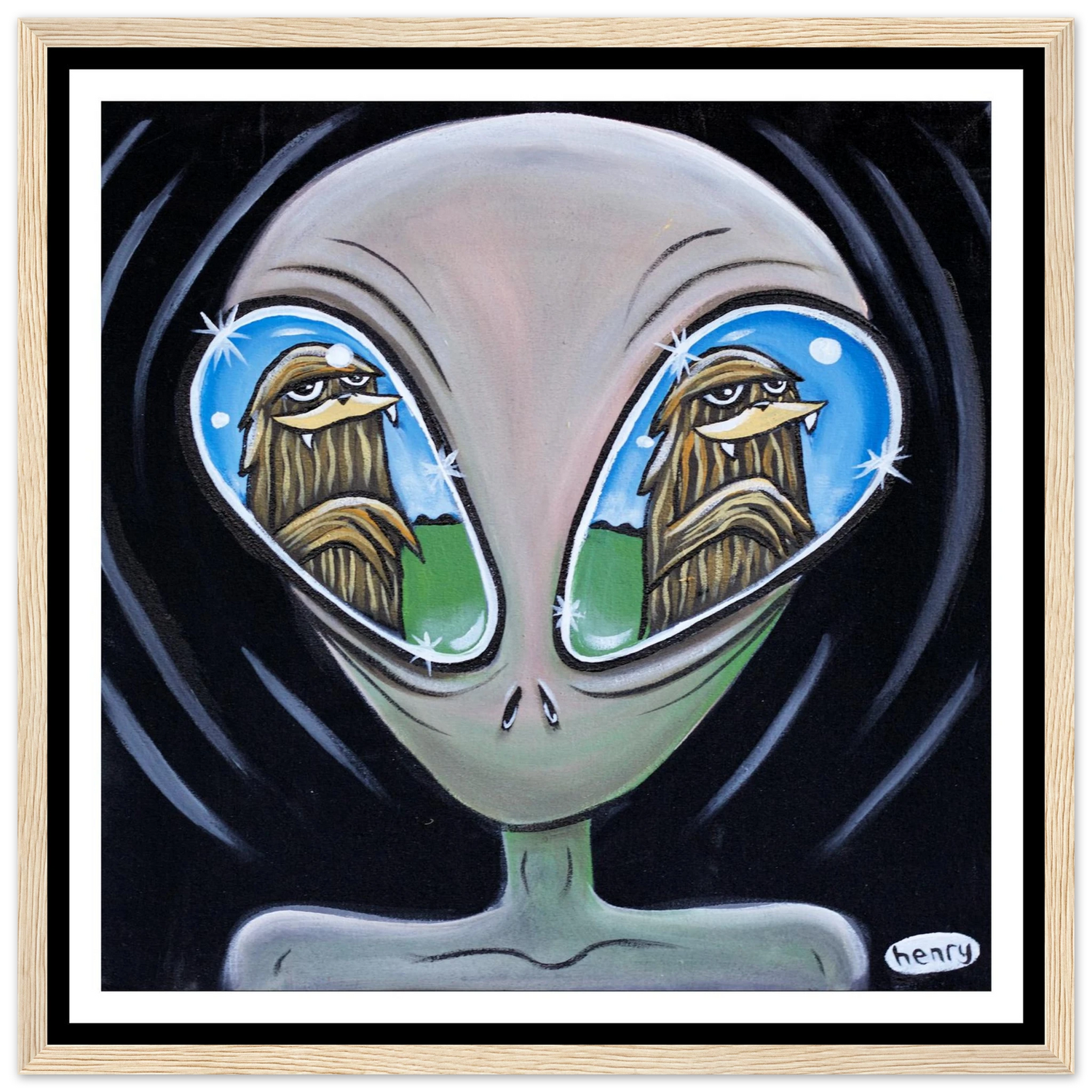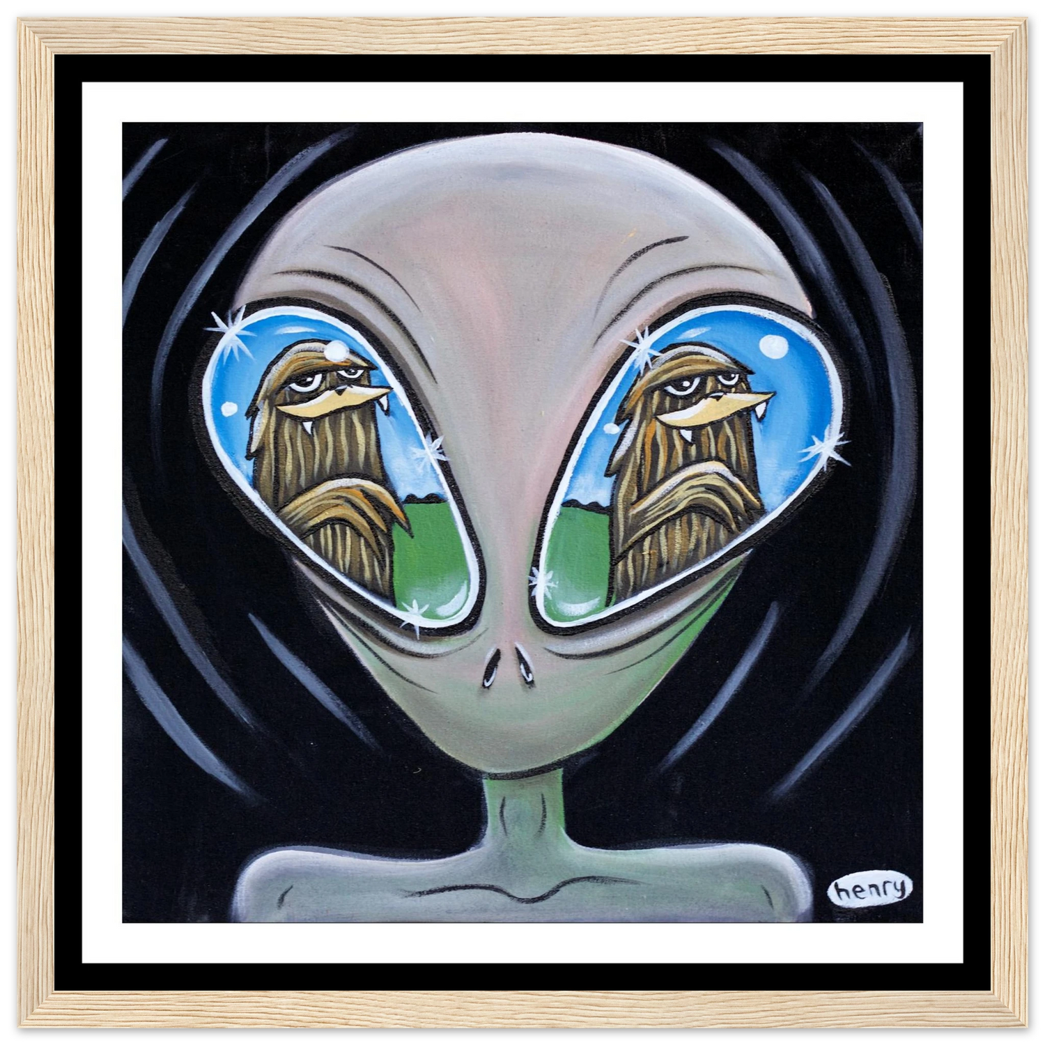 Alien Eyeing Sasquatch - Mounted Framed Poster